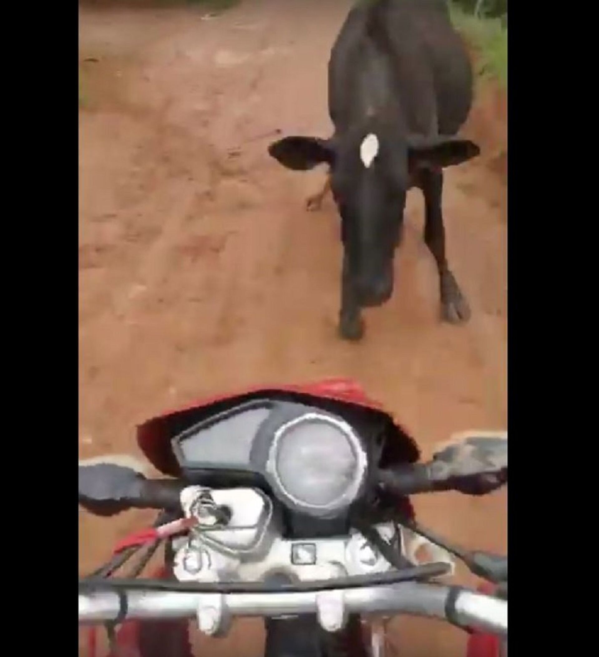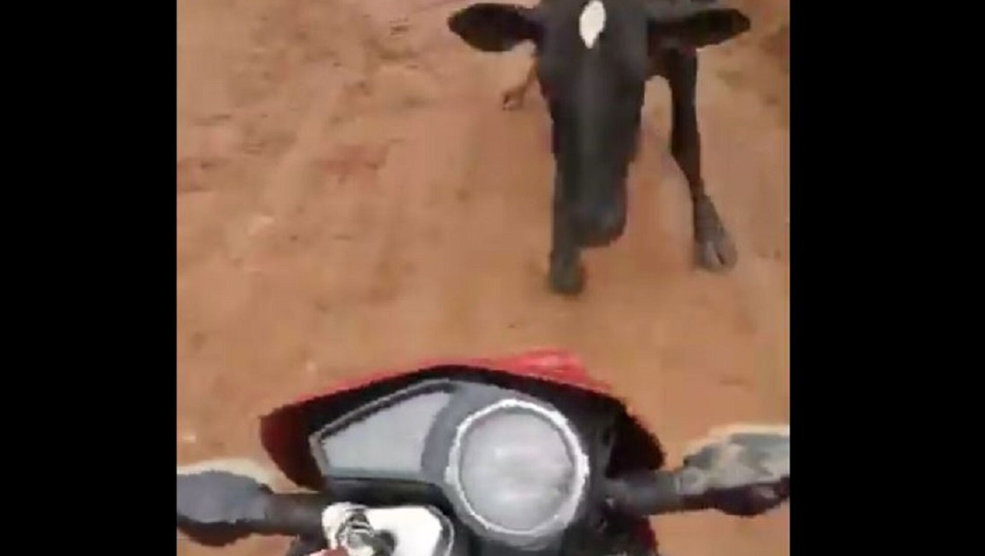 ويظهر مقطع الفيديو شاب يقود دراجته النارية وسط طريق مليء بالمزروعات، ليتفاجأ بخروج ثور أمامه، ولحسن الحظ فر الثور بعد سقوط الدراجة.
