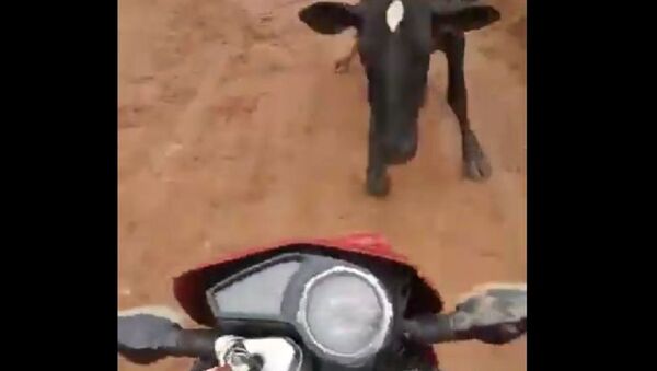 قليل حظ... ثور هائج يهجم على سائق دراجة نارية (فيديو)