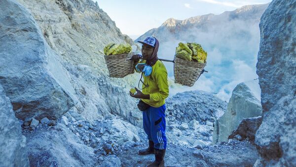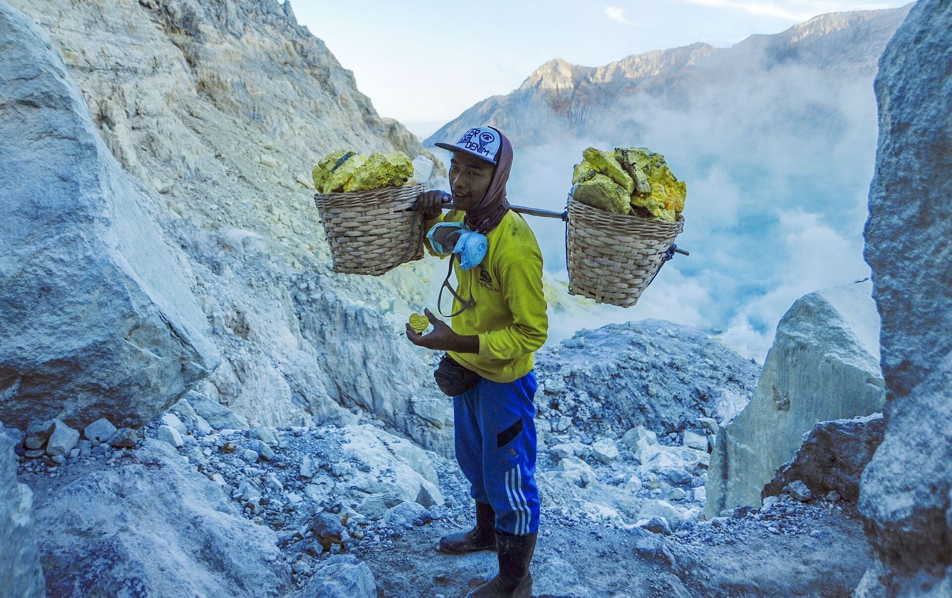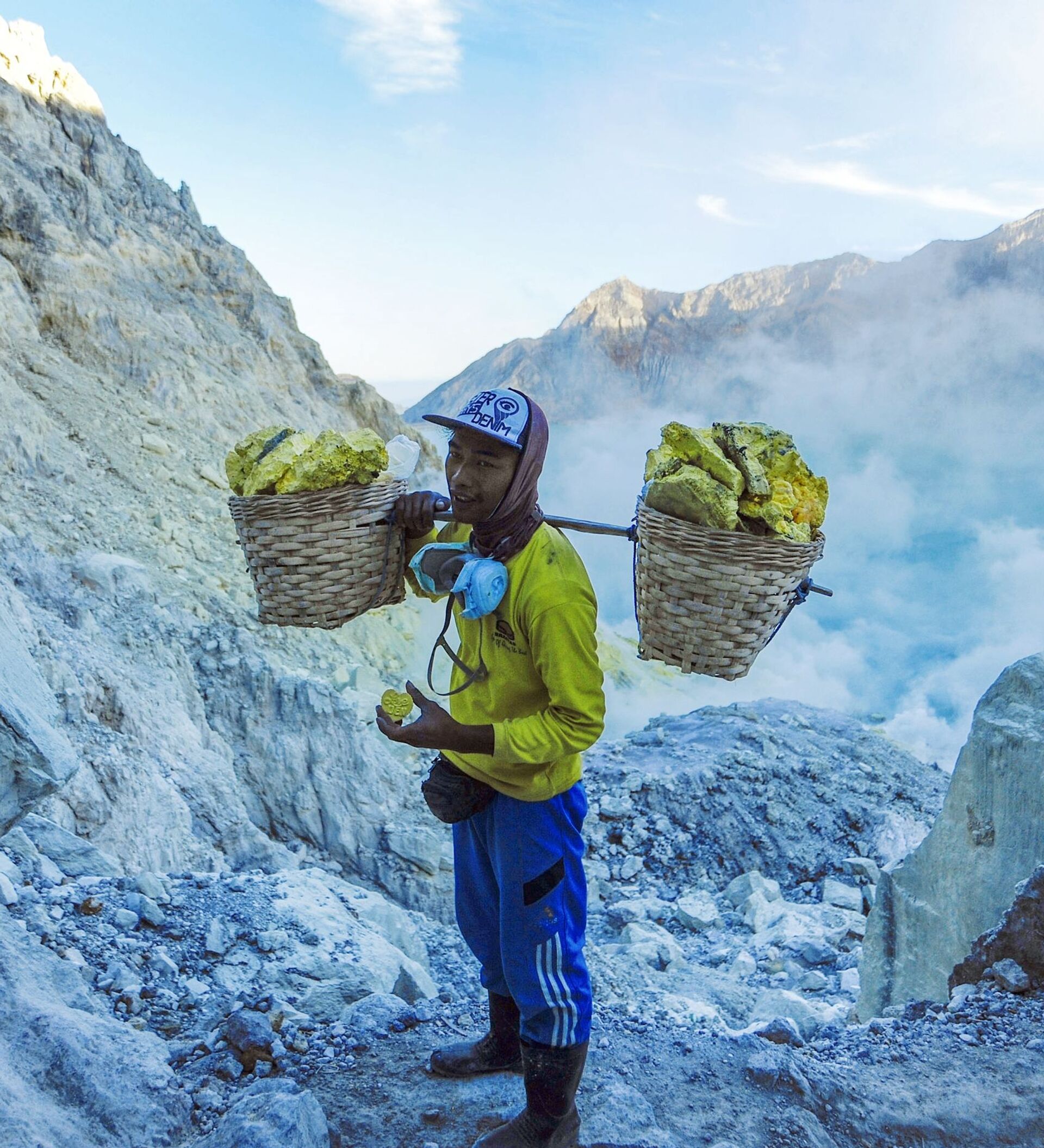 عامل منجم ينقل سلال الكبريت الصلب من مقلع يقع على البركان النشط كواه آيجن (Kawah Ijen) في إندونيسيا. يسود الفقر في المنطقة، والعمال ليس لديهم ملابس خاصة لهذه الوظيفة، ومتوسط الأجور، يتراوح بين 7-8 دولارات في اليوم. يقوم كل عامل منجم بنقل 75-90 كغم من الكبريت من المنجم في رحلة واحدة.