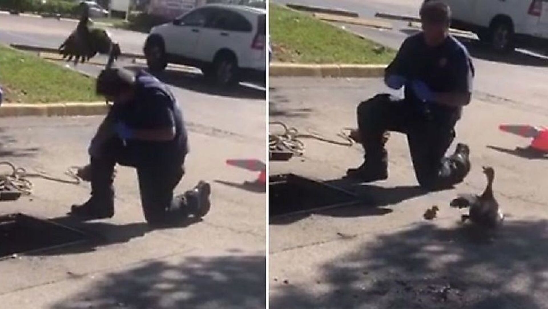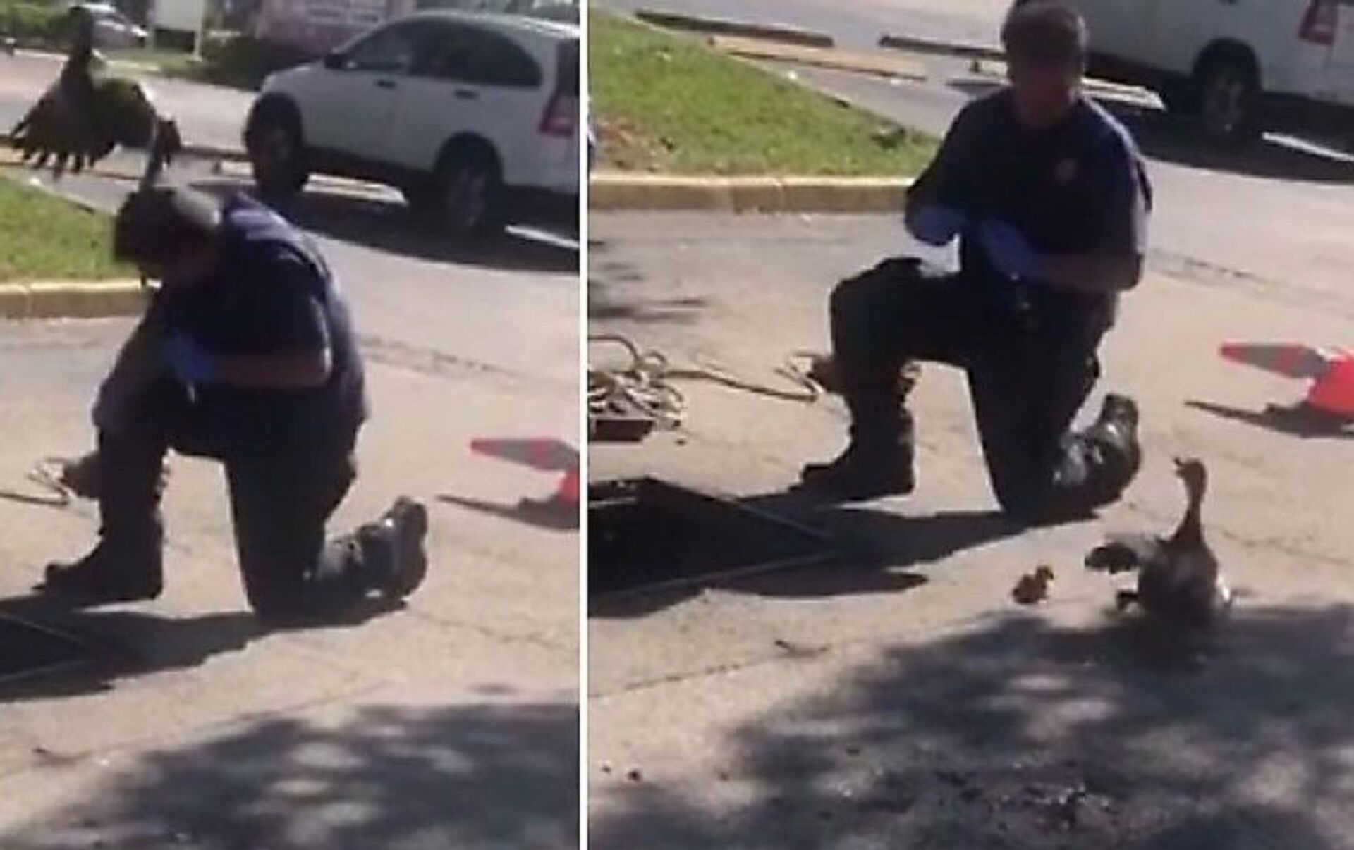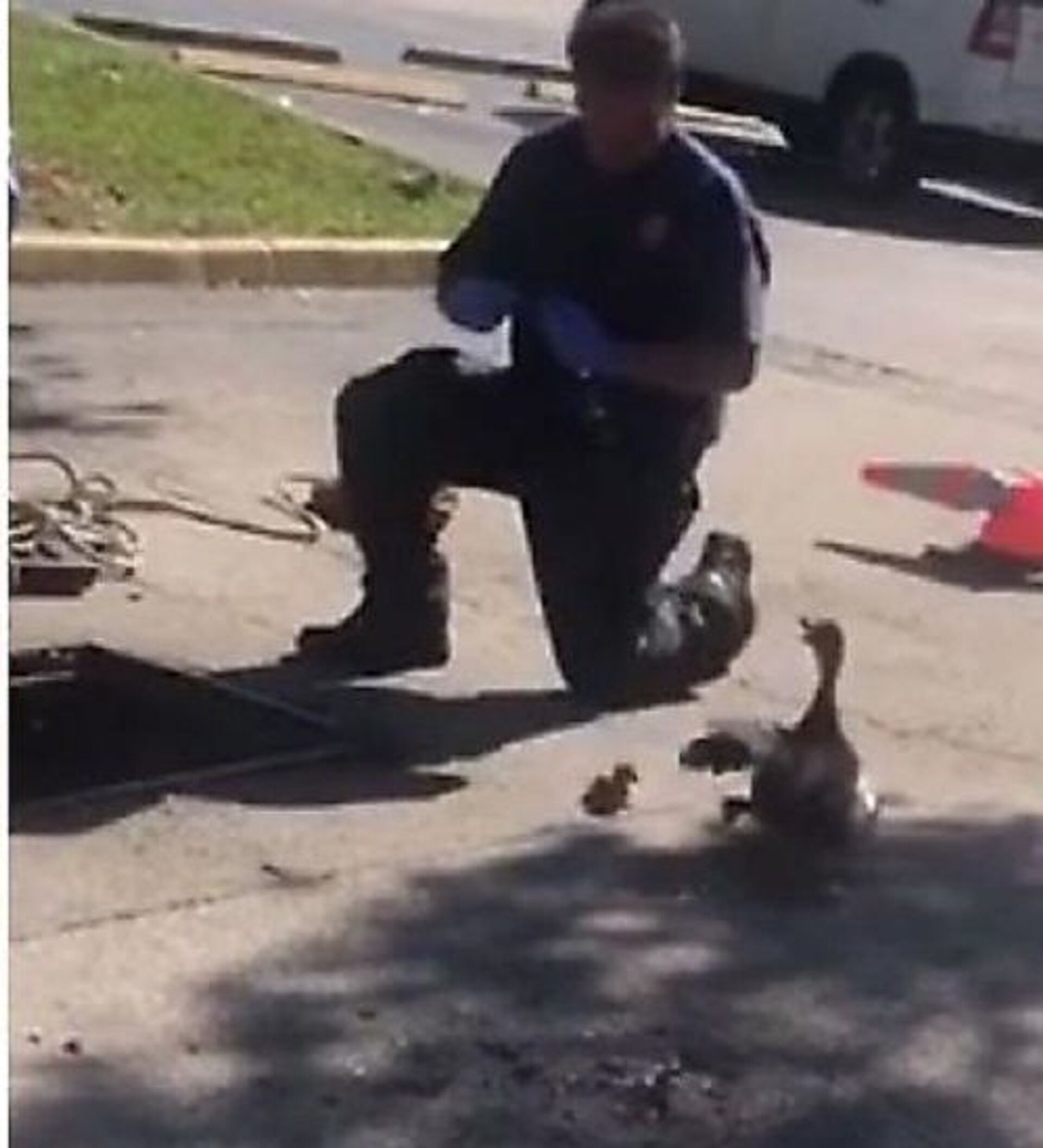 ويظهر الفيديو قيام رجل الإطفاء، جريج ماريرو، بإخراج فراخ البطة الصغار من حفرة للصرف الصحي كانوا قد وقعوا بداخلها.