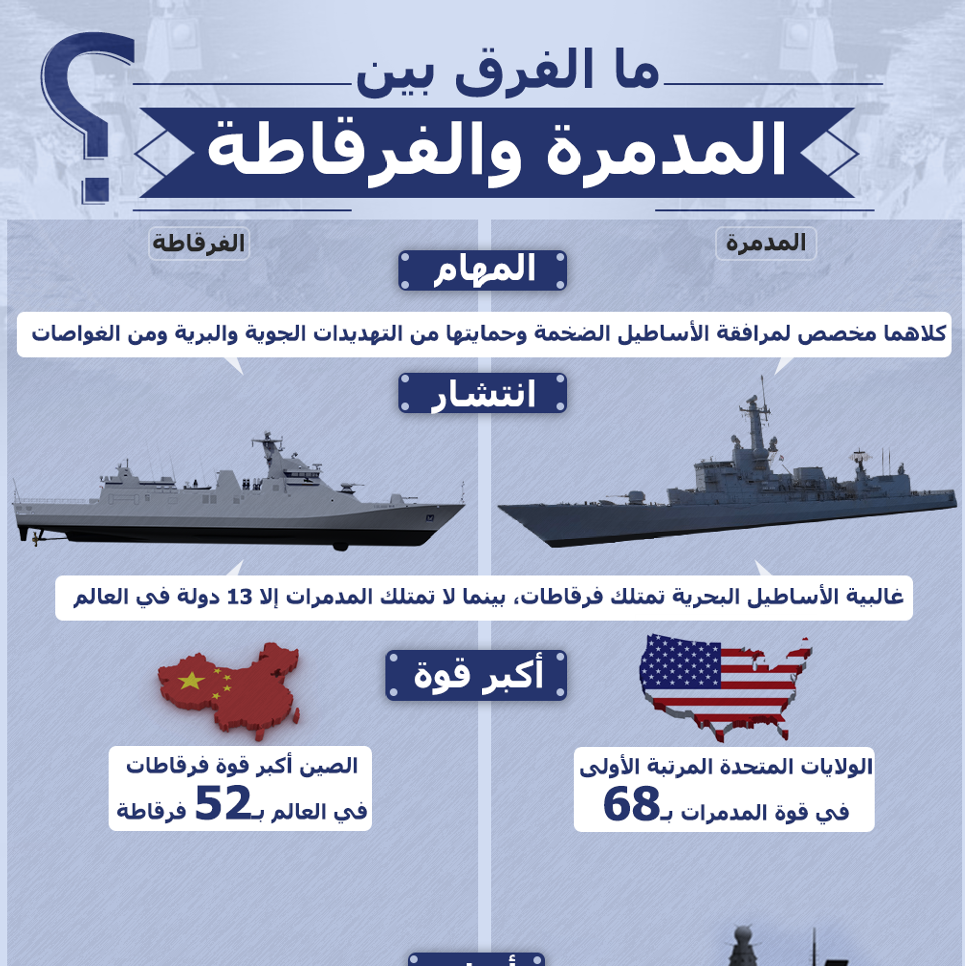 تمتلك الأساطيل البحرية، أنواع مختلفة من السفن الحربية، التي تختلف في الشكل والحجم، وفقا لقدرات ومهام كل منها، وأبرزها المدمرات والفرقاطات. 30.07.2019, سبوتنيك عربي