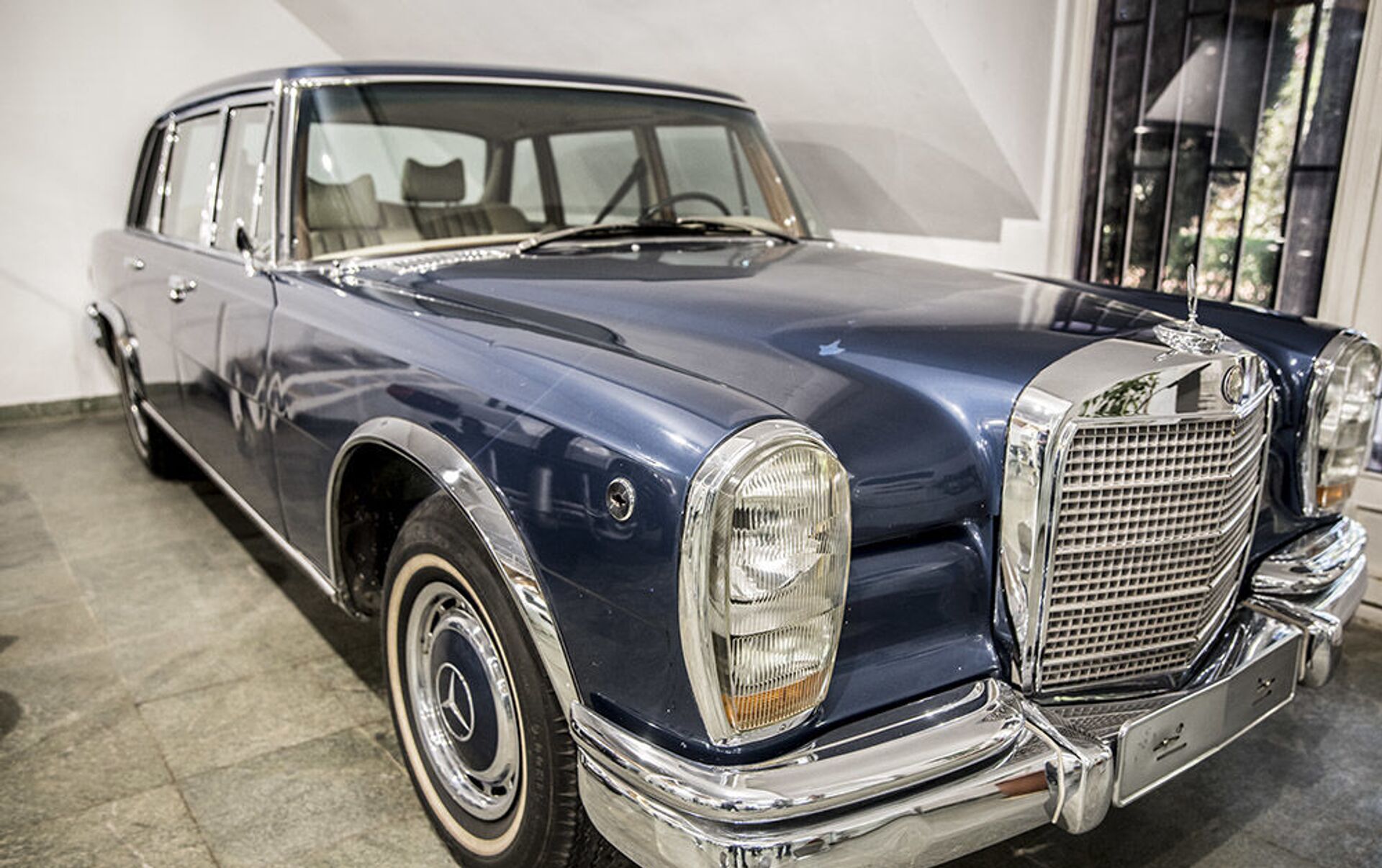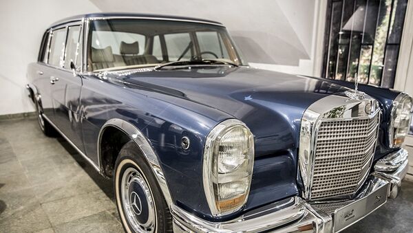 سيارة "مرسيدس بنز بولمان 600" (Mercedes Benz 600 Pullman) لآخر شاه إيراني، محمد رضا بهلوي، في متحف السيارات الملكية على أراضي مقر إقامة الشاه السابق في قصر سعد آباد في إيران.