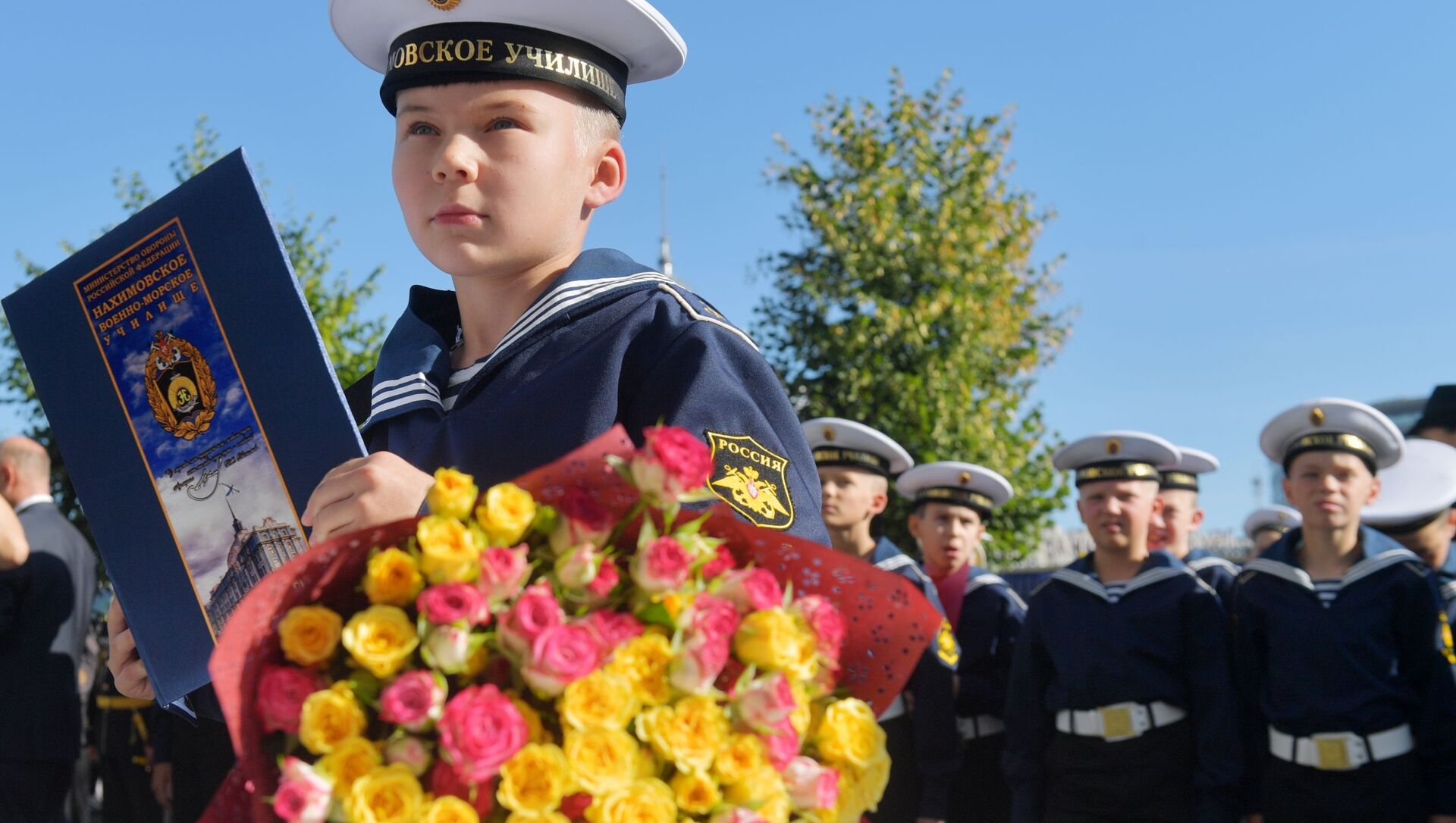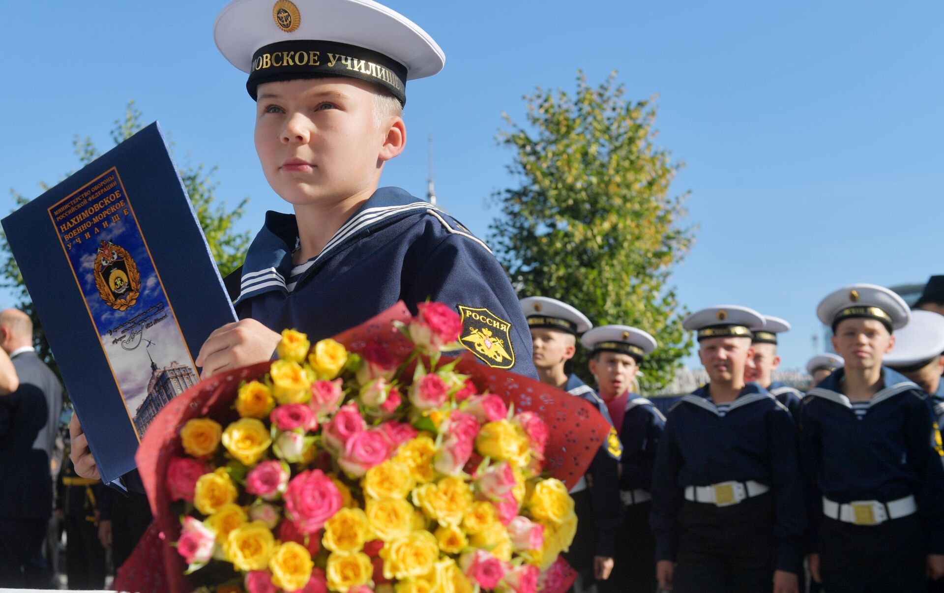 تلاميذ معهد ناخيموف للبحرية الروسية في مدينة سان بطرسبورغ يشاركون في مراسم الاحتفال بمناسبة بدء العام الدراسي الجديد.