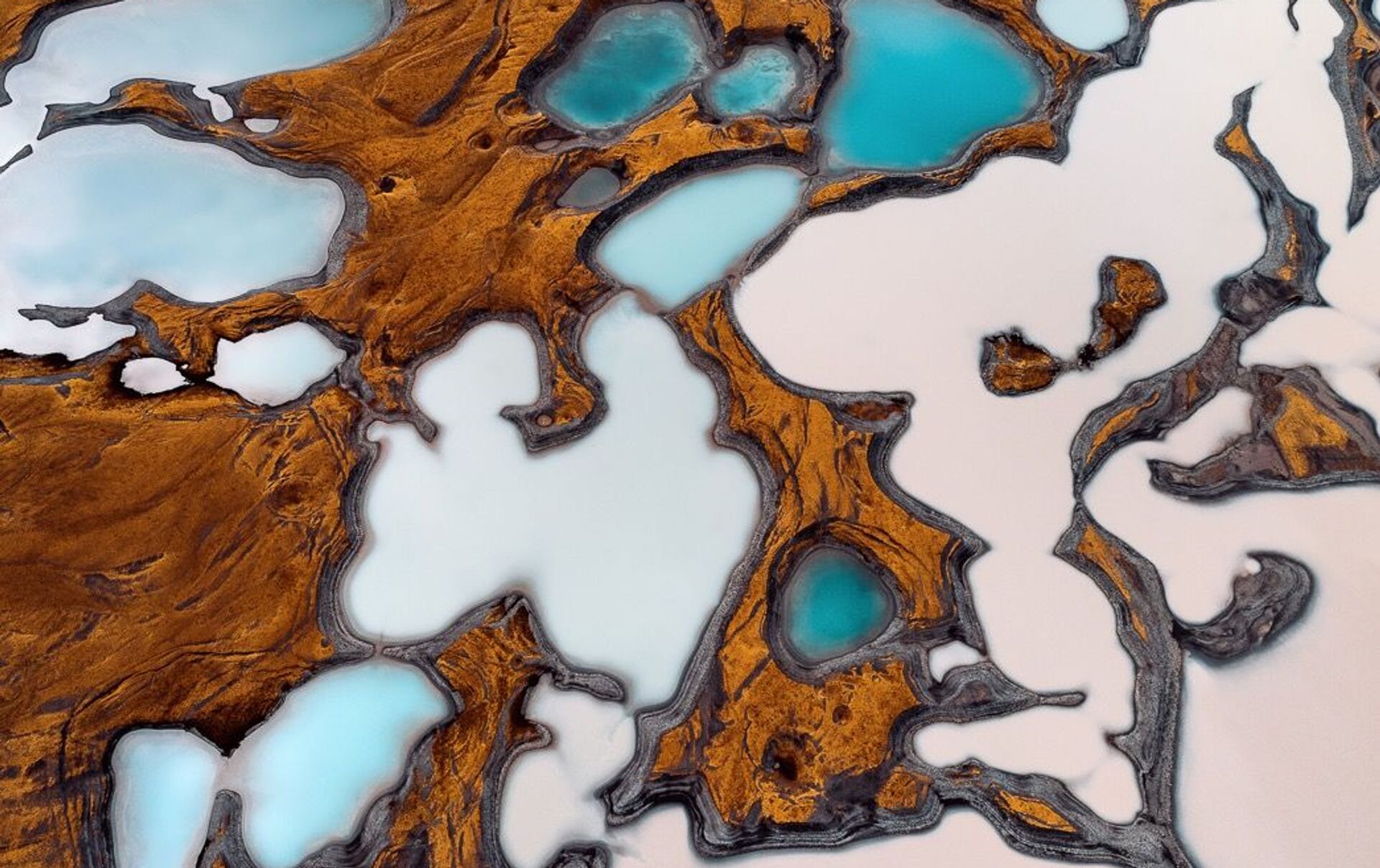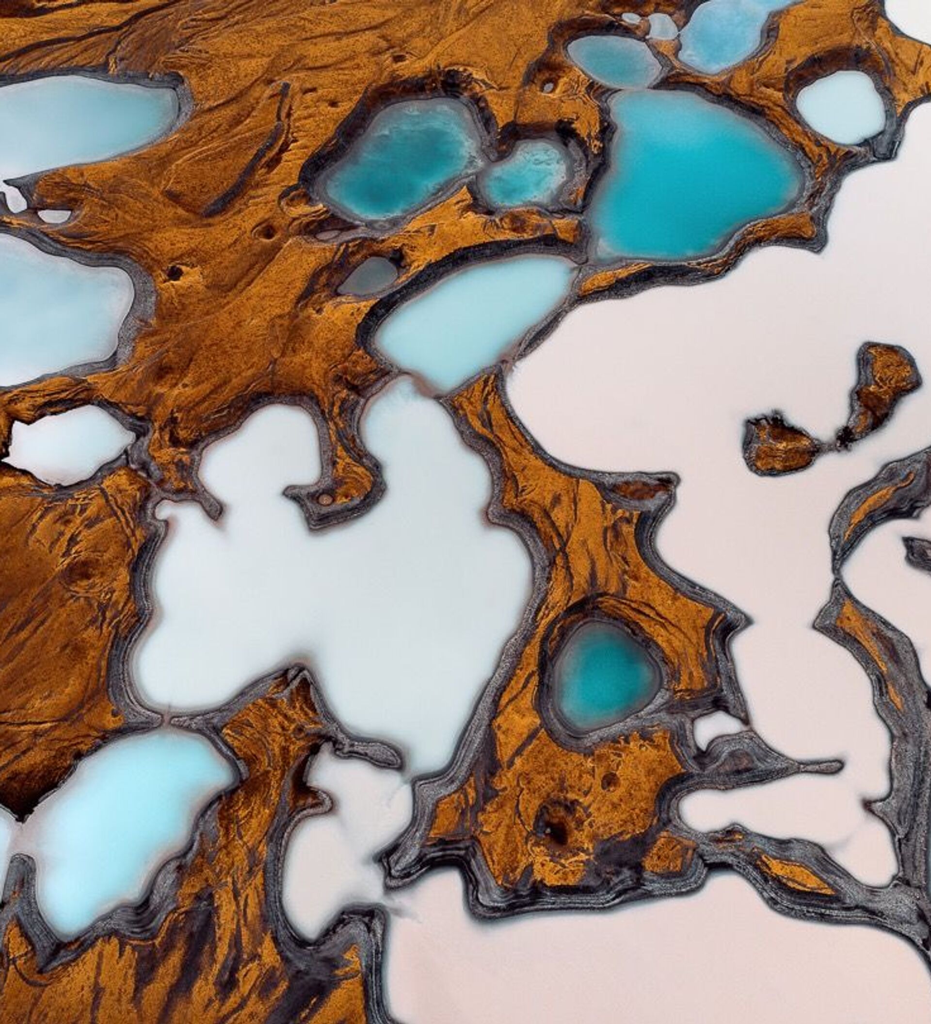 مع ذوبان الأنهار الجليدية في آيسلندا، تتدفق المياه الزرقاء الجليدية عبر الرمال البركانية السوداء، مما يخلق مناظر طبيعية فريدة. تحتوي هذه المشاهد على عنصر من الازدواجية - من الصعب معرفة ما إذا كانت الصورة قد التقطت بواسطة منظور مقرب أو من طائرة صغيرة على ارتفاع 3000 قدم في الهواء.