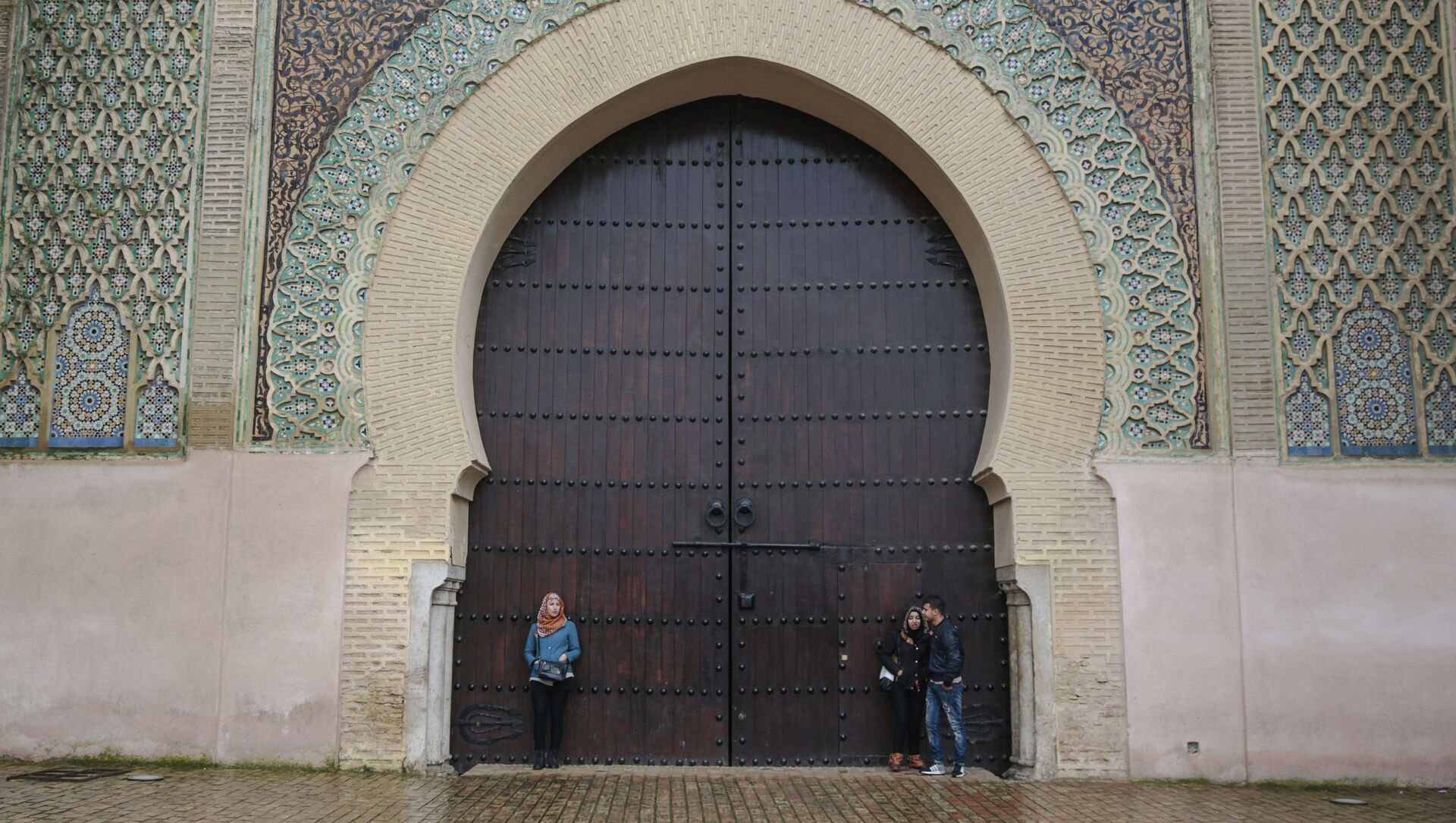 أشخاص يحتمون من المطر بمدخل مدينة مكناس التاريخية الذي بني في القرن الـ 18 بالقرب من مكناس، المغرب 23 فبراير/ شباط 2017 - سبوتنيك عربي