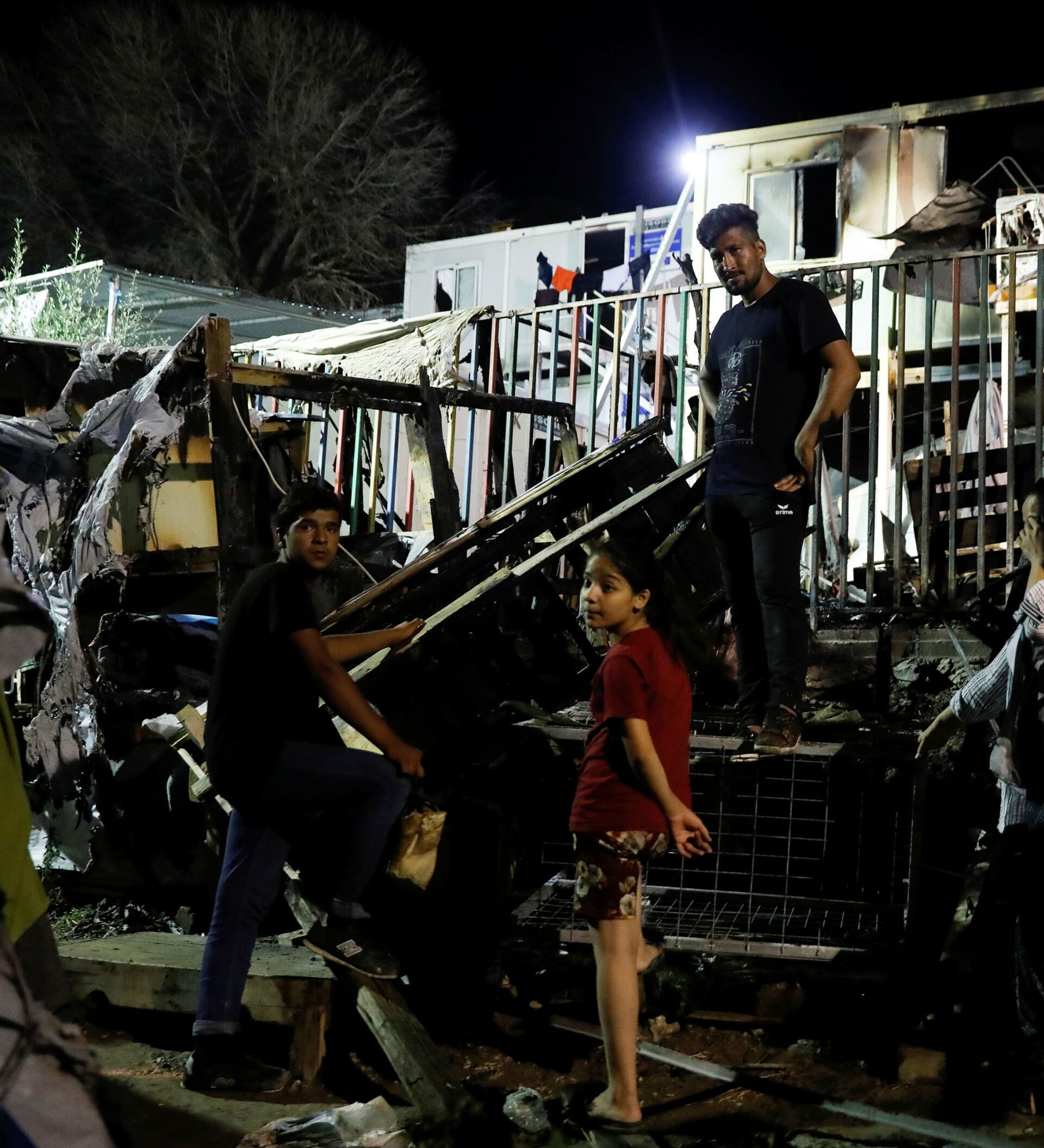 © REUTERS / GIORGOS MOUTAFISمهاجرون يقفون أمام حاويات محترقة في أعقاب نشوب حريق في مخيم موريا بجزيرة ليسبوس باليونان