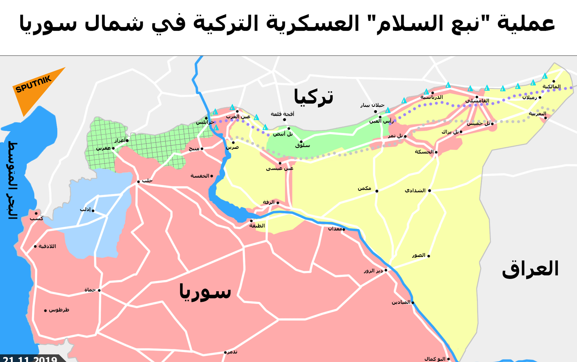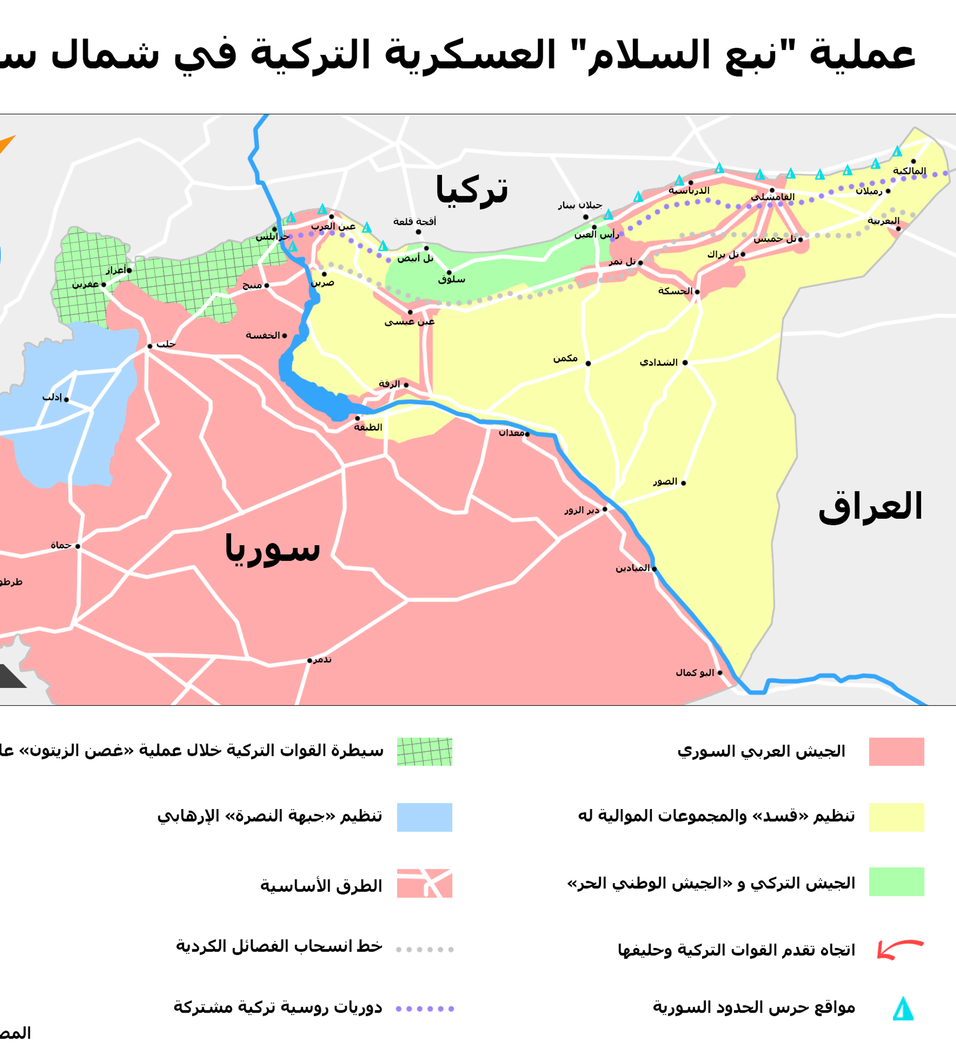 الموقف السوري: أكدت سوريا، اليوم أنها ستواجه القوات التركية بمختلف أشكالها في أية بقعة من البقاع السورية وبكل الوسائل والسبل المشروعة.