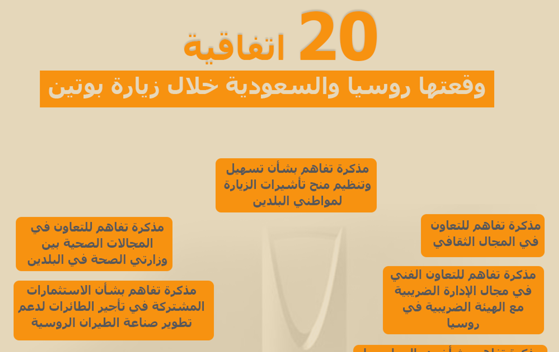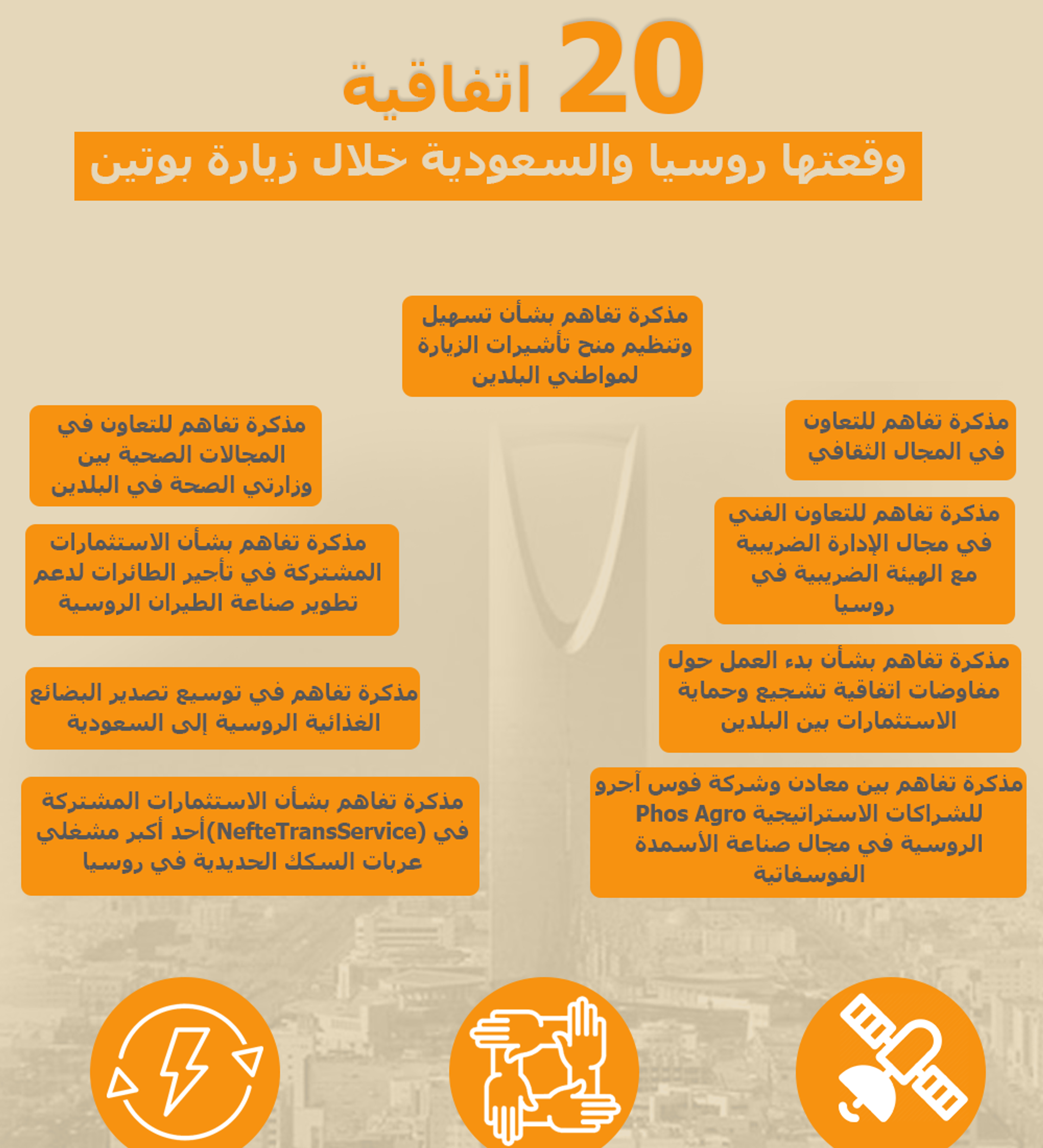 تعرف على عشرين اتفاقية وقعتها روسيا والسعودية خلال زيارة الرئيس فلاديمير بوتين إلى السعودية.