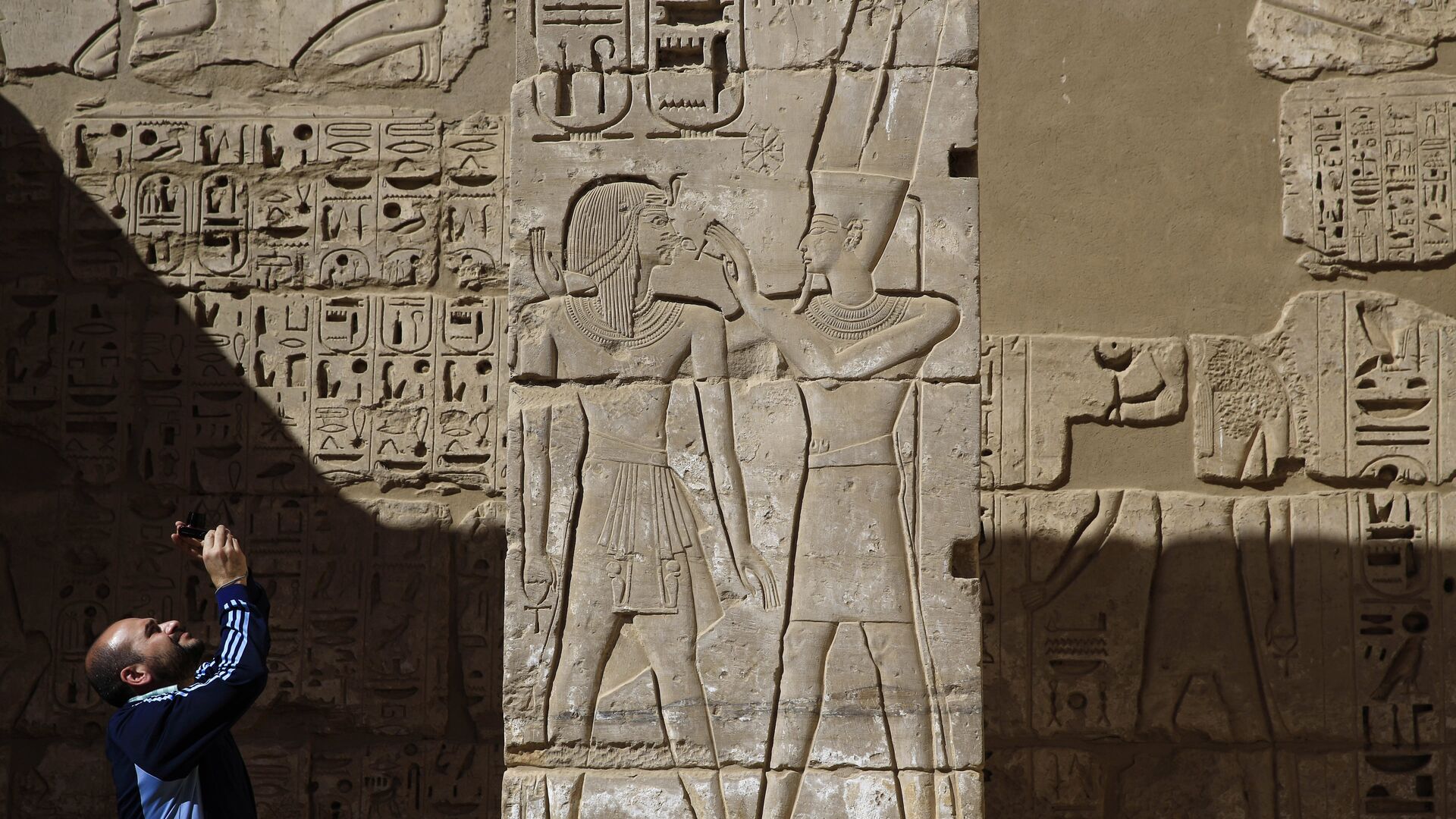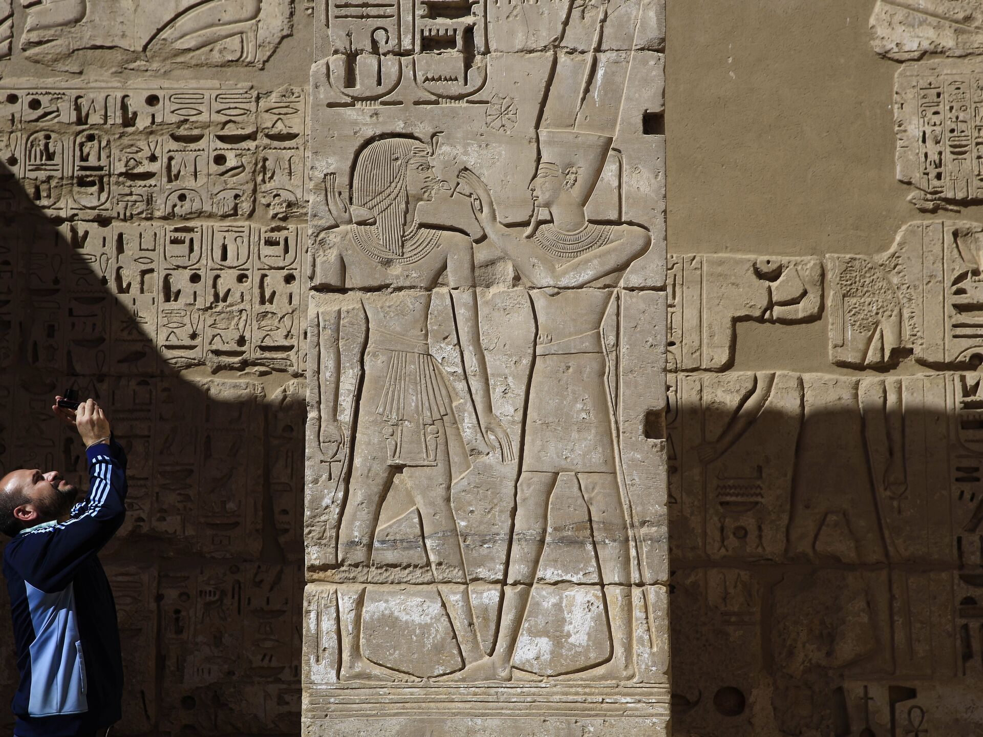 © AP Photo / Hassan Ammarسائح يلتقط صورة لنقوش على معبد رمسيس الثالث في الأقصر