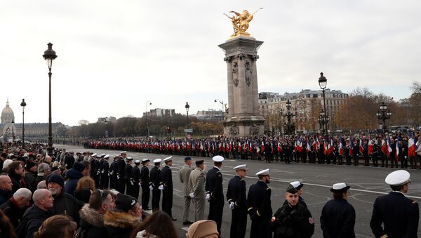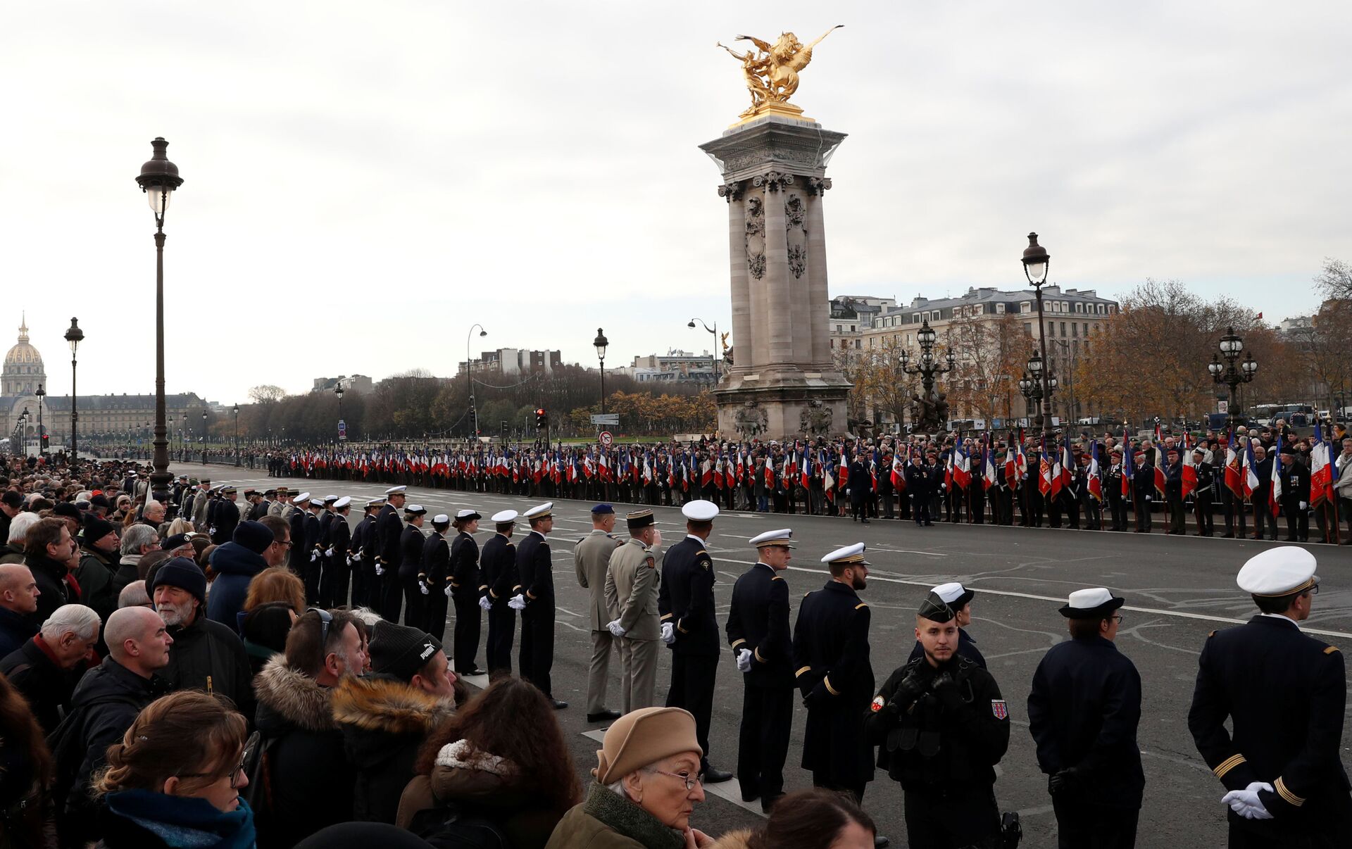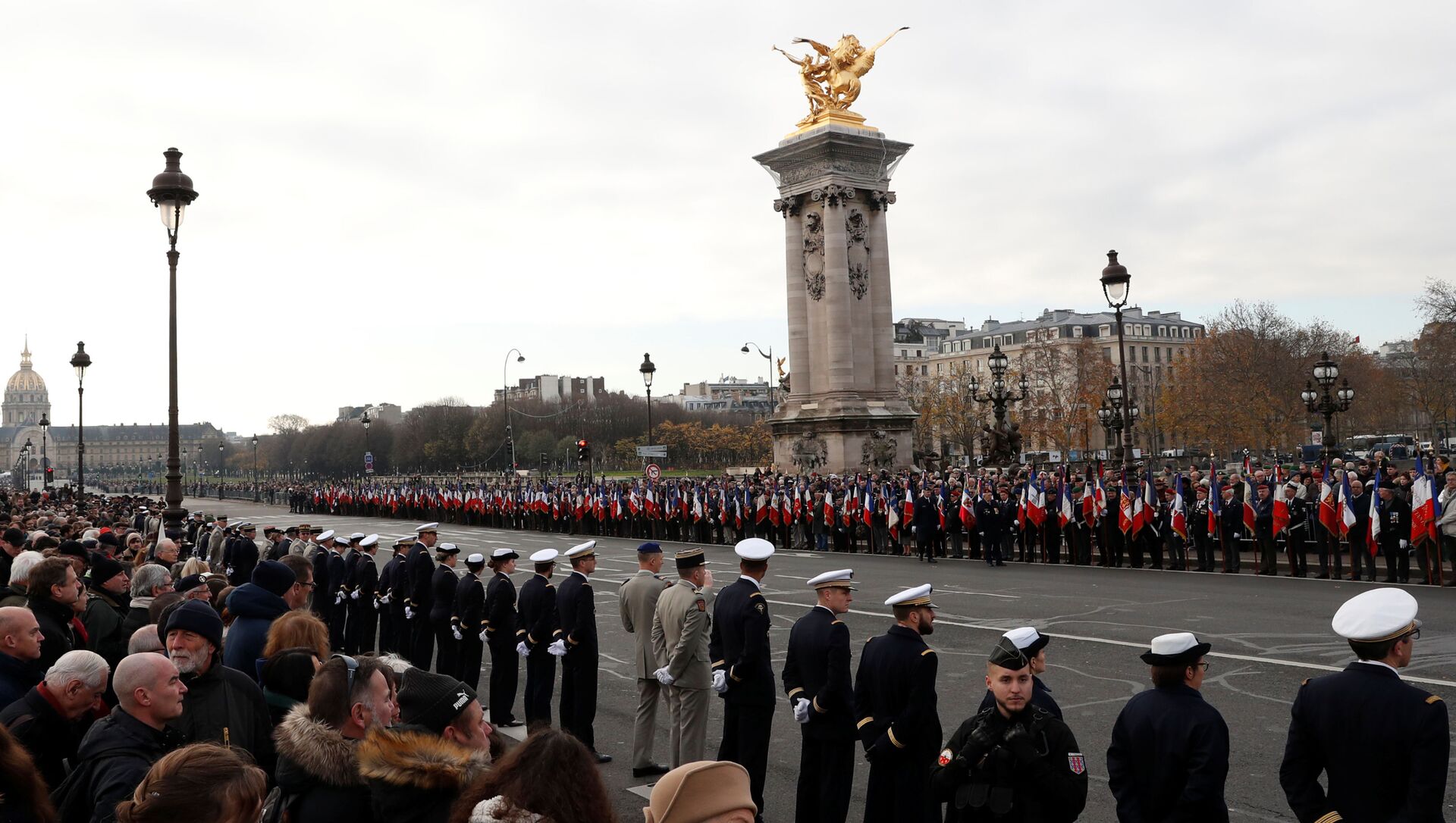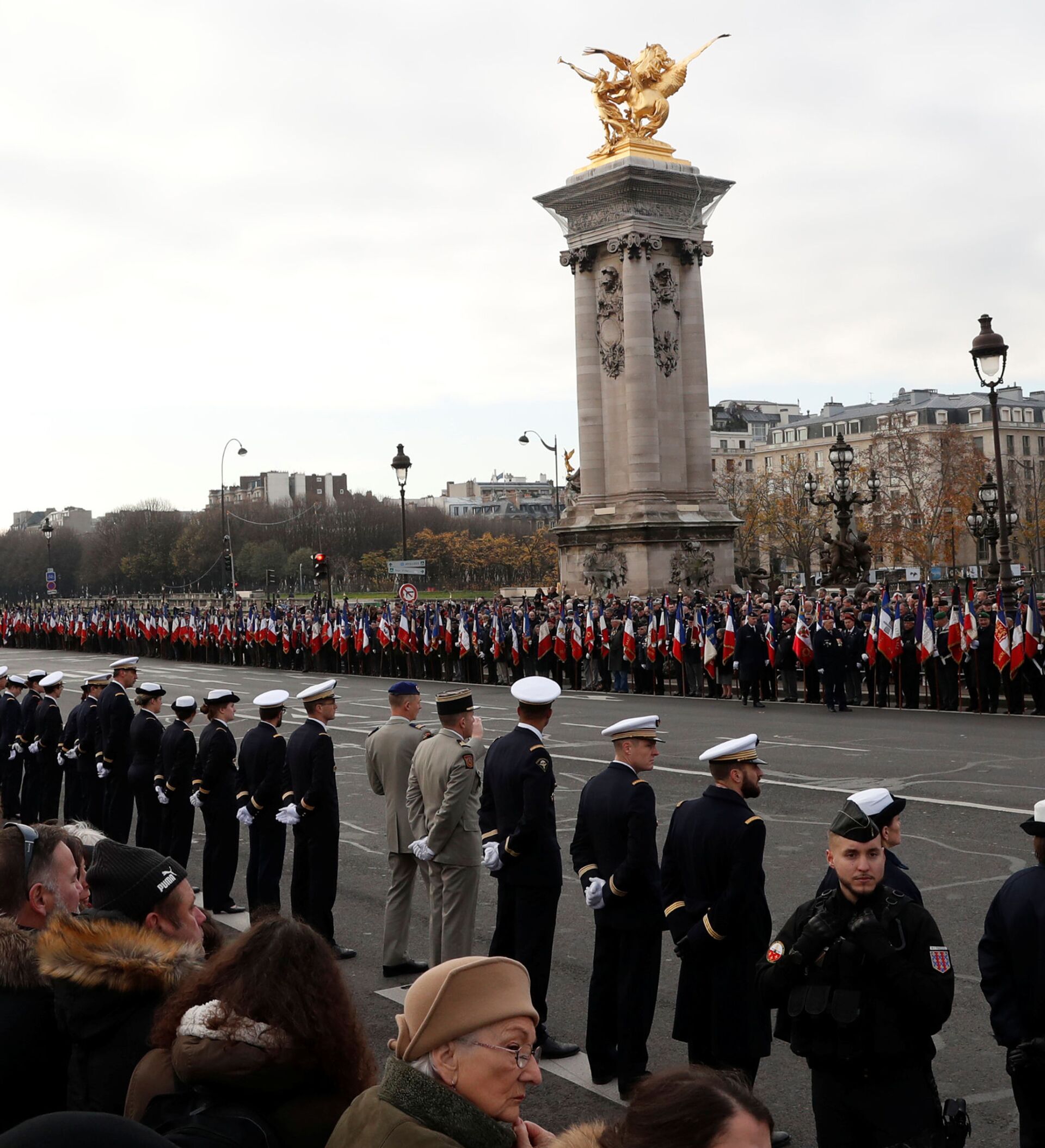 ووصل الرئيس إيمانويل ماكرون لاحقا إلى الساحة، حيث قامت جوقة الجيش بإلقاء النشيد الوطني الفرنسي قبل أن يقف الحضور دقيقة صمت على أرواح العسكريين.