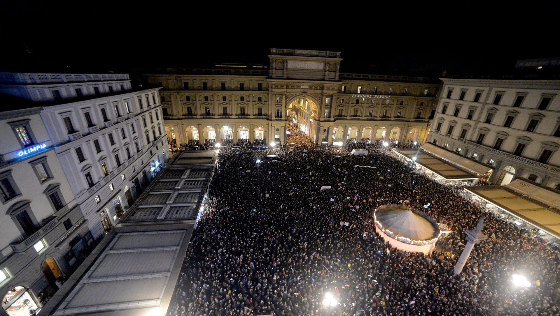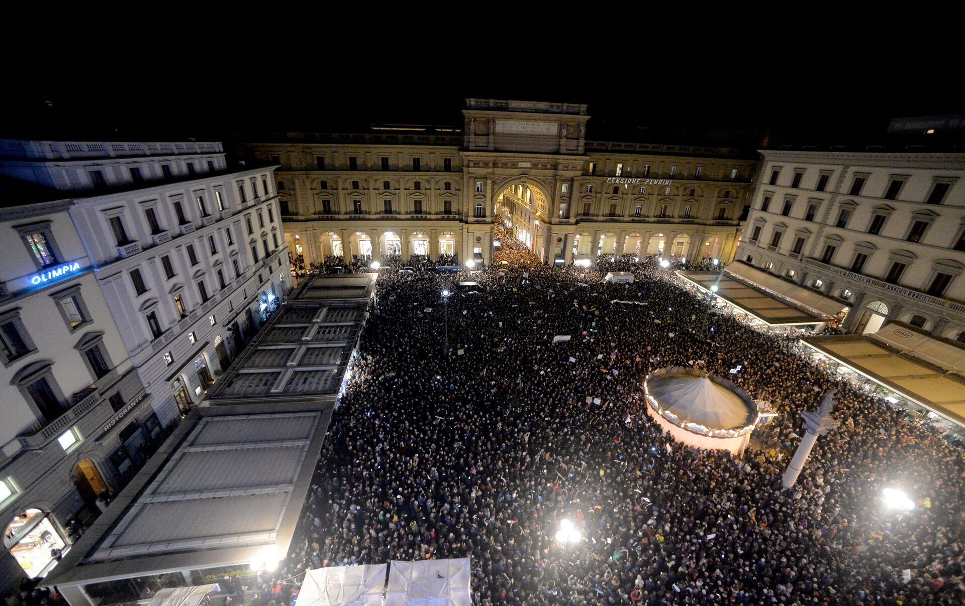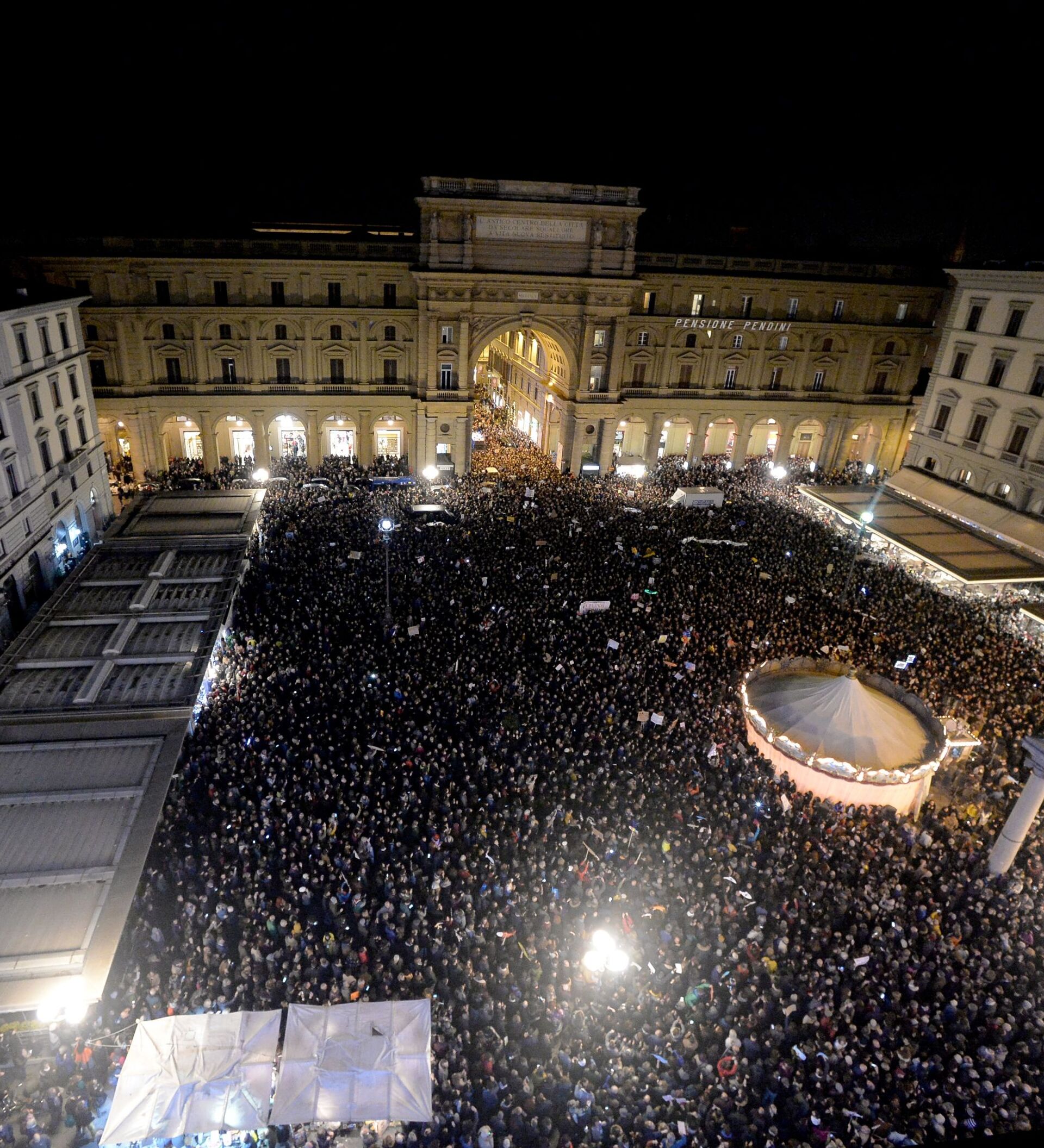 احتشد المتظاهرون تحت المطر في بيازا غراندي مساء الاثنين عندما قام وزير الداخلية السابق بحملة في المدينة قبل الانتخابات الإقليمية الحاسمة في إميليا رومانيا، معقل اليسار.