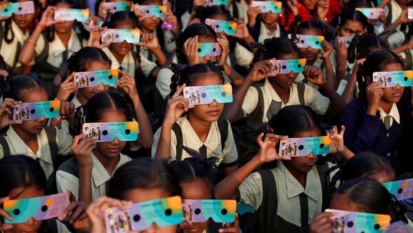 أطفال يشاهدون كسوف الشمس الحلقي النادر في أحمد آباد، الهند 26 ديسمبر 2019 - سبوتنيك عربي
