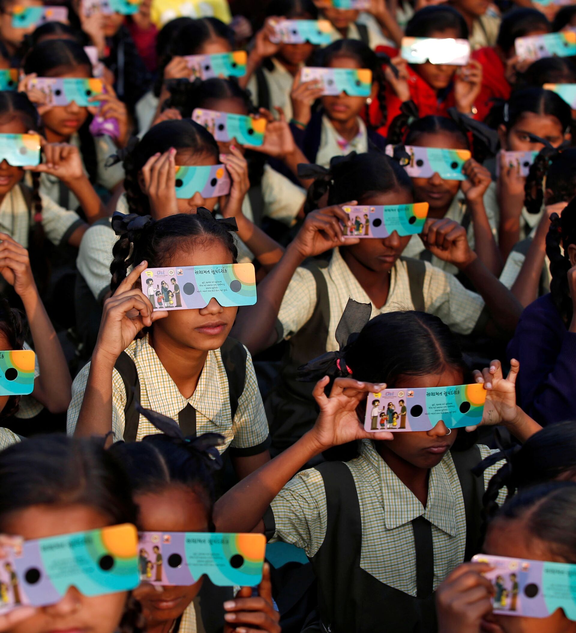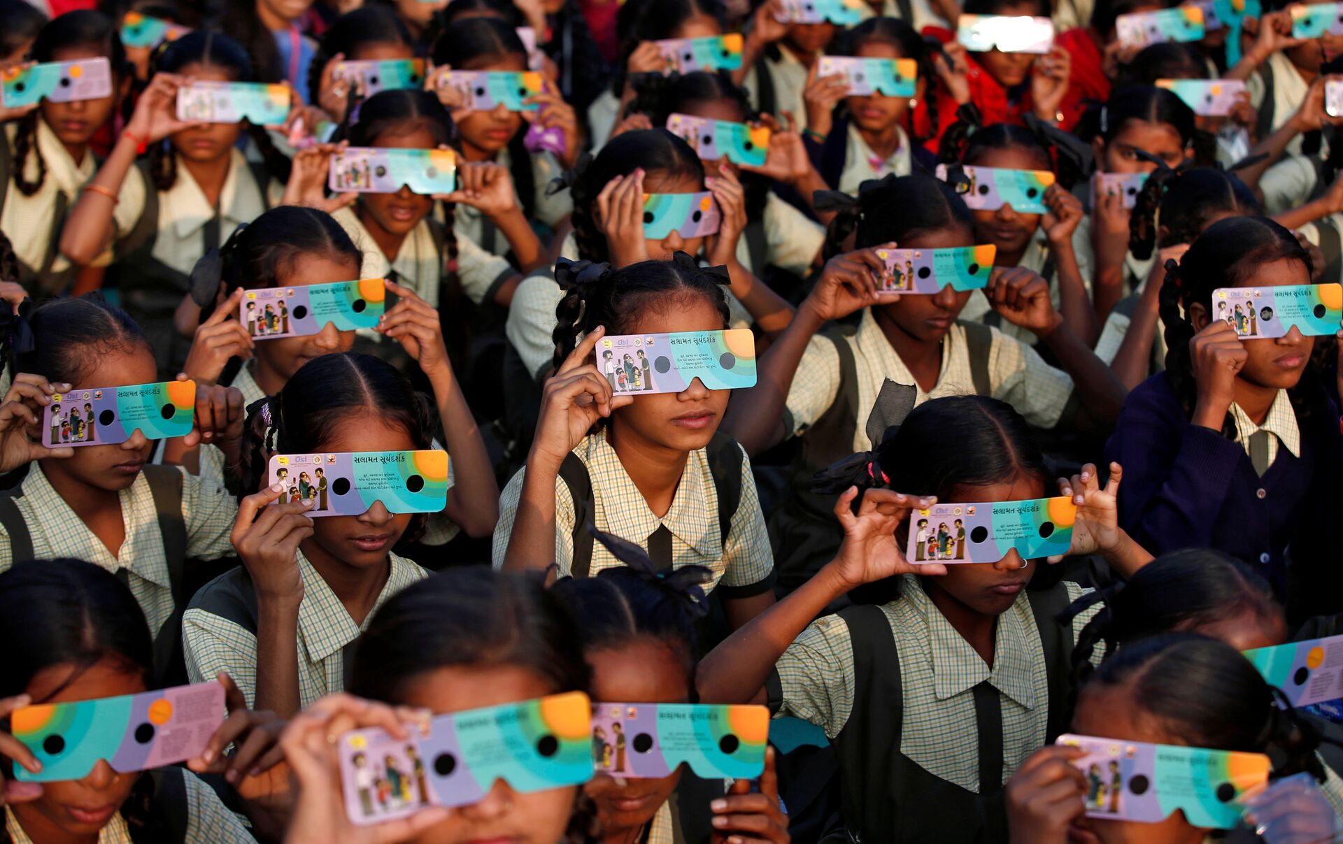 أطفال يشاهدون كسوف الشمس الحلقي النادر في أحمد آباد، الهند 26 ديسمبر 2019