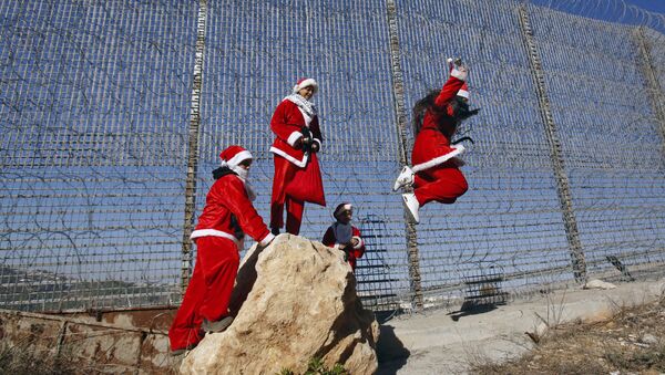 © AFP 2023 / Musa Al Shaer فلسطينيون يرتدون زي بابا نويل عند حاجز بالقرب من مدينة بيت لحم، الضفة الغربية 23 ديسمبر 2019