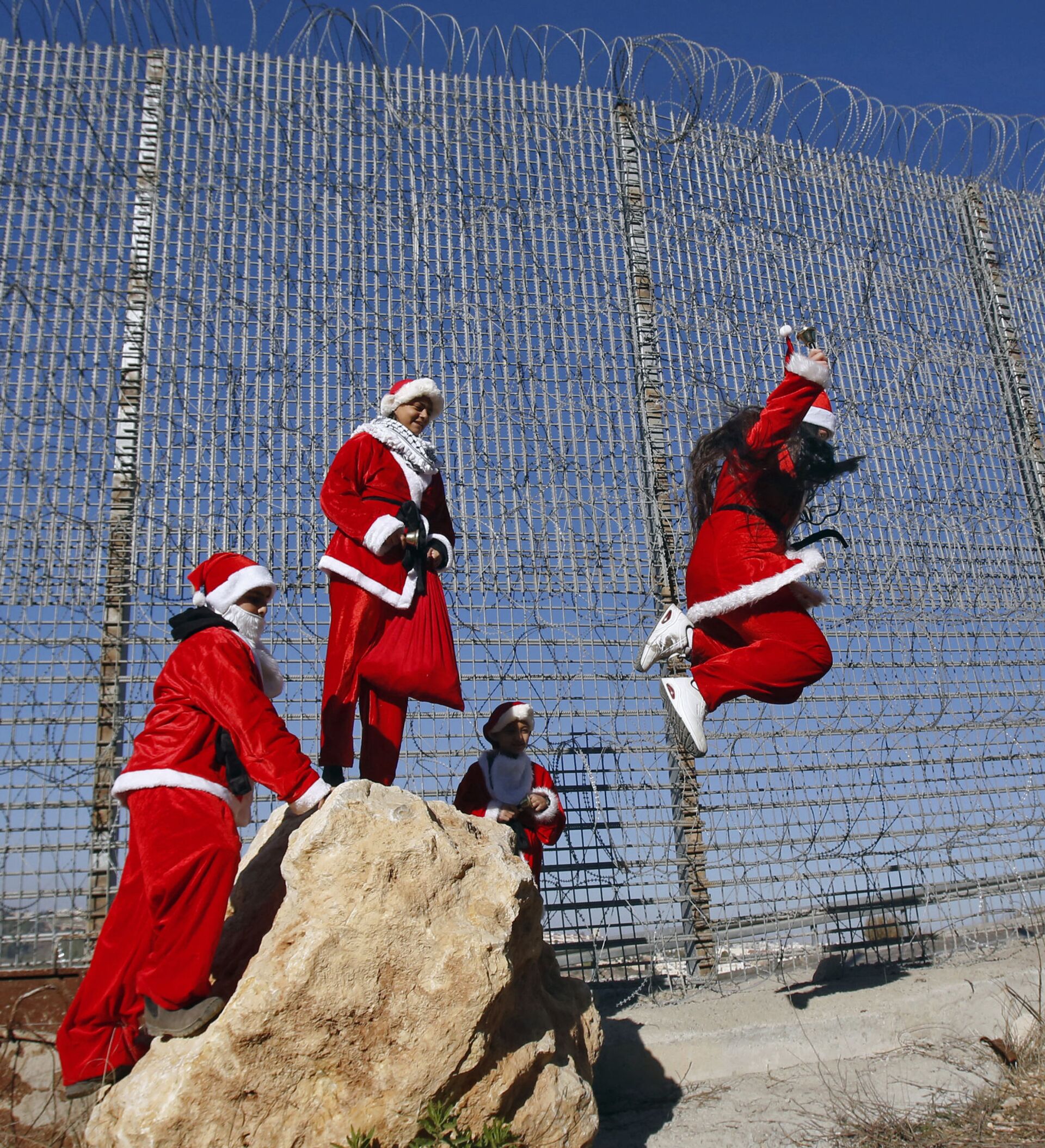 فلسطينيون يرتدون زي بابا نويل عند حاجز بالقرب من مدينة بيت لحم، الضفة الغربية 23 ديسمبر 2019