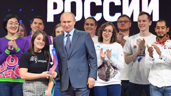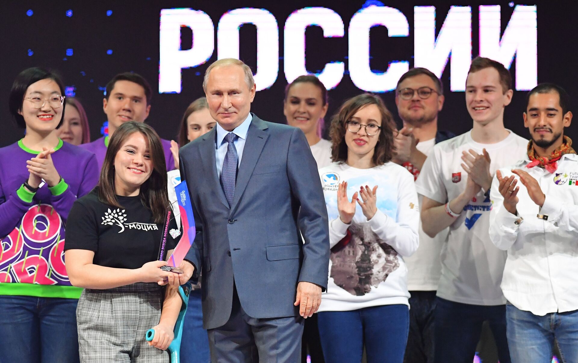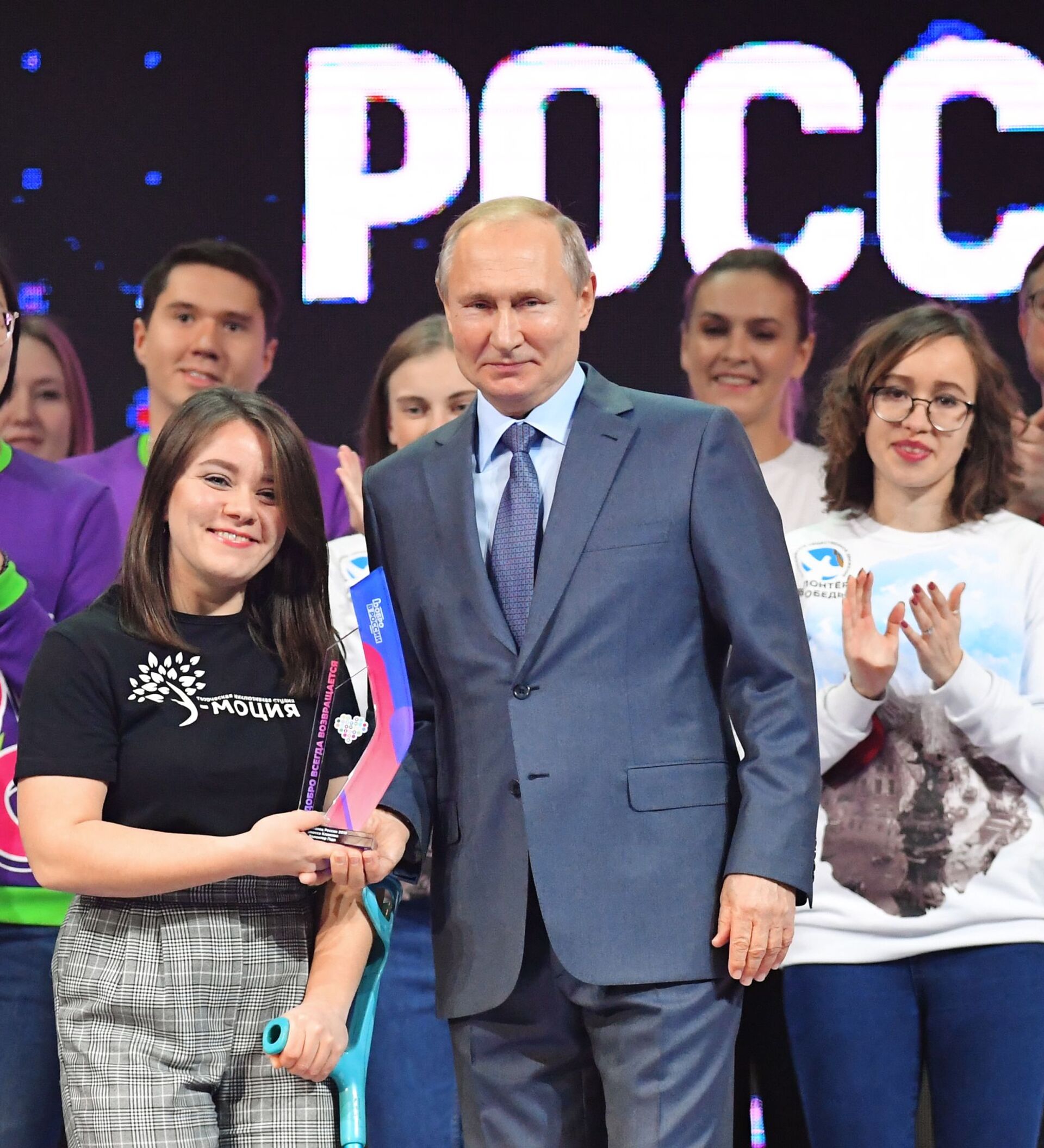 الرئيس الروسي فلاديمير بوتين يقدم الجائزة للفائزة، إنيسا كليوكينا، في مسابقة عموم روسيا "التطوع لروسيا 2019" في ترشيح "تطوع العام" في ختام فعاليات منتدى "متطوع روسيا"، 5 ديسمبر 2019