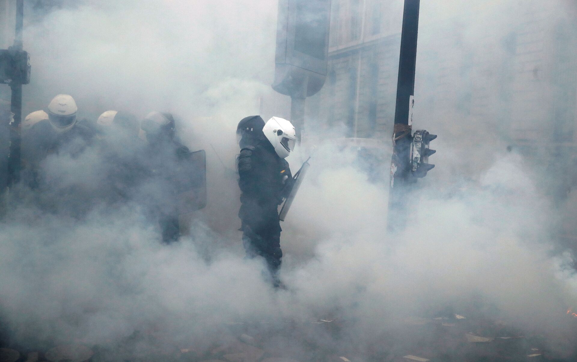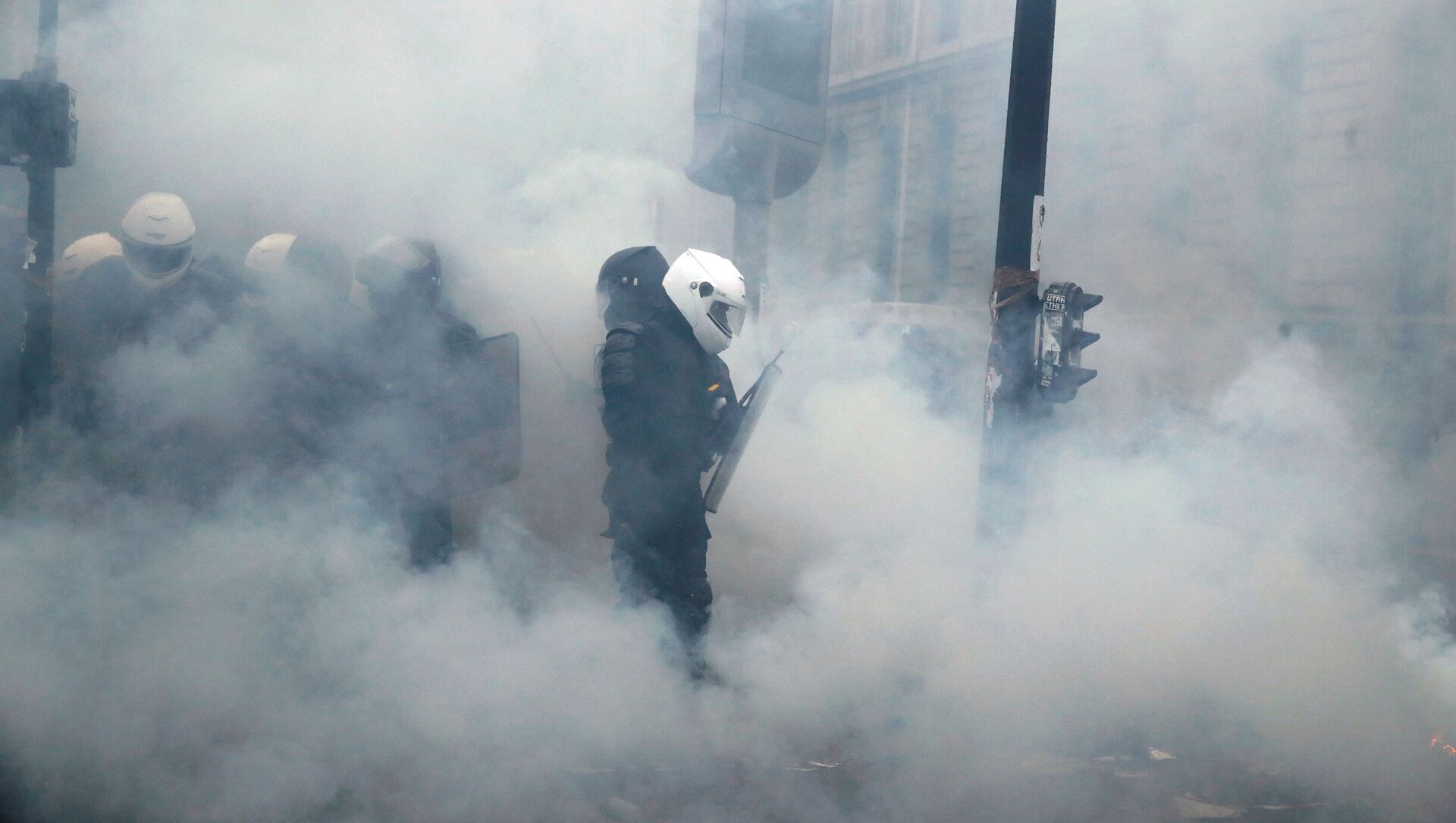ويعبر المحتجون في المظاهرة المناهضة لإصلاح نظام المعاشات التقاعدية عن احتجاجهم بالتصفيق والشعارات التقليدية المناهضة للإصلاح، ويصرخون بعبارات شاتمة ضد الشرطة ويطالبون بإعدامهم، وفي بعض الأحيان يرمونهم بأشكال مختلفة من القمامة.