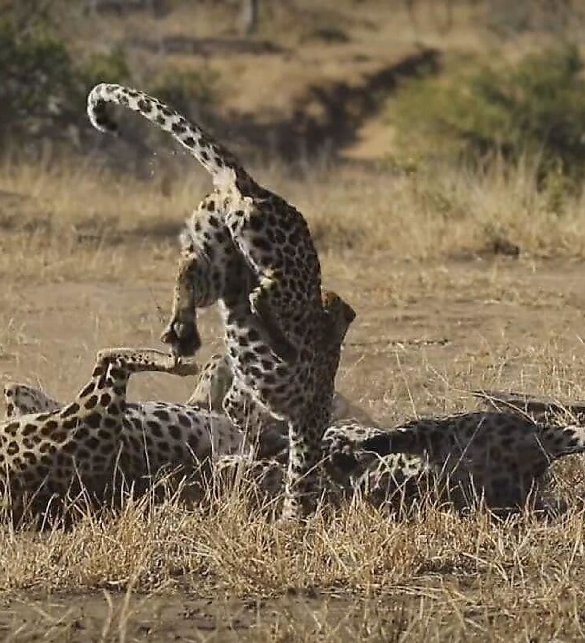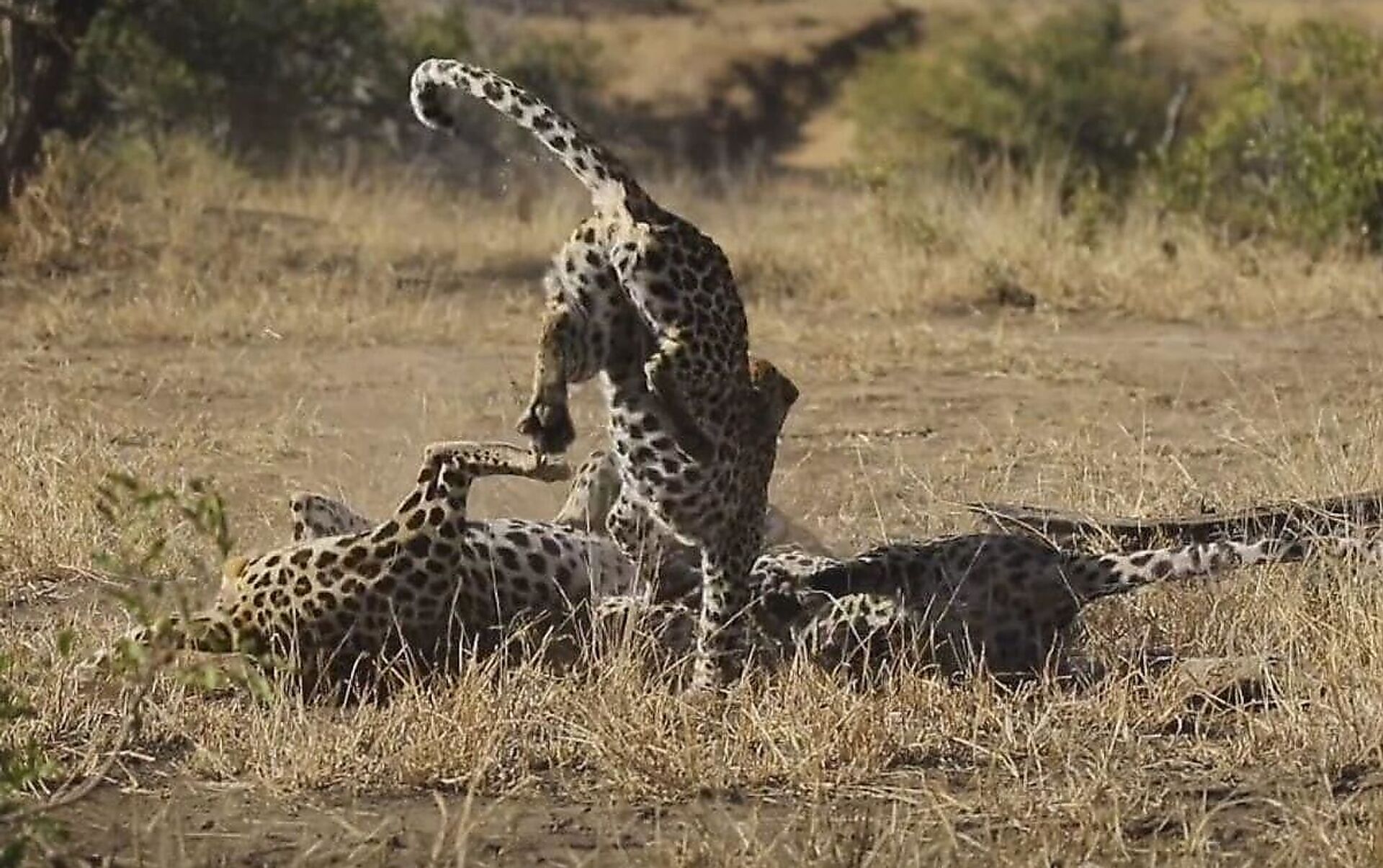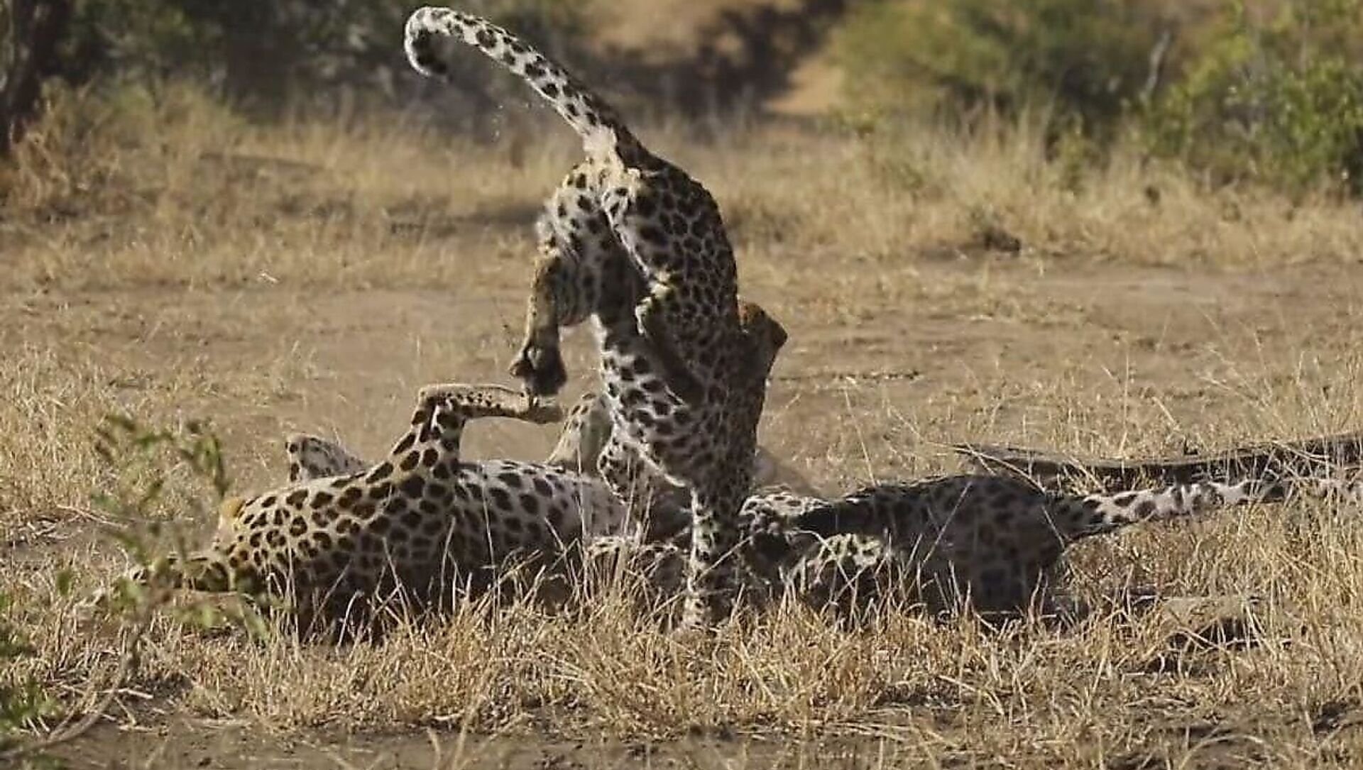فقامت الأنثى بعض الفهد الآخر، الأمر الذي أدى إلى هروب الفهد المفترس من المكان، بينما تنفس الصعداء الفهد الآخر وجلس ليرتاح، بعد أن أصيب بجراح بليغة في منطقة الوجه.