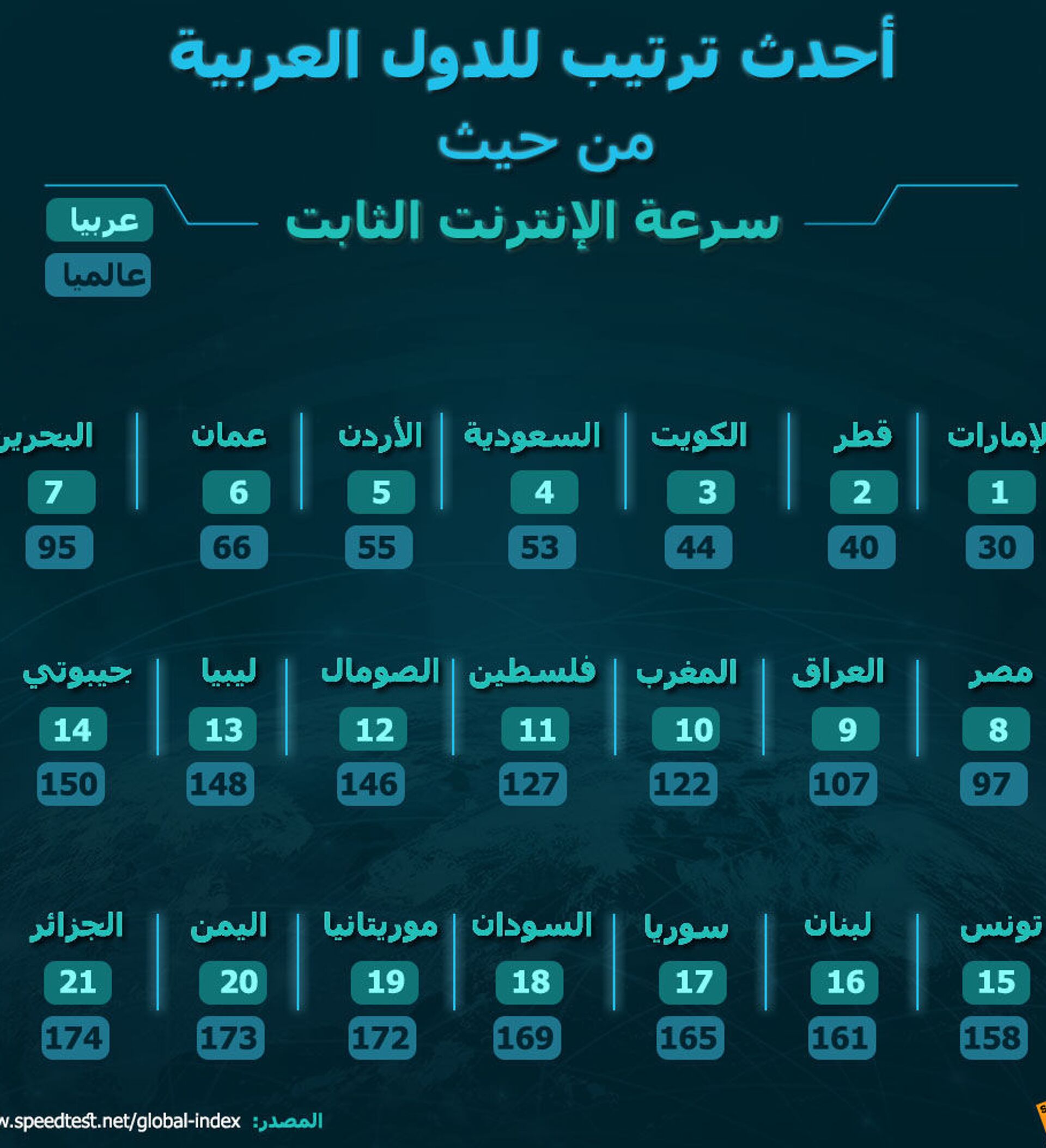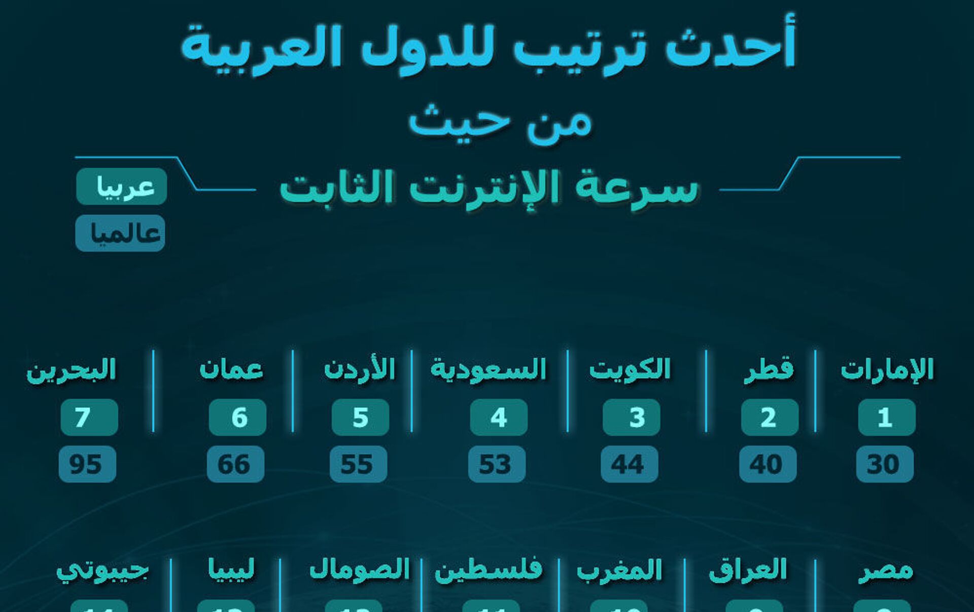 أحدث ترتيب للدول العربية من حيث سرعة الإنترنت الثابت
