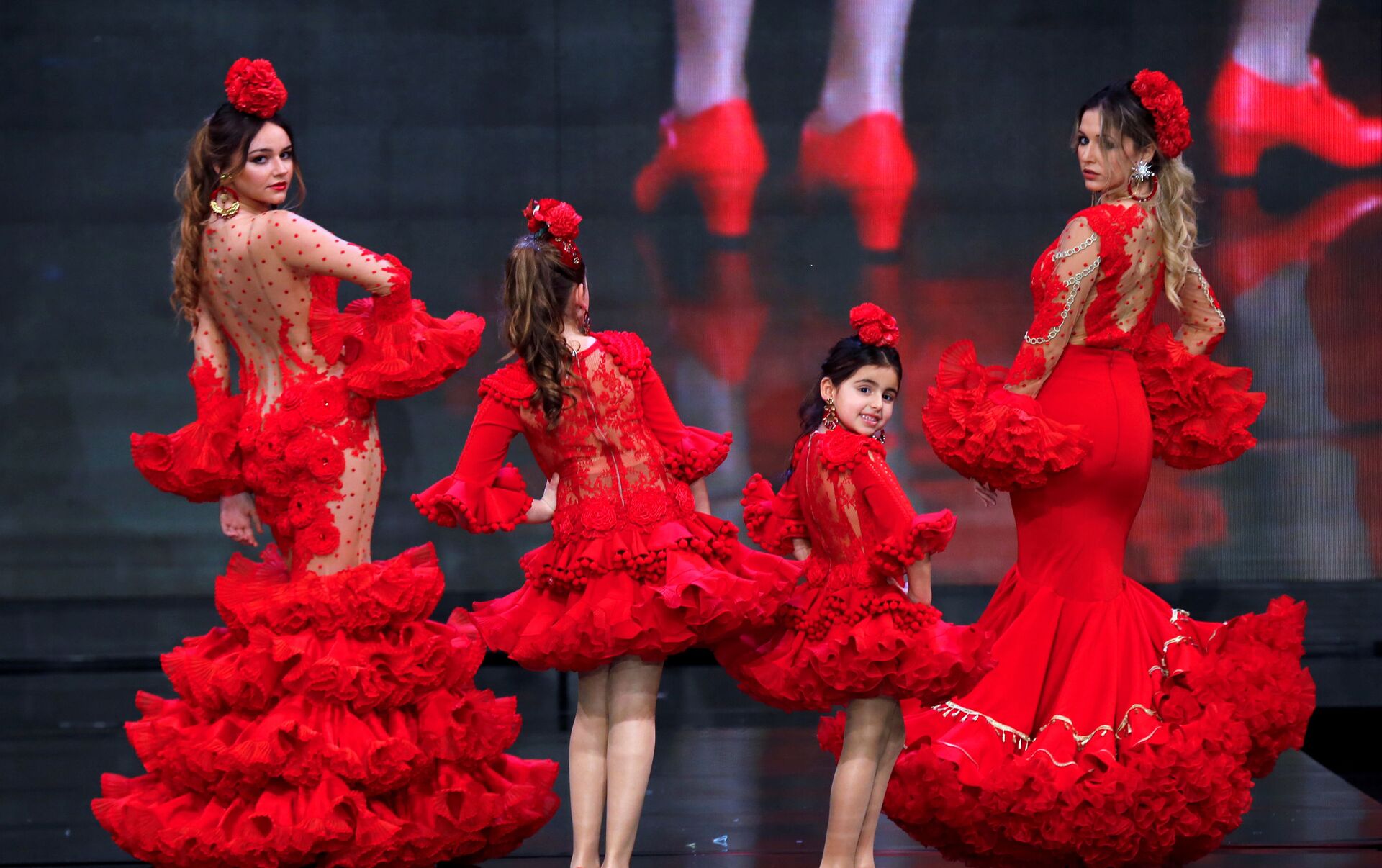 عارضات أزياء تقدم تصاميم أنا مورون (Ana Moron) خلال عرض "أزياء الفلامنكو الدولي (سيموف)" (International Flamenco Fashion Show (SIMOF)) في إشبيلية، إسبانيا في 31 يناير 2020.