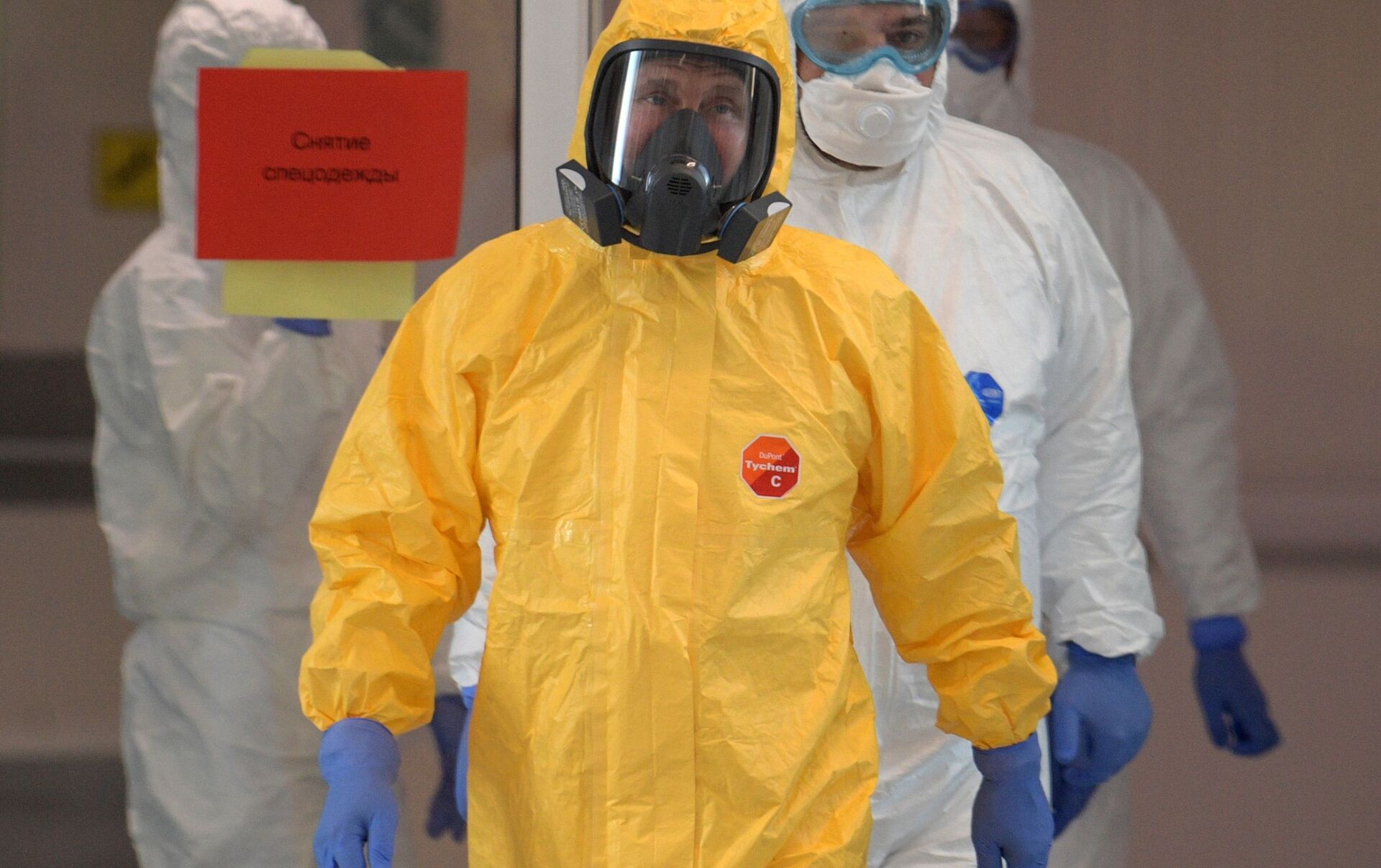 © Sputnik . Alexander Druzhynin / الانتقال إلى بنك الصورالرئيس فلاديمير بوتين يزور مستشفى "كوموناركا"، المخصص لاستقبال المصابين بـ"كورونا"، موسكو، 24 مارس 2020