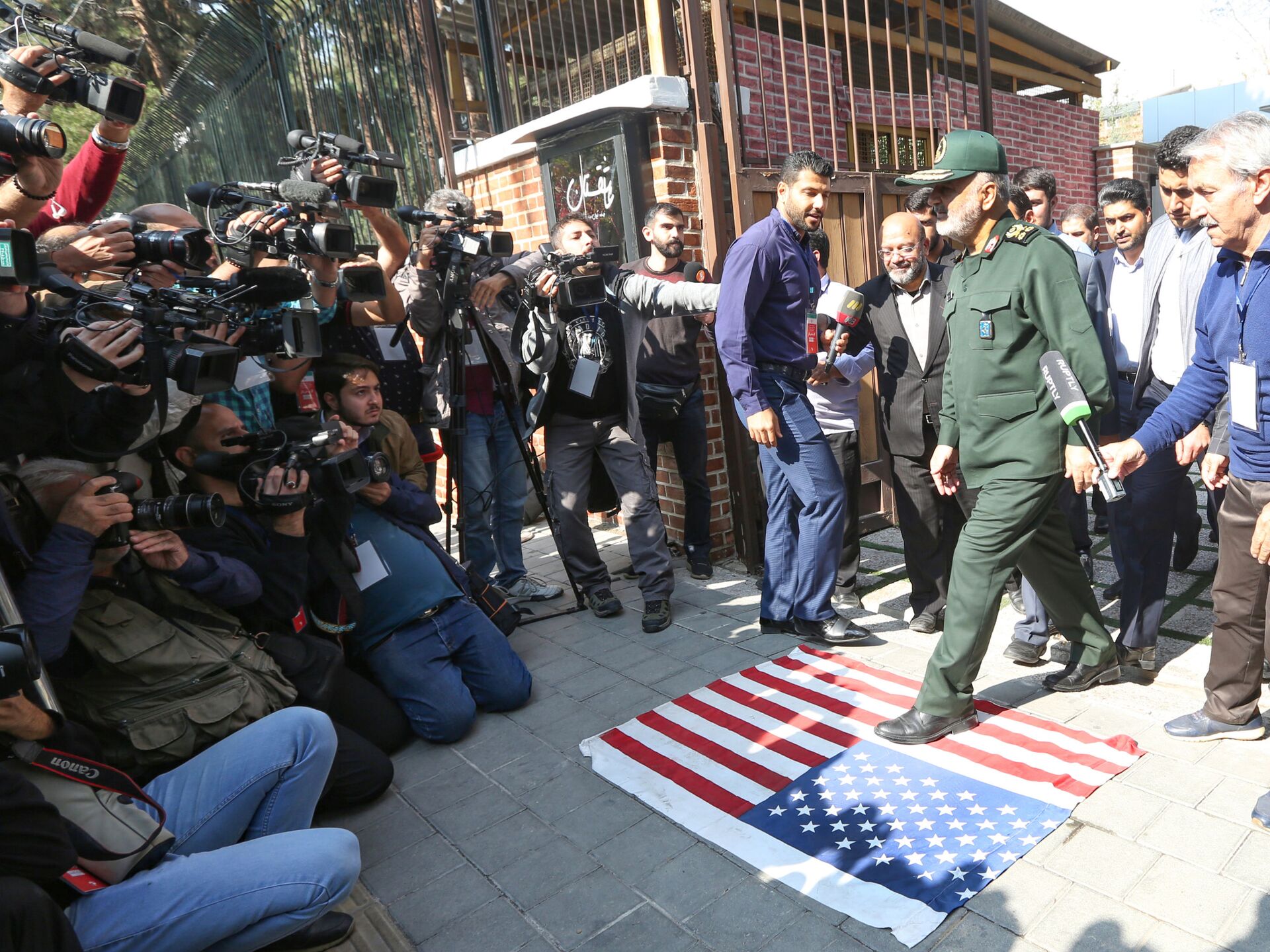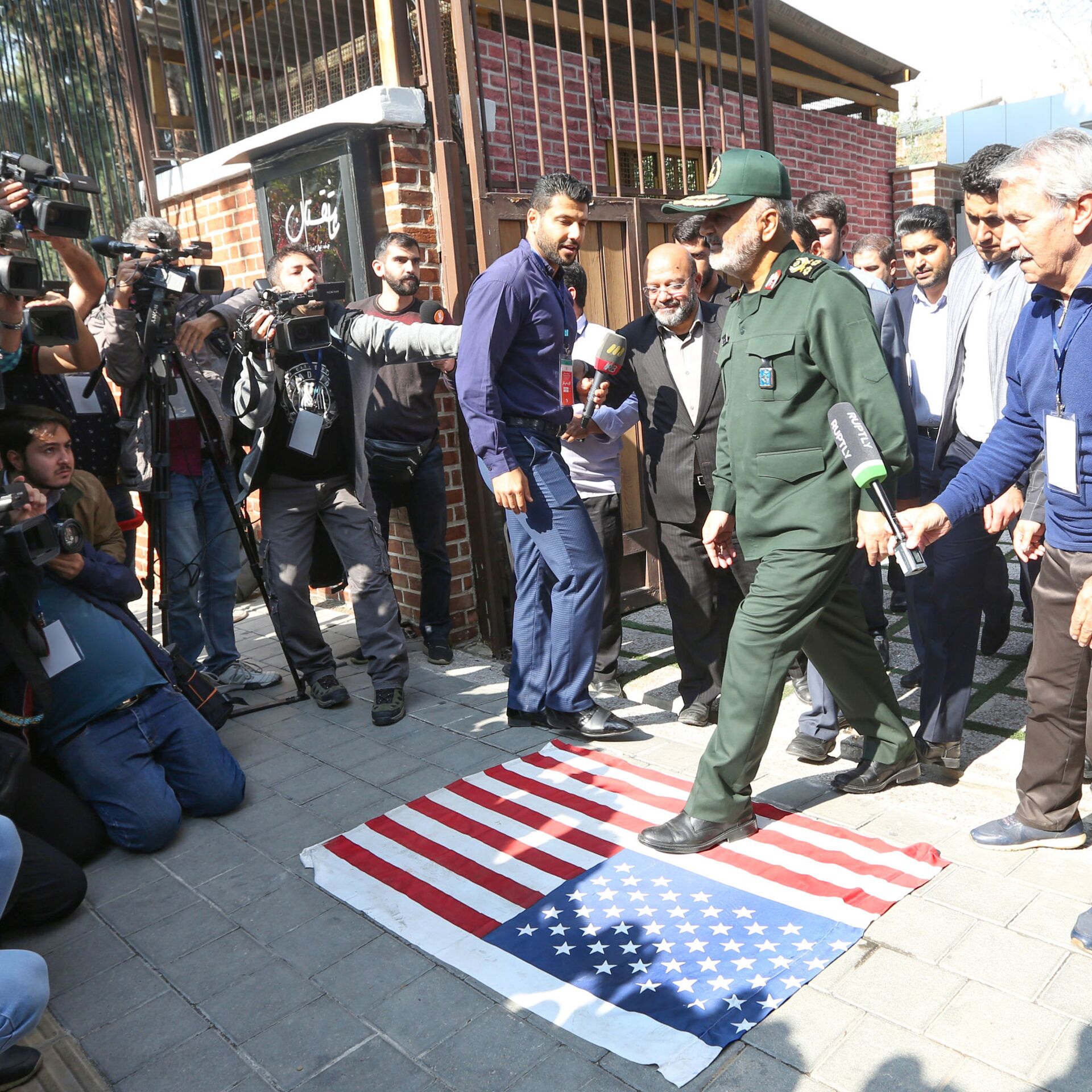 قائد الحرس الثوري الإيراني اللواء حسي سلامي يمشي على علم أمريكا - سبوتنيك عربي