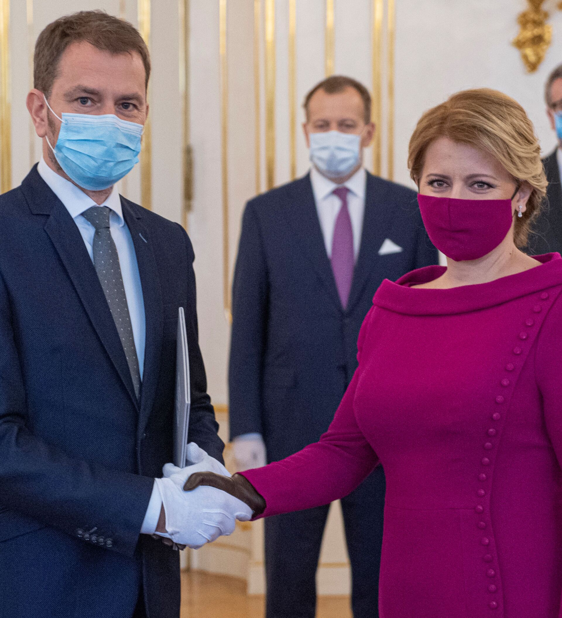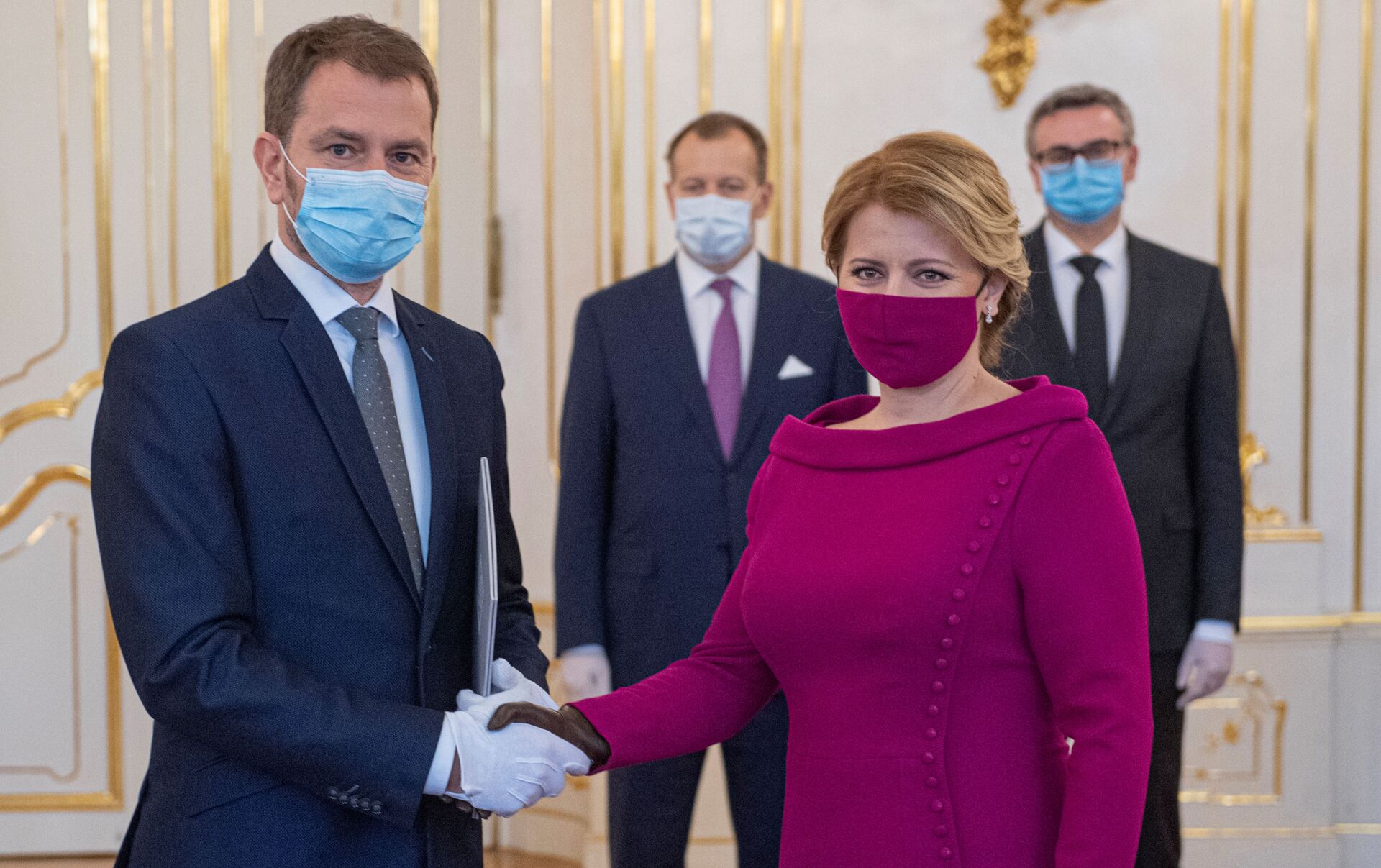 رئيسة سلوفاكيا زوزانا تشابوتوفا ورئيس الوزراء إيغور ماتوفيتش يرتديان أقنعة واقية وقفازات طبية، يتصافحان أثناء حضورهما لمراسم تنصيب الحكومة في القصر الرئاسي في براتيسلافا، سلوفاكيا 21 مارس 2020.