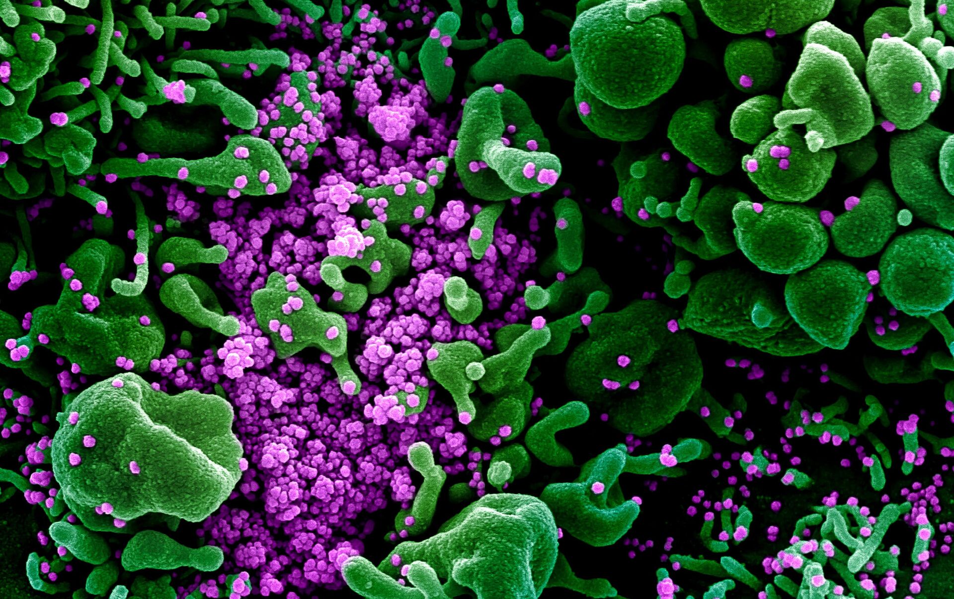 © REUTERS / NIAID-IRFمسح إلكتروني لخلية في حالة الاستماتة (باللون الأخضر) لمريض مصاب جداً بجزيئات فيروس "SARS-COV-2" (باللون البنفسجي)، والمعروف أيضًا باسم فيروس تاجي جديد "كورونا".