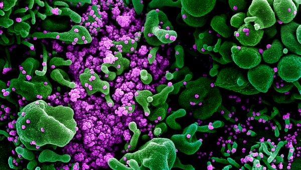 مسح إلكتروني لخلية في حالة الاستماتة (باللون الأخضر) لمريض مصاب جداً بجزيئات فيروس SARS-COV-2 (باللون البنفسجي)، والمعروف أيضًا باسم فيروس تاجي جديد كورونا. - سبوتنيك عربي