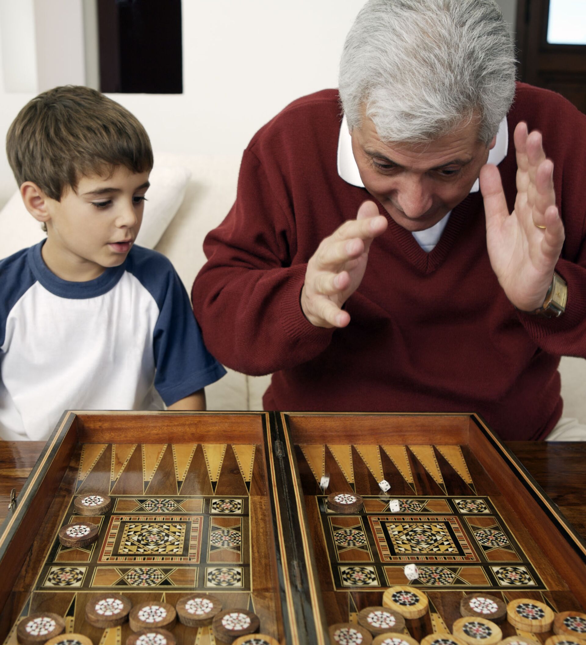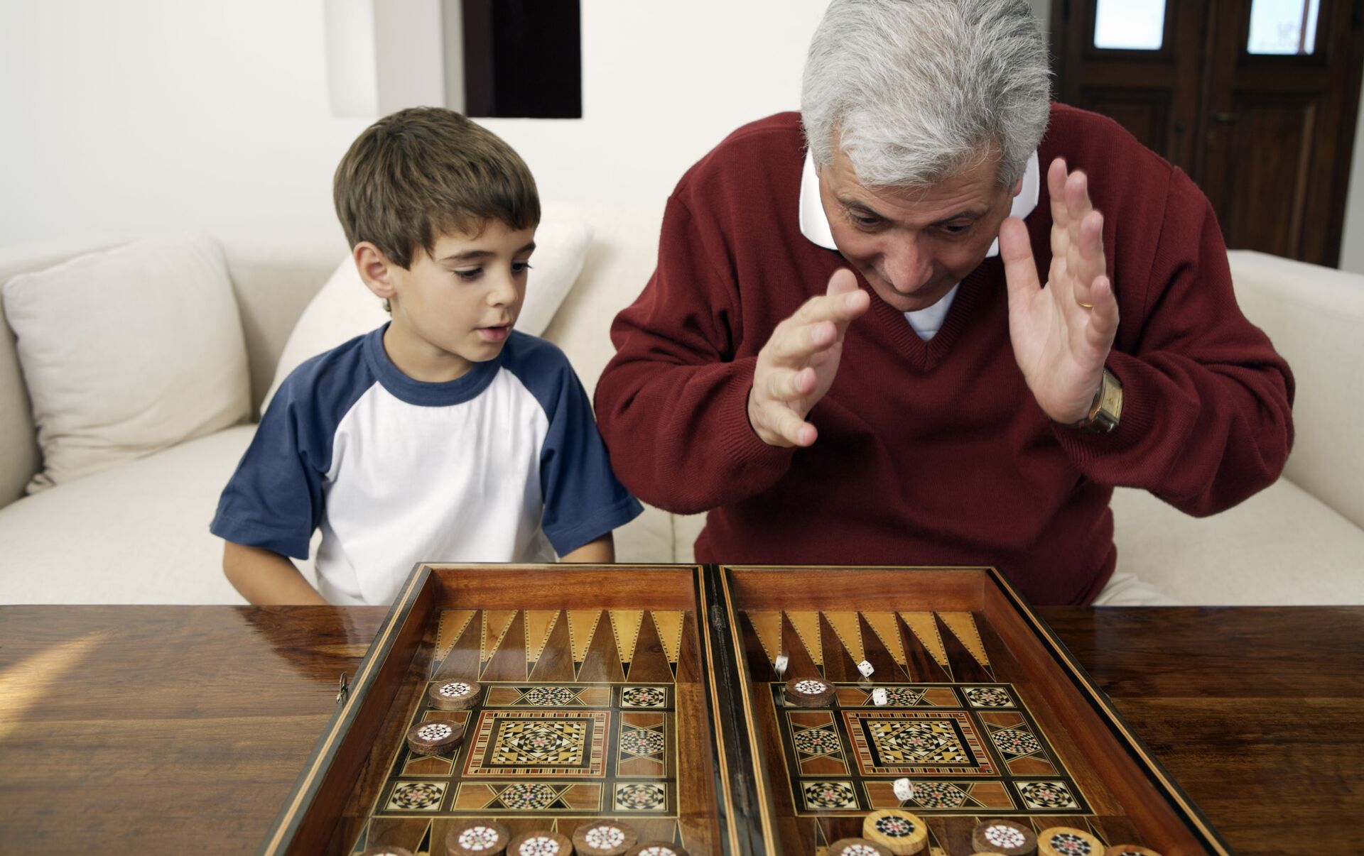 جد يلعب مع حفيده لعبة الطاولة (أو النَّرد)