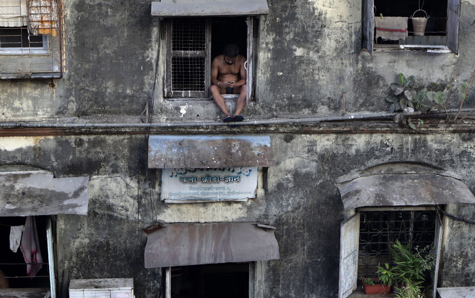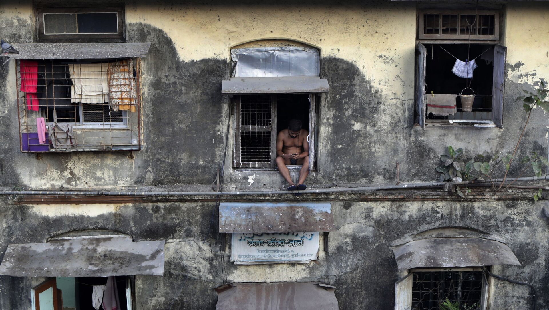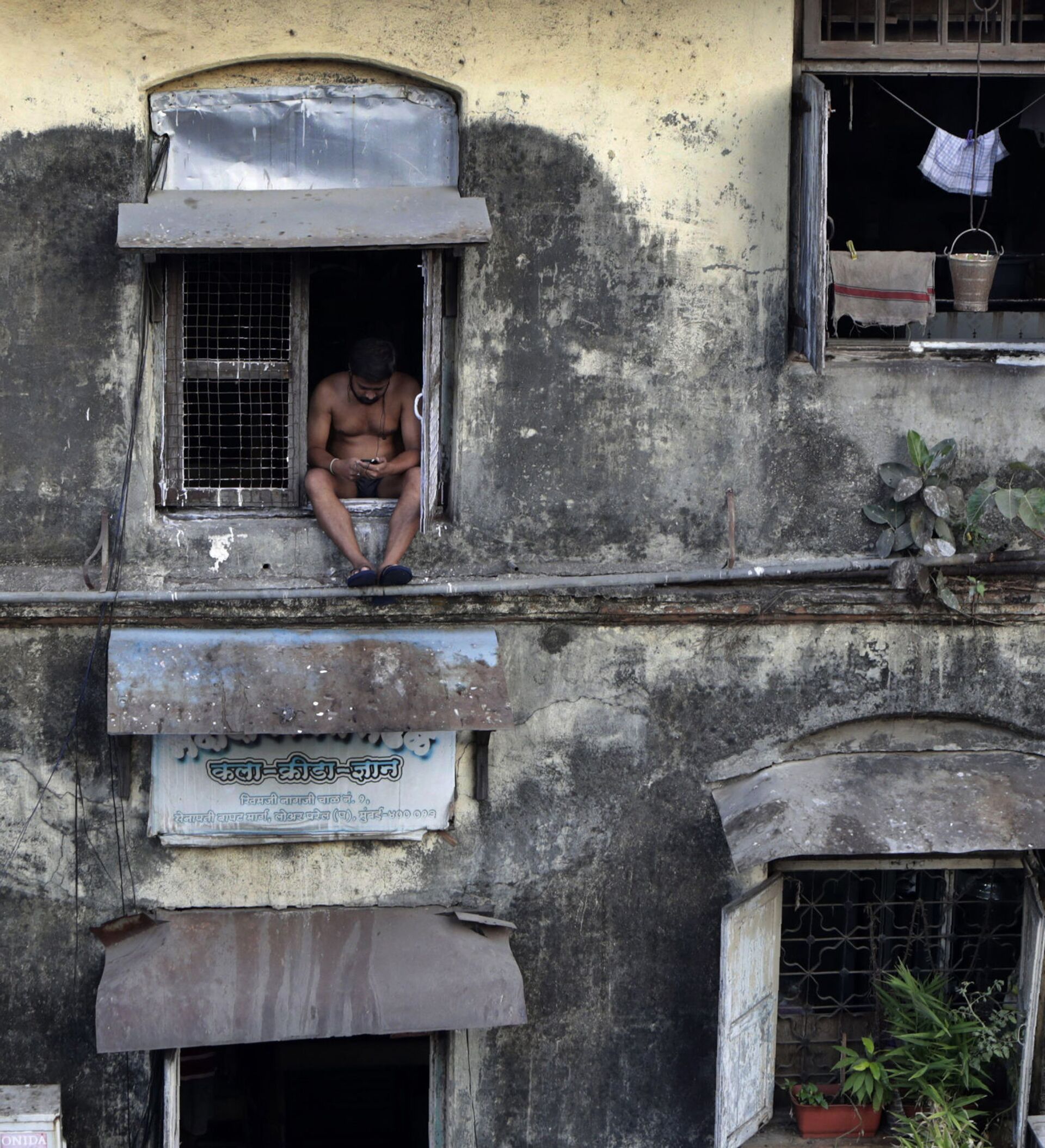 © AP Photo / Rajanish Kakadeرجل يجلس على نافذة في شقته، أثناء الإغلاق التام لمنع انتشار الفيروس التاجي "كورونا" الجديد، في منطقة بارل في مومباي، الهند 5 أبريل 2020