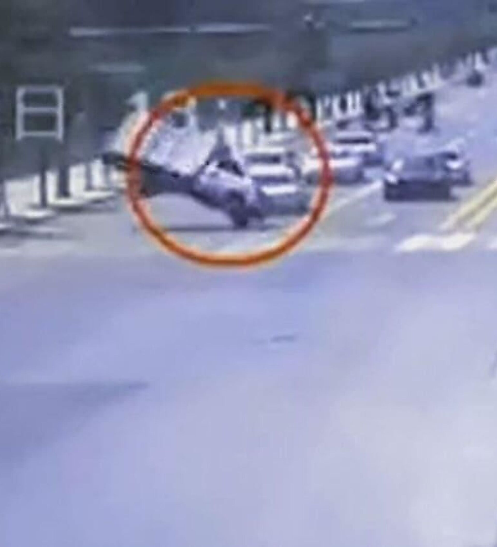 ويظهر الفيديو وقوف بعض السيارات أمام إشارة المرور، ومن ثم هبت رياح قوية مفاجئة أدت إلى طيران الشاحنة ودورانها في الهواء وإصابة السيارة التي خلفها.