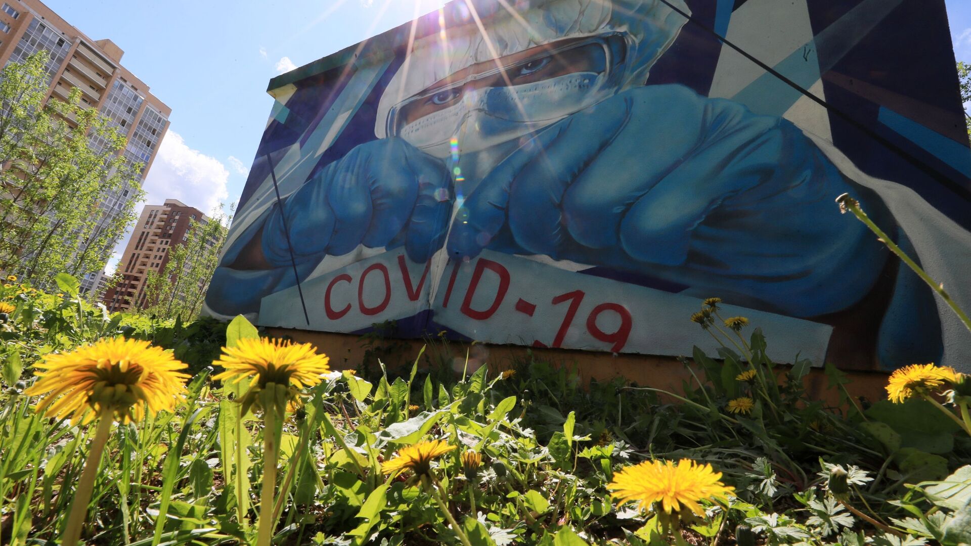 رسم غرافيتي لدعم الأطباء في مكافحة المرض الفيروس كوفيد -19، الذي يسببه فيروس كورونا، للفنانين ميخائيل وسيرغي يروفيف على أحد منازل مدينة كراسنوغورسك بضواحي موسكو - سبوتنيك عربي