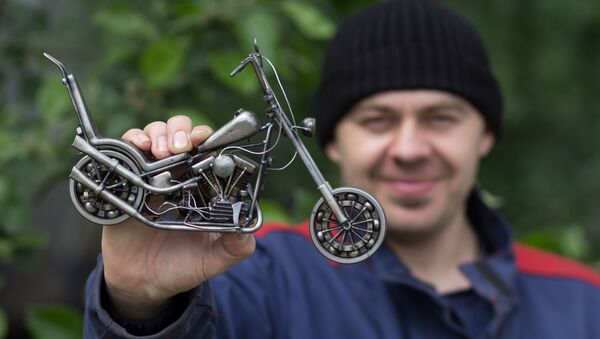 الحرفي الروسي ستانيسلاف تشيرنوفاسيلينكو يعرض نسخ مصغرة من الدراجة النارية المشهورة من طراز "هارلي ديفيدسون" في مدينة تيومين الروسية