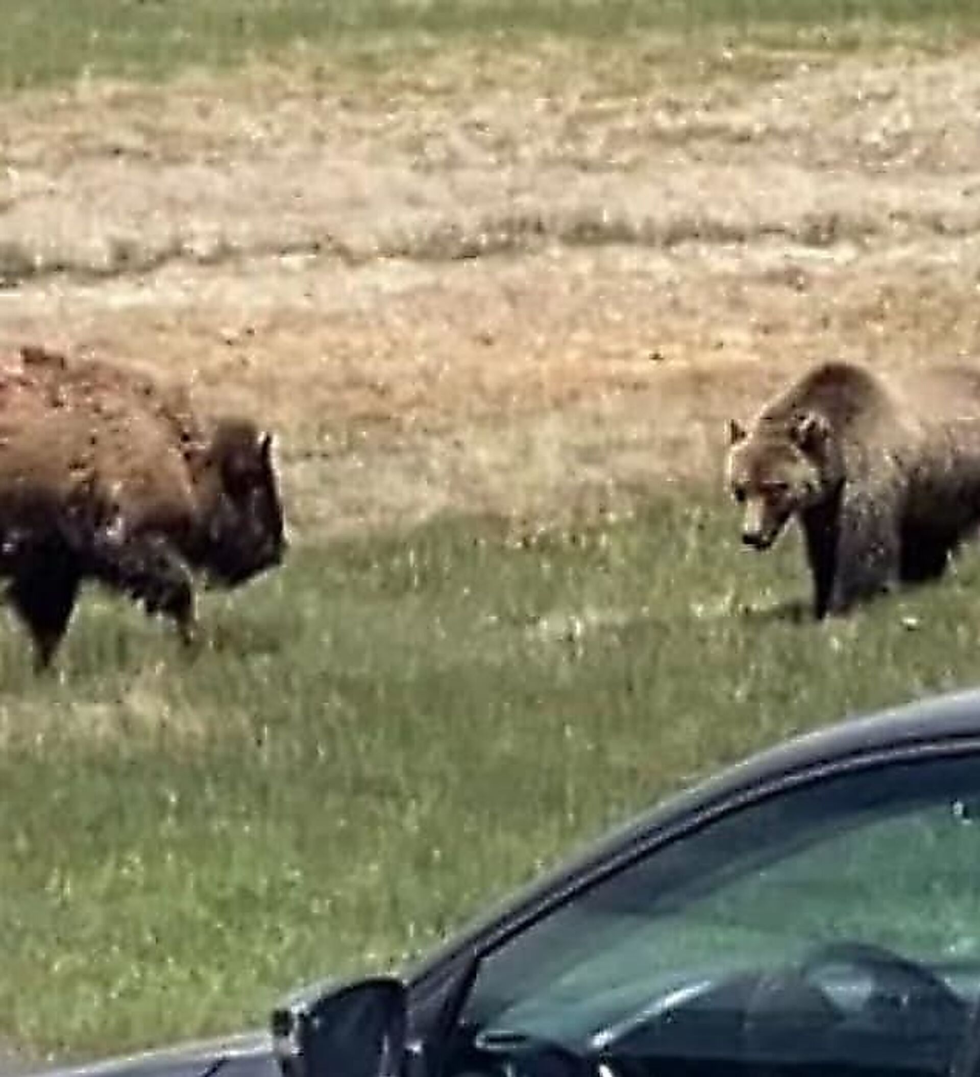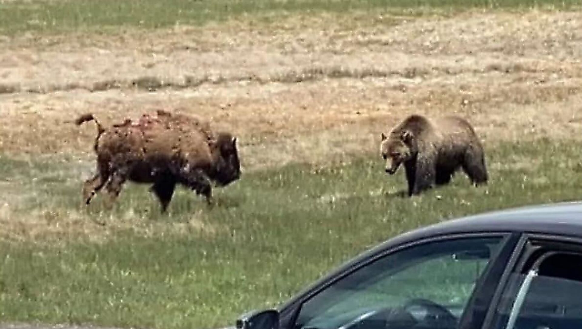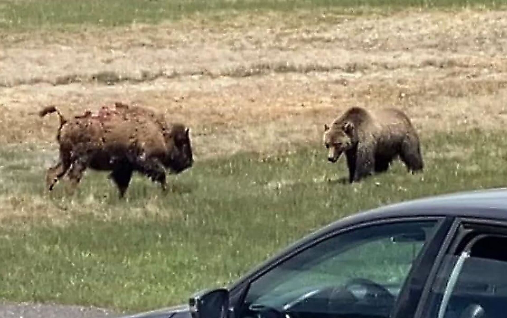 تداول رواد وسائل التواصل الاجتماعي فيديو يرصد معركة تحبس الأنفاس بين دب ضخم وثور أمريكي في حديقة يلوستون الوطنية في أمريكيا.