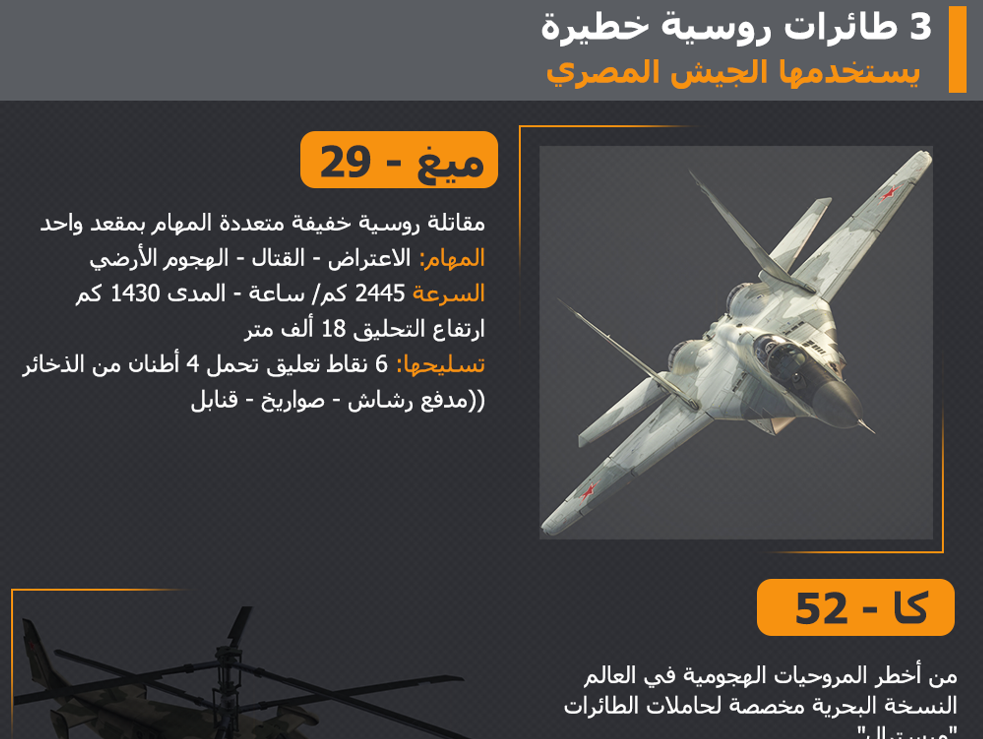 12:47 GMT 22.06.2020 (تم التحديث: 12:48 GMT 22.06.2020) ظهرت 3 طائرات روسية خطيرة تابعة للجيش المصري، خلال تفقد الرئيس المصري عبد الفتاح السيسي للوحدات المقاتلة للقوات الجوية في المنطقة الغربية العسكرية، التي تحدث فيها عن قوة مصر العسكرية.
