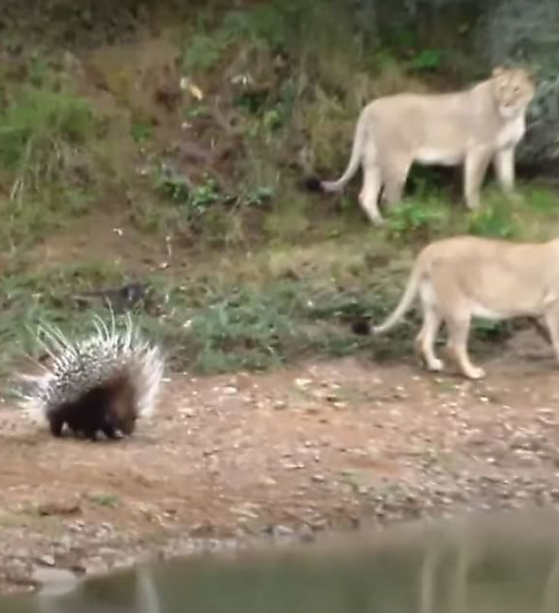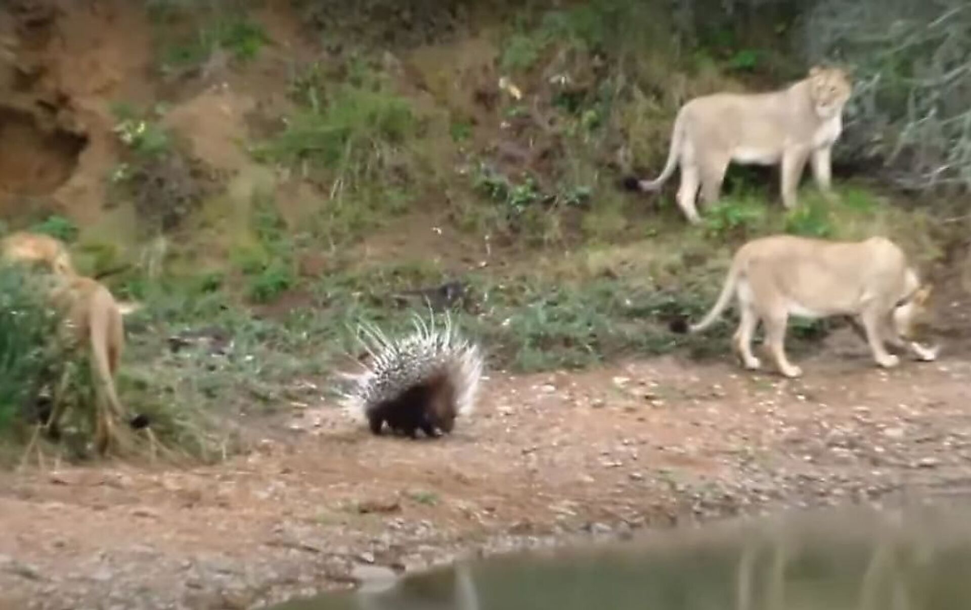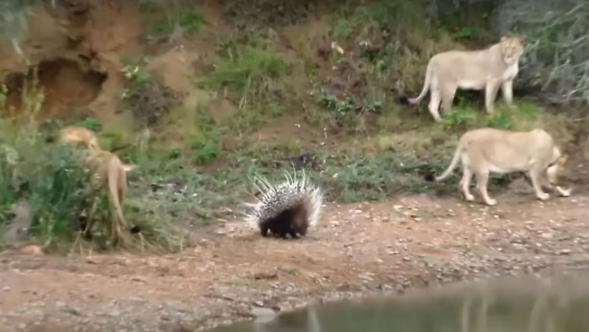 ويظهر الفيديو محاولة بعض الأسود دراسة الحيوان الغريب والذي يمكن أن يكون فريسة محتملة لهم، ولكن أبدى حيوان النيص مقاومة قوية وأظهر شجاعة منقطعة النظير، حيث كان بنفسه يبادر للهجوم.