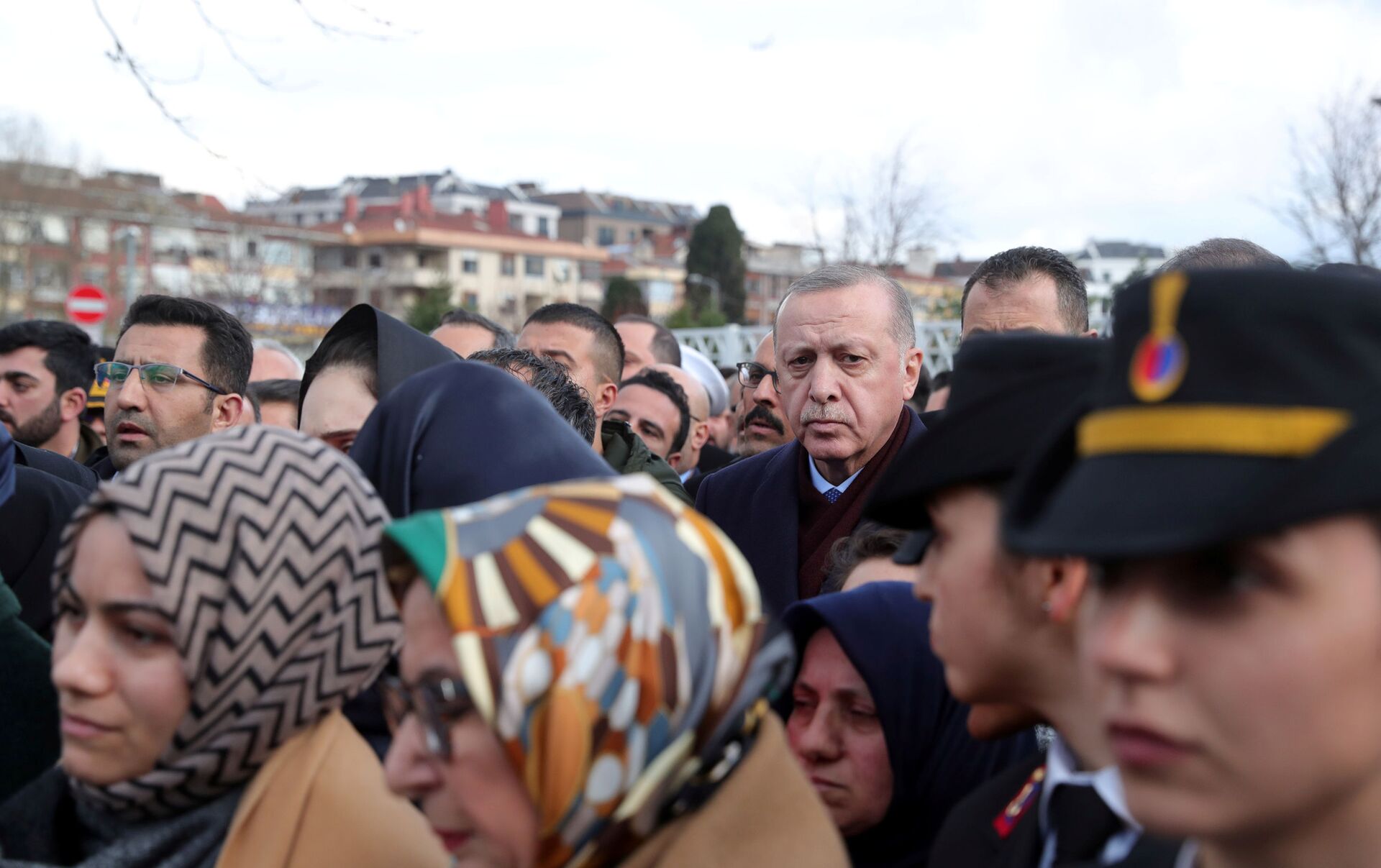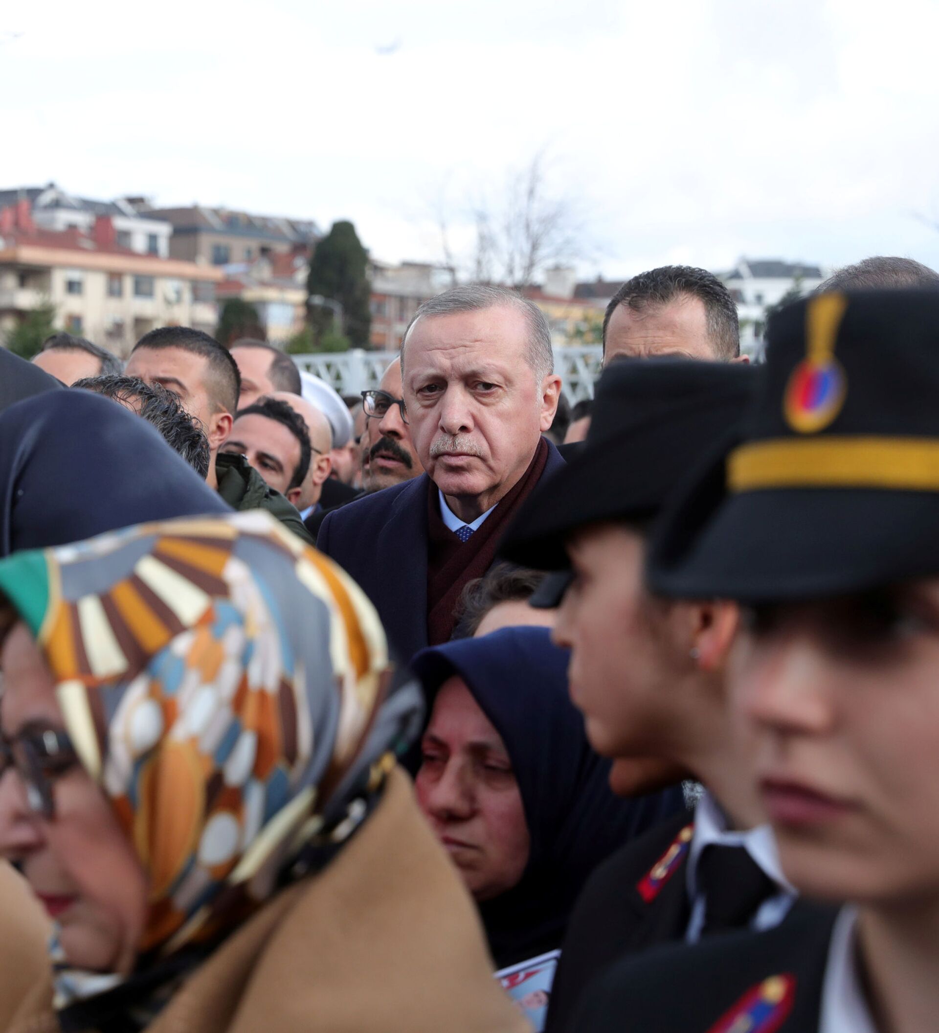 © REUTERS / PRESIDENTIAL PRESS OFFICEالرئيس التركي رجب طيب أردوغان خلال تشييع جثامين الجنود الأتراك الذين قتلوا في سوريا