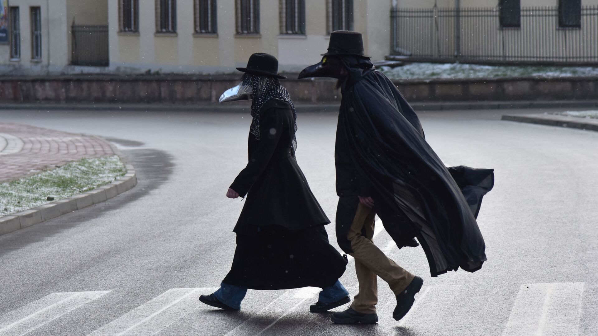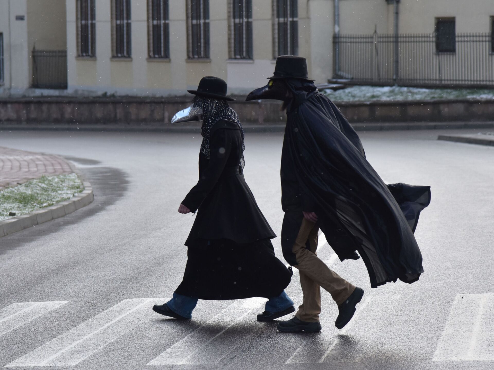 © Sputnik . Stringer / الانتقال إلى بنك الصورأشخاص يرتدون أقنعة "طبيب الطاعون" في لفيف وسط تفشي مرض فيروس التاجي كورونا، أوكرانيا 22 مارس 2020