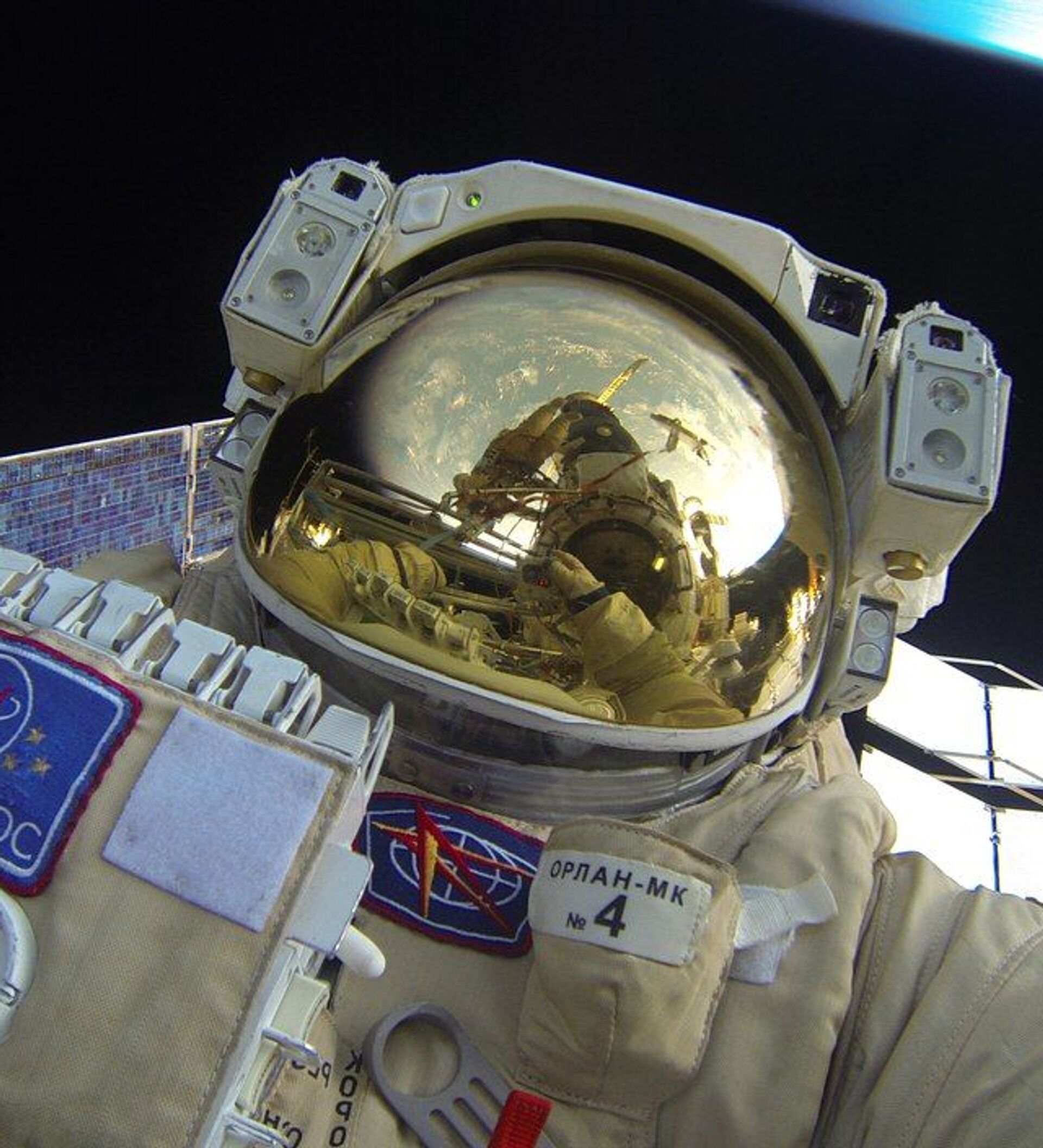 © Sputnik . Roscosmos/Yuri Malenchenko صورة سيلفي لرائد الفضاء الروسي يوري ماليتيشنكو خلال خروجه إلى الفضاء الخارجي في مهمة