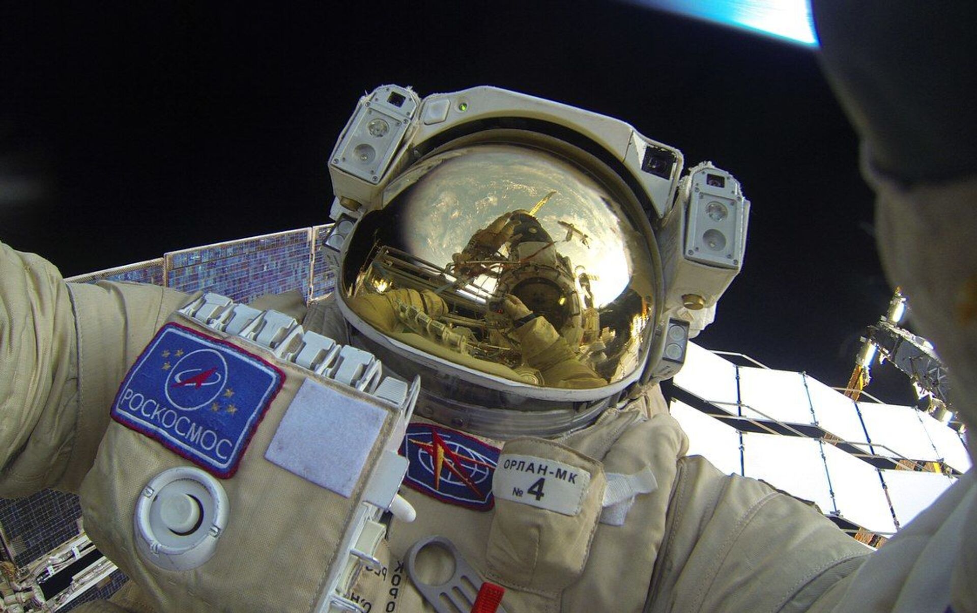 صورة سيلفي لرائد الفضاء الروسي يوري ماليتيشنكو خلال خروجه إلى الفضاء الخارجي في مهمة - سبوتنيك عربي