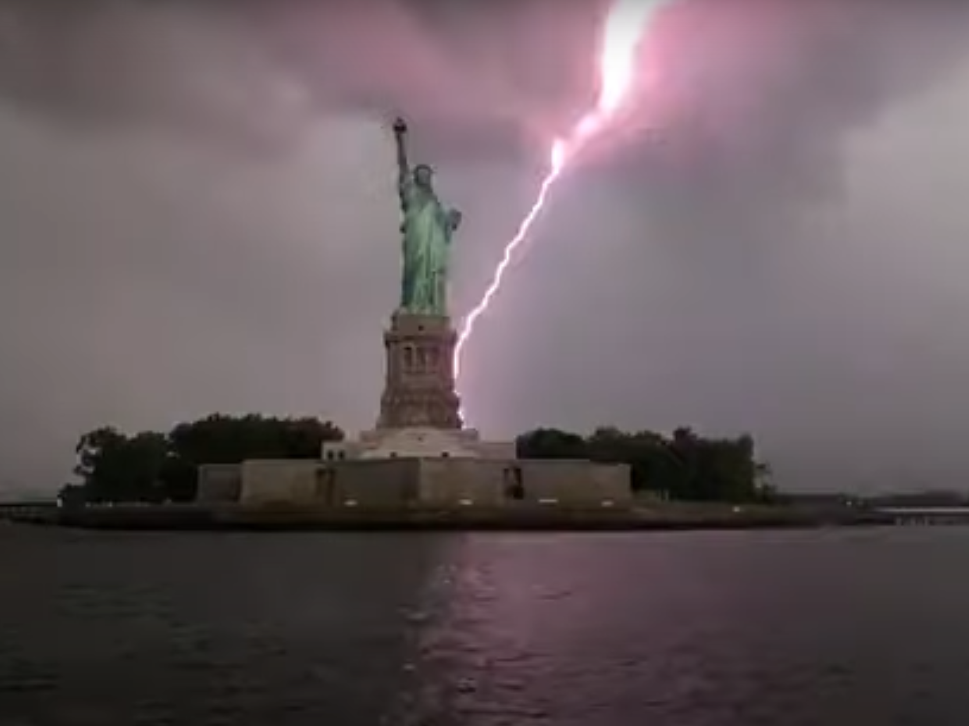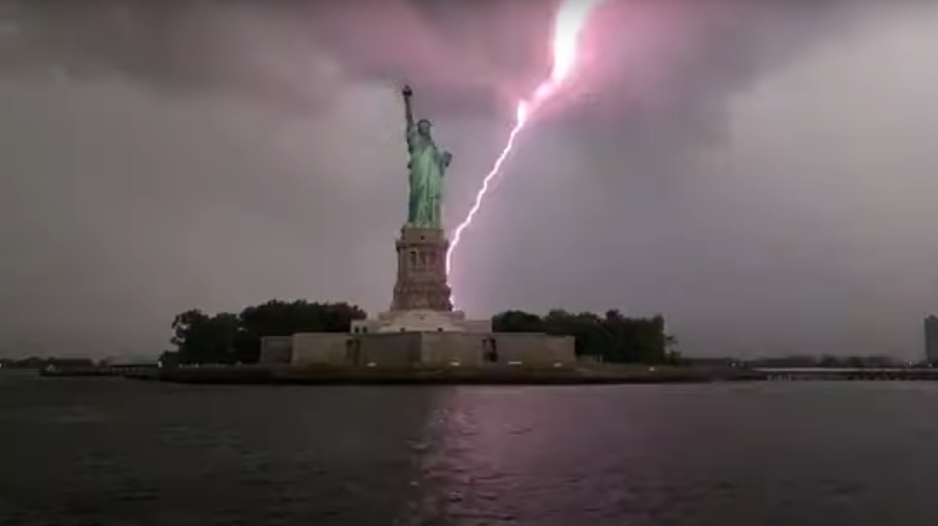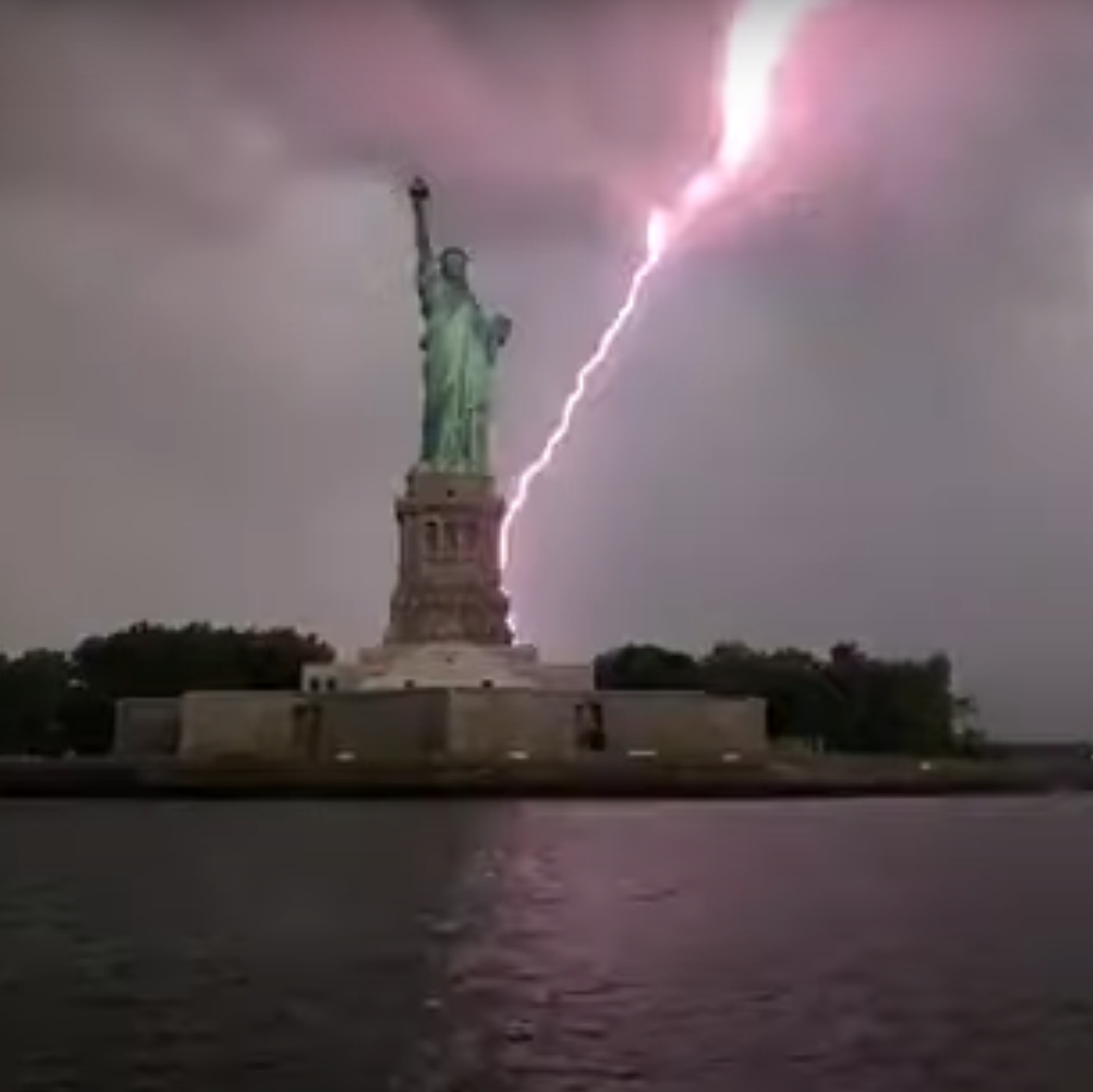 ويظهر مقطع الفيديو الذي نشره مستخدم على "تويتر" أولا، ثم تداولته المواقع الأخرى بشكل واسع، غيوم رمادية داكنة معلقة فوق التمثال، مع اختفاء برق ضخم خلف قاعدته.