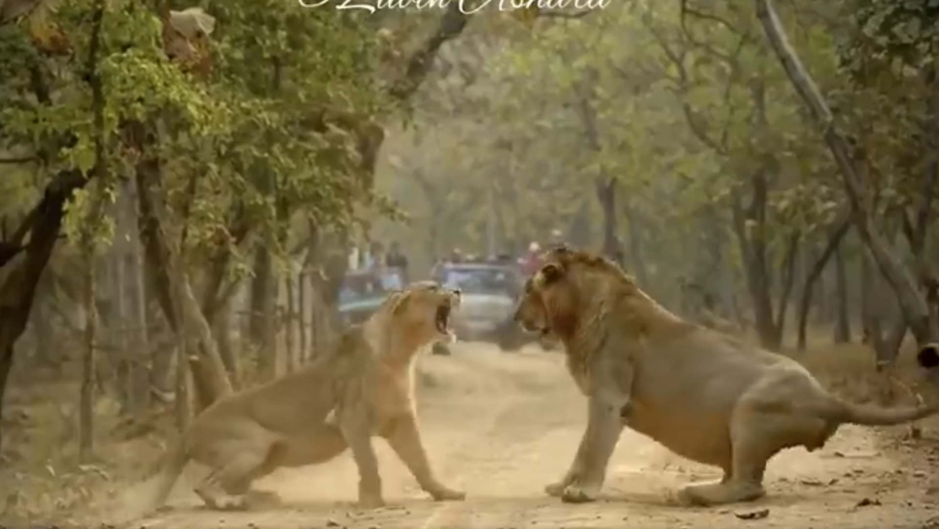 ويظهر مقطع الفيديو مشاهد مذهلة لقتال بين عمالقة الغابة، حيث تصرخ لبؤة بشدة على أسد وتحاول مهاجمته.