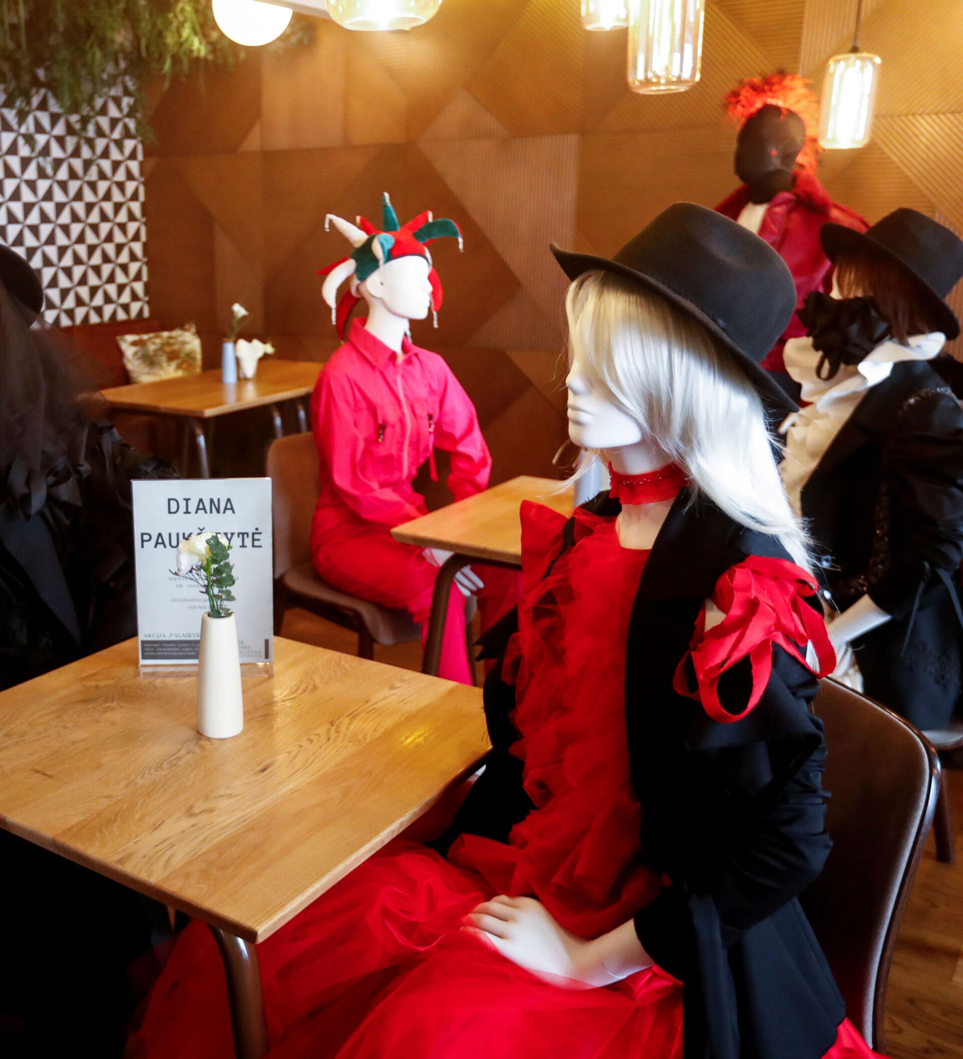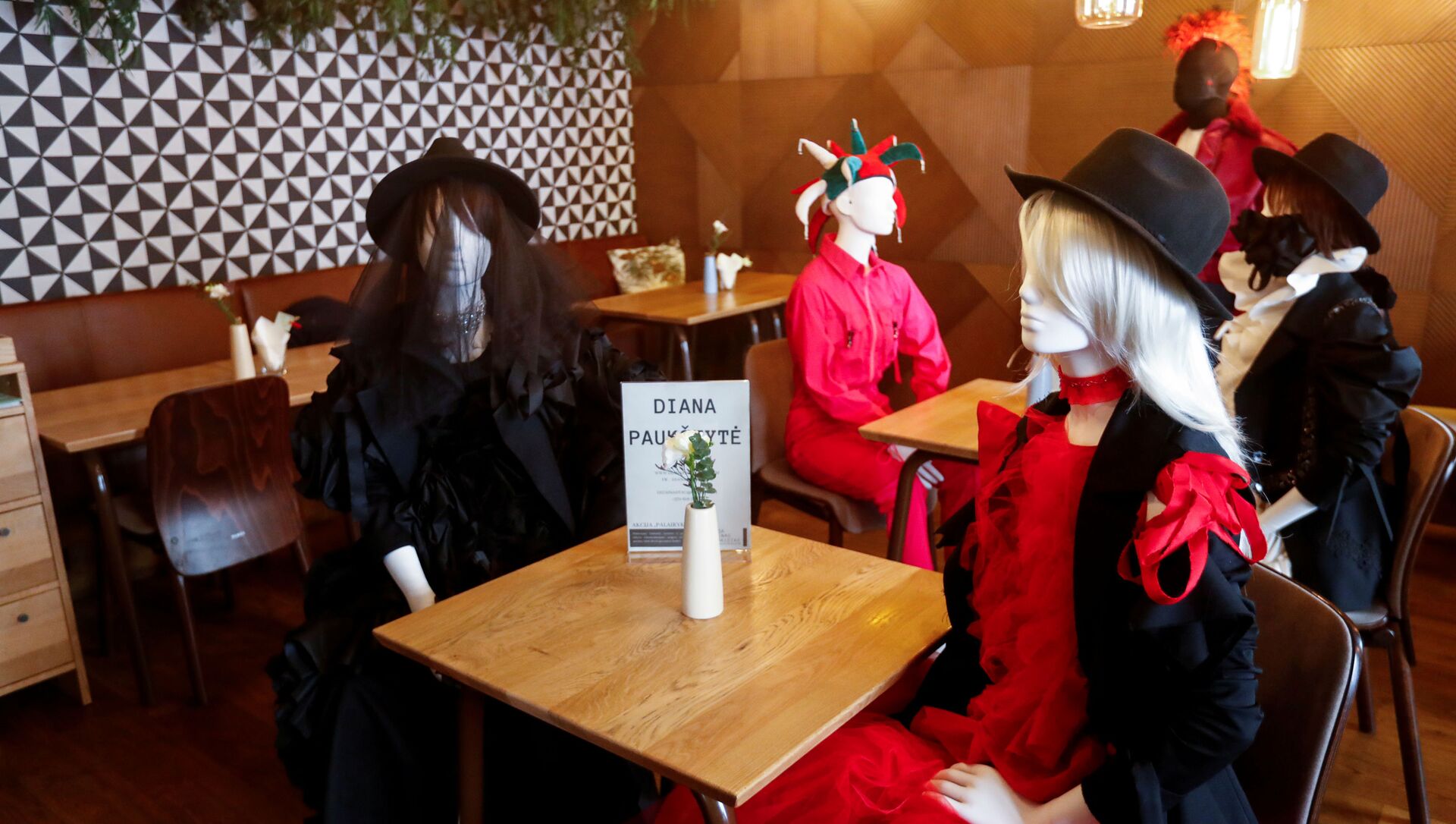 وفي الحقيقة تلك الزبونات الـ16 هن دمى تم وضعها على كراسي الطاولات لمنع الزبائن الحقيقيين من الاقتراب من بعضهم البعض.