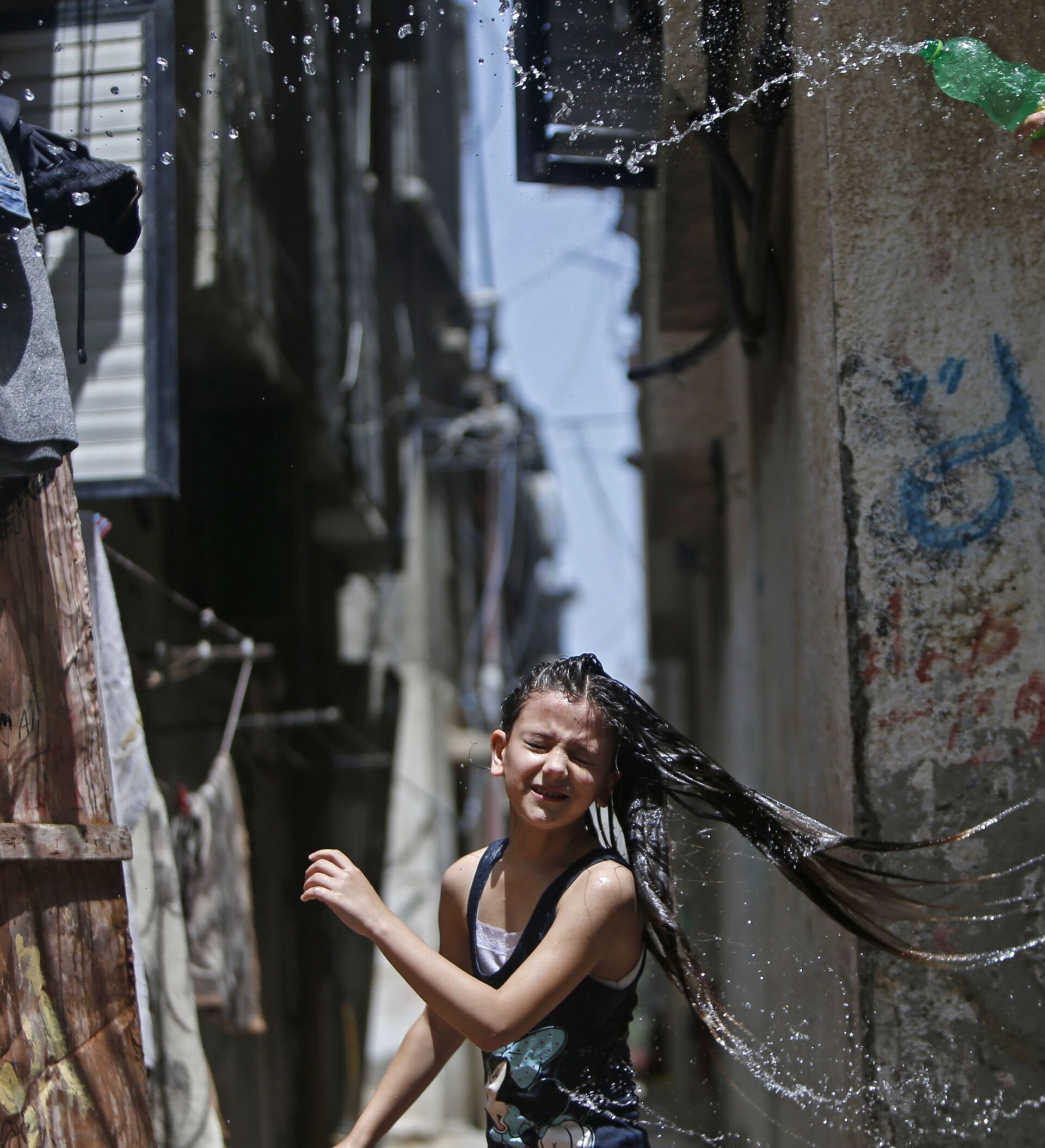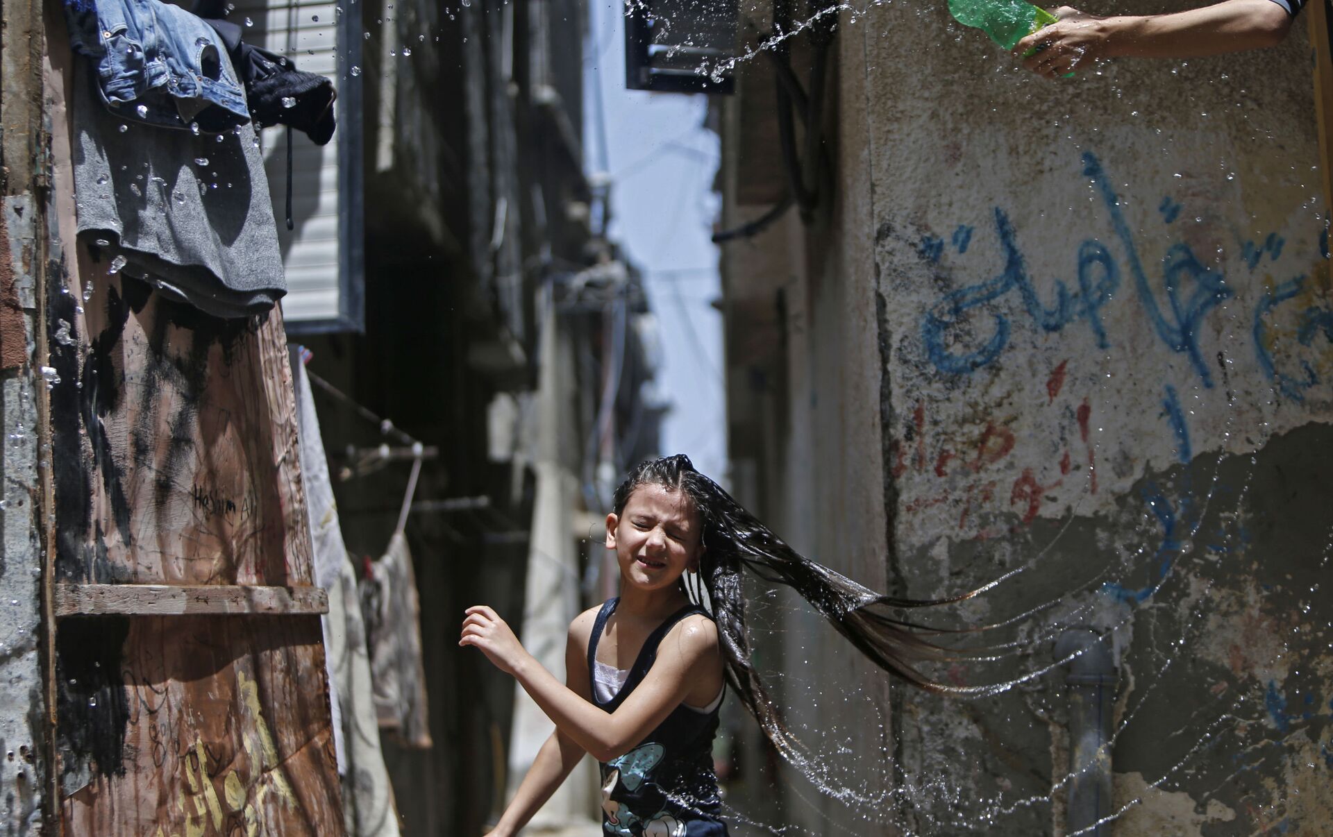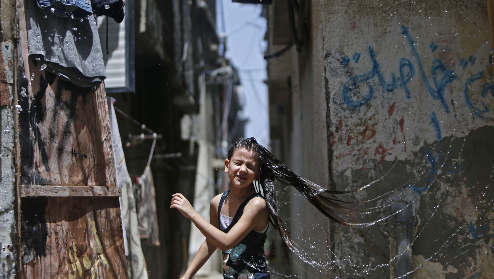 صبي يسكب الماء على رأسه طفلة لتخفيف الحر عنها، خلال موجة جو حار في مخيم البريج للاجئين وسط قطاع غزة، وسط جائحة  كوفيد-19 ، 19 مايو 2020. يذكر أن موجة حر شديد ضربت العديد من دول منطقة الشرق الأوسط. - سبوتنيك عربي