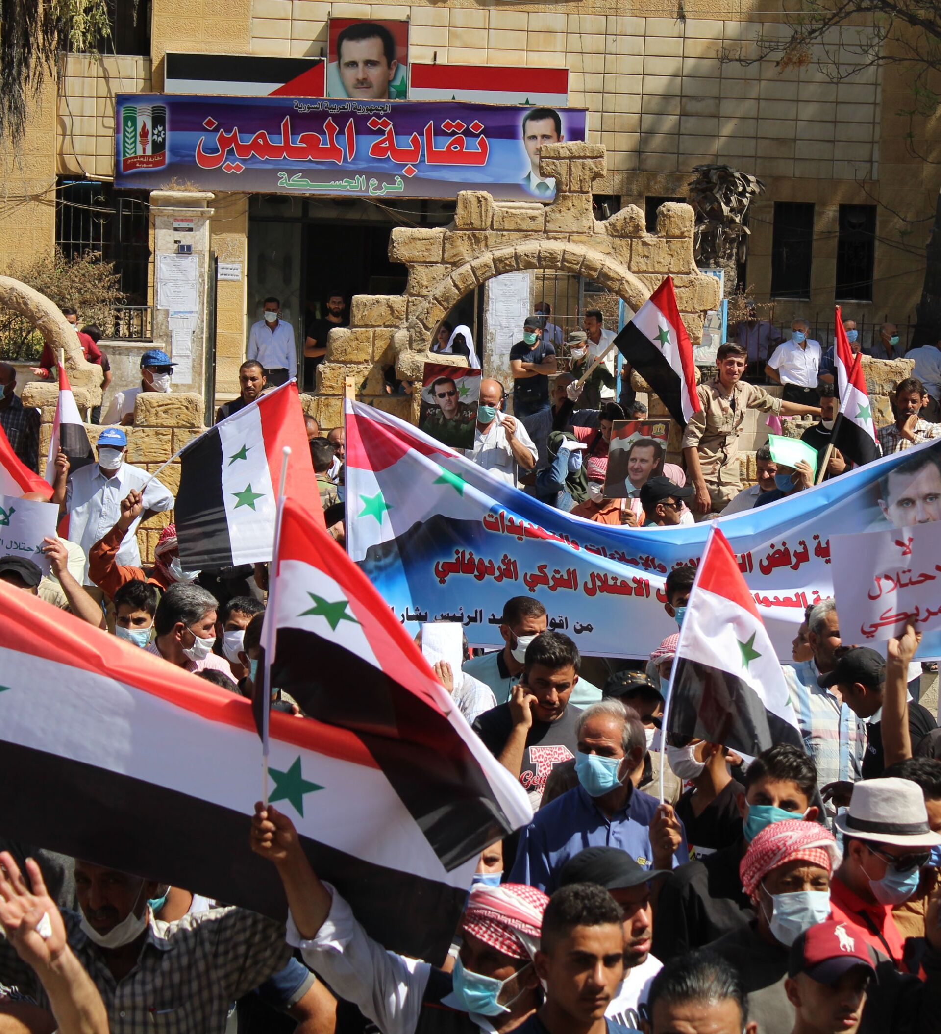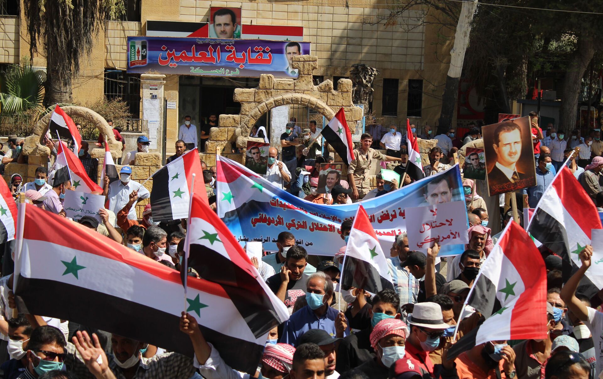 تظاهر المئات من سكان مدينتي الحسكة والقامشلي في محافظة الحسكة السورية رفضا للتواجد الأمريكي والاعتداء على حاجز للجيش العربي السوري في ريف مدينة القامشلي يوم أمس الاثنين وقاموا بحرق الأعلام الأمريكية.