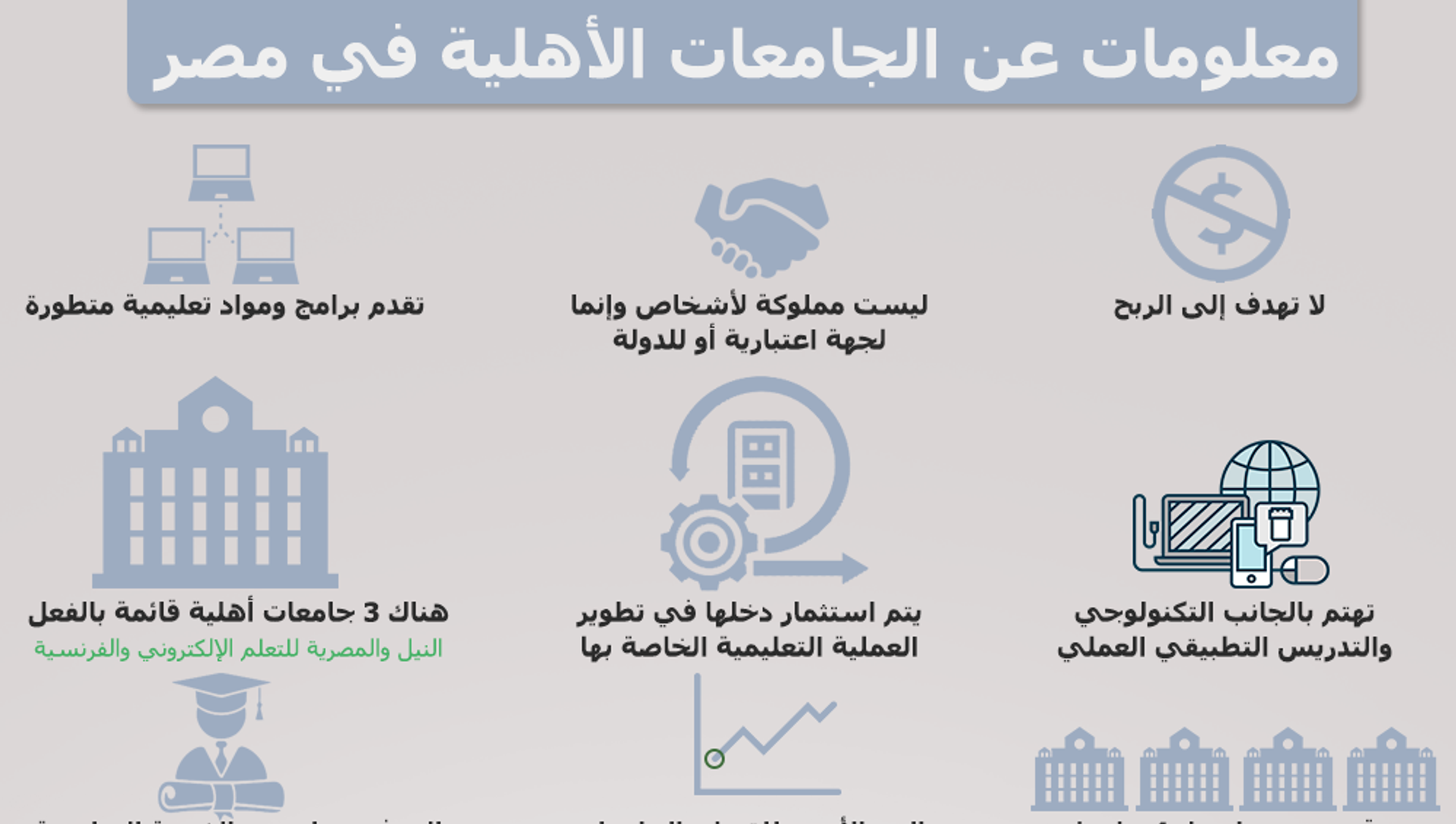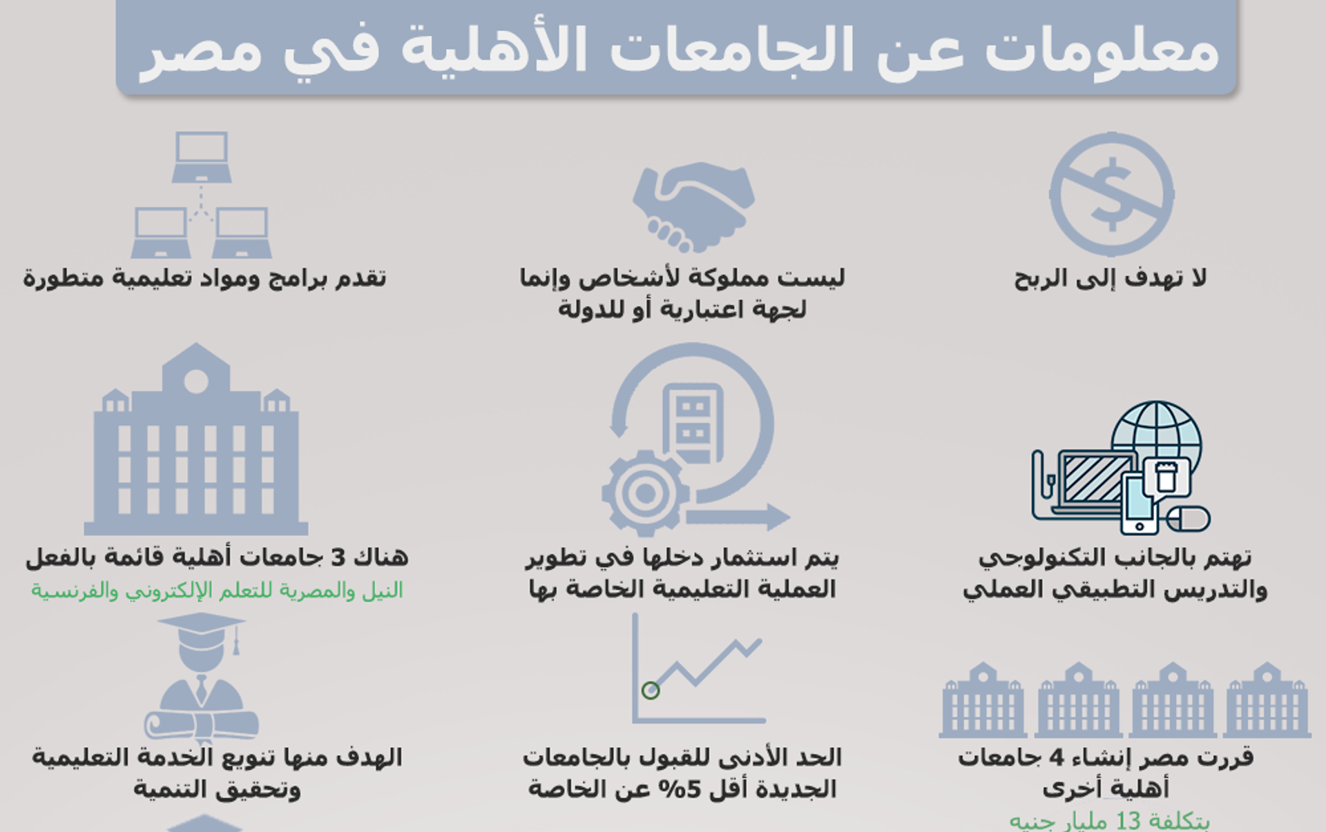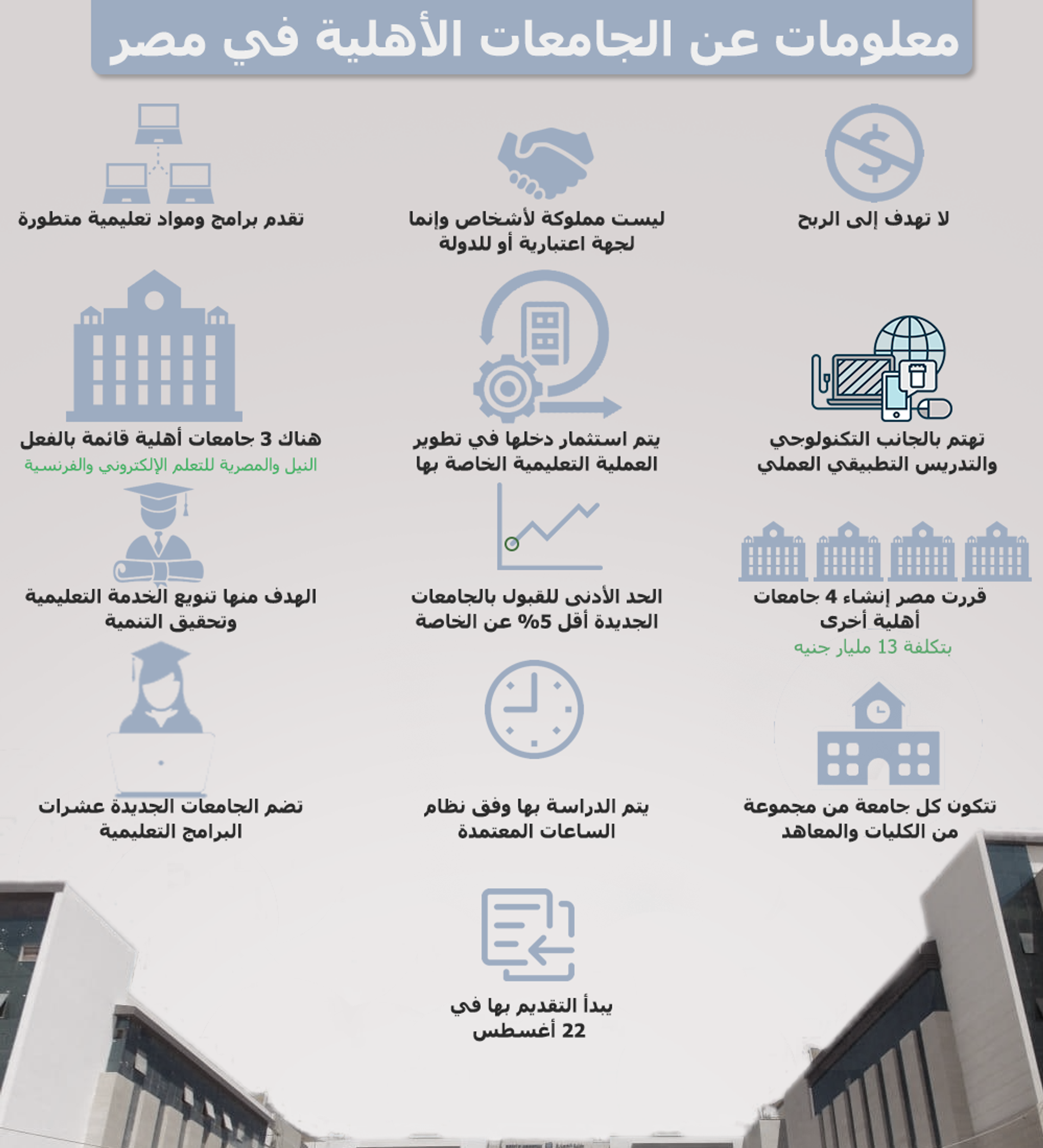 قرار إنشاء الجامعات الأهلية الأربع في مصر والتي تضم جامعات "الجلالة، والملك سلمان الدولية، والعلمين الدولية، والمنصورة الجديدة"، يهدف لضمان تنوع مستويات الخدمة بما يناسب كافة أفراد المجتمع، وتحقيق التنمية في المناطق العمرانية الجديدة.