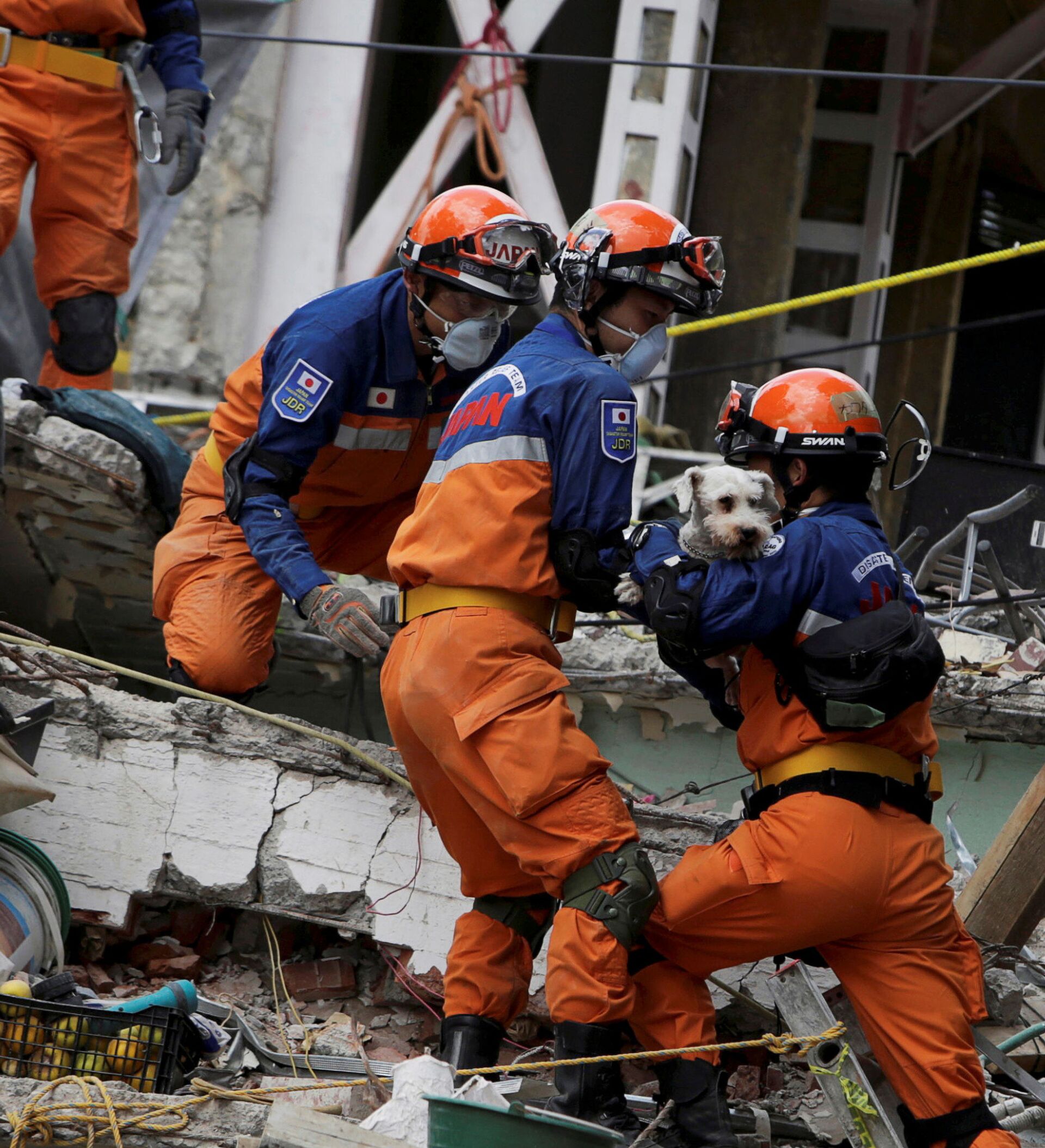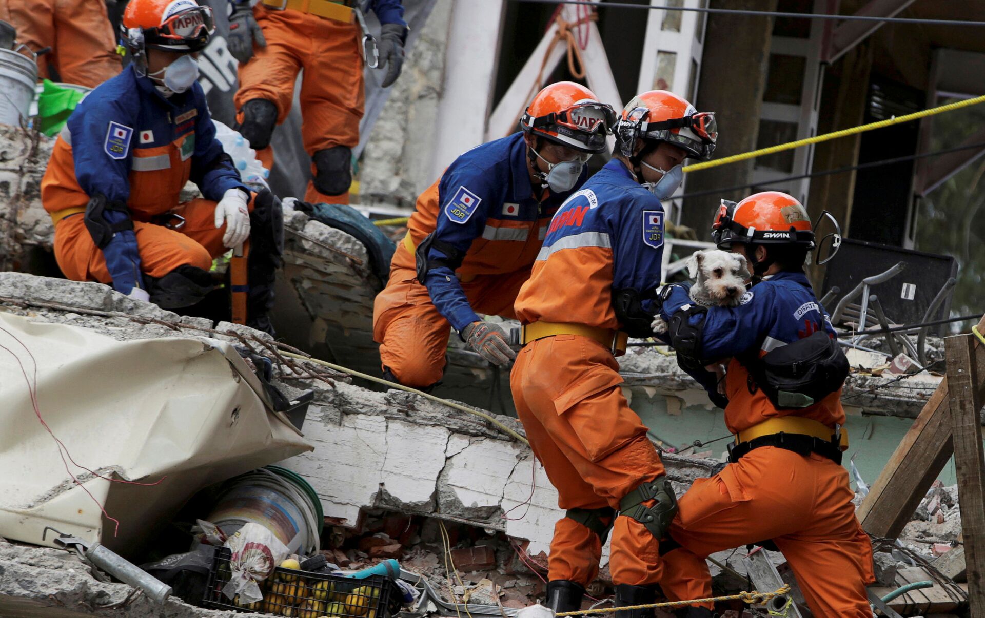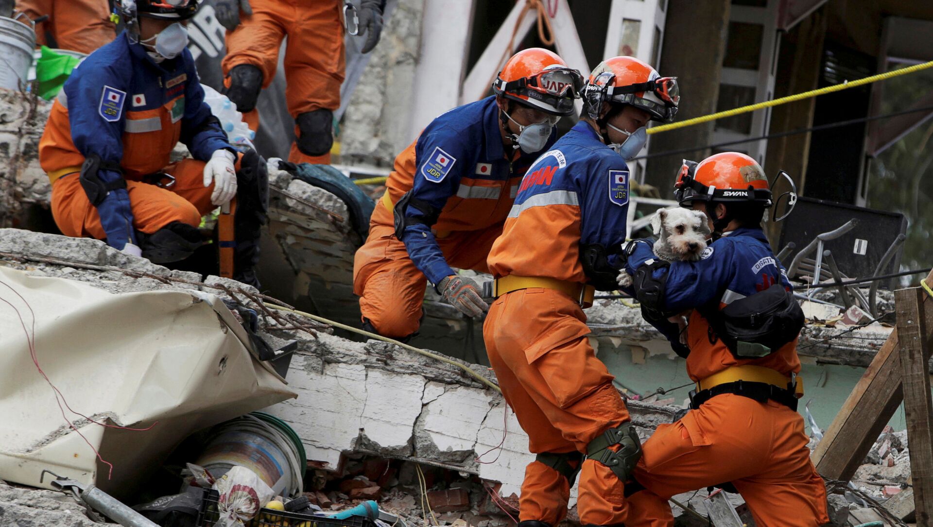 © REUTERS / Jose Luis Gonzalez أحد أفراد فريق الإنقاذ الياباني يحمل كلبا وجده تحت الأنقاض ع، بعد وقوع زلزال في مدينة المكسيك، المكسيك 24 سبتمبر/ أيلول 2017
