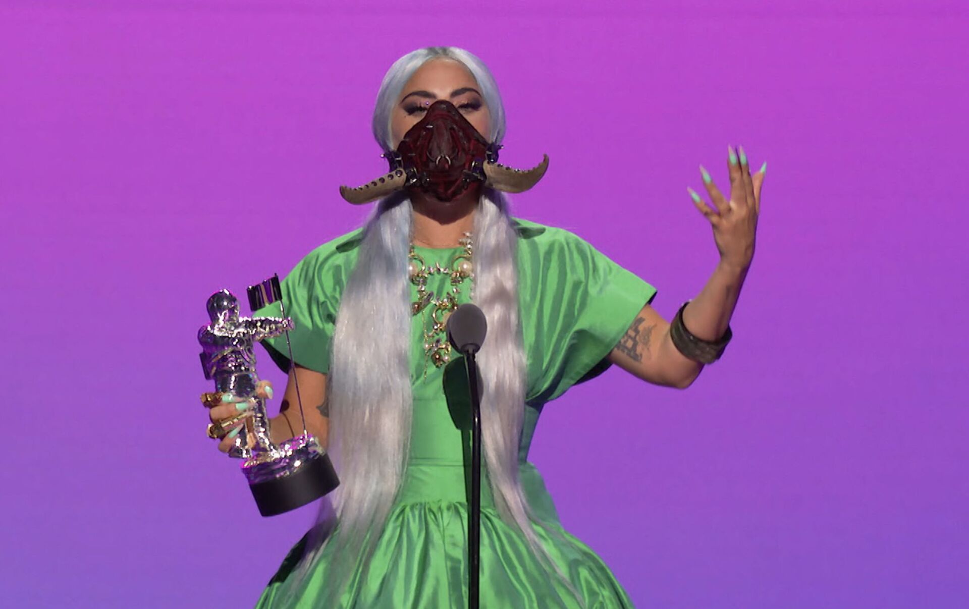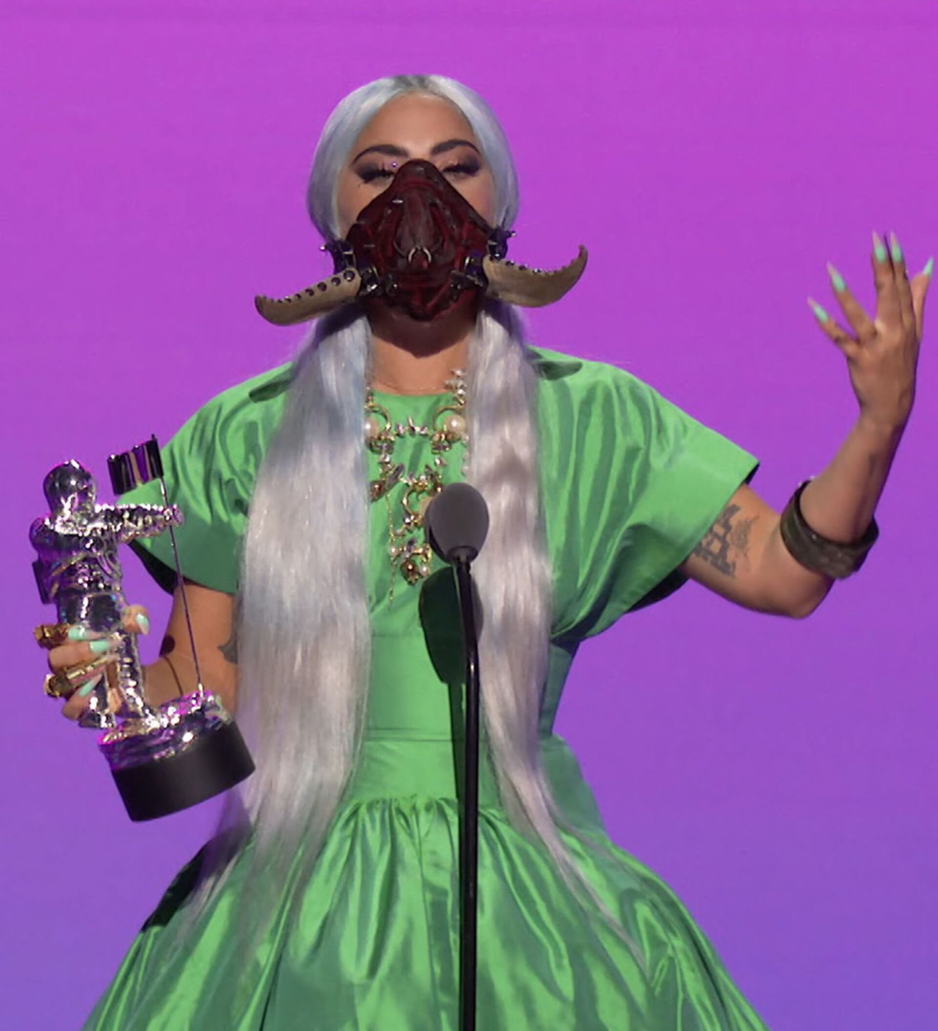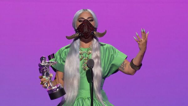 المغنية والممثلة الأمريكية ليدي غاغا خلال تسلمها جائزة "أفضل أغنية لعام 2020" (عن أغنية "رين أون مي")، في حفل توزيع جوائز "إم تي في" الموسيقية لعام 2020، نيويورك 30 أغسطس 2020 وتظهر المغنية مرتدية "كمامة" مميزة، في إطار البروتوكولات الصحية المتبعة في الأماكن العامة بسبب تفشي فيرويس كورونا في الولايات المتحدة.