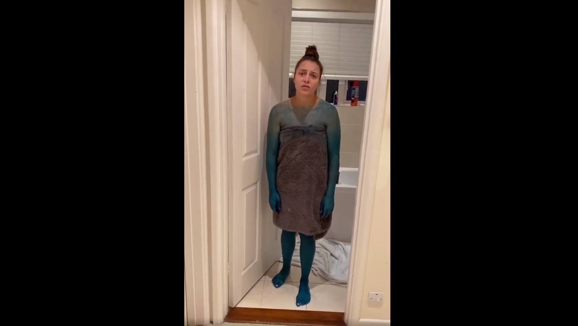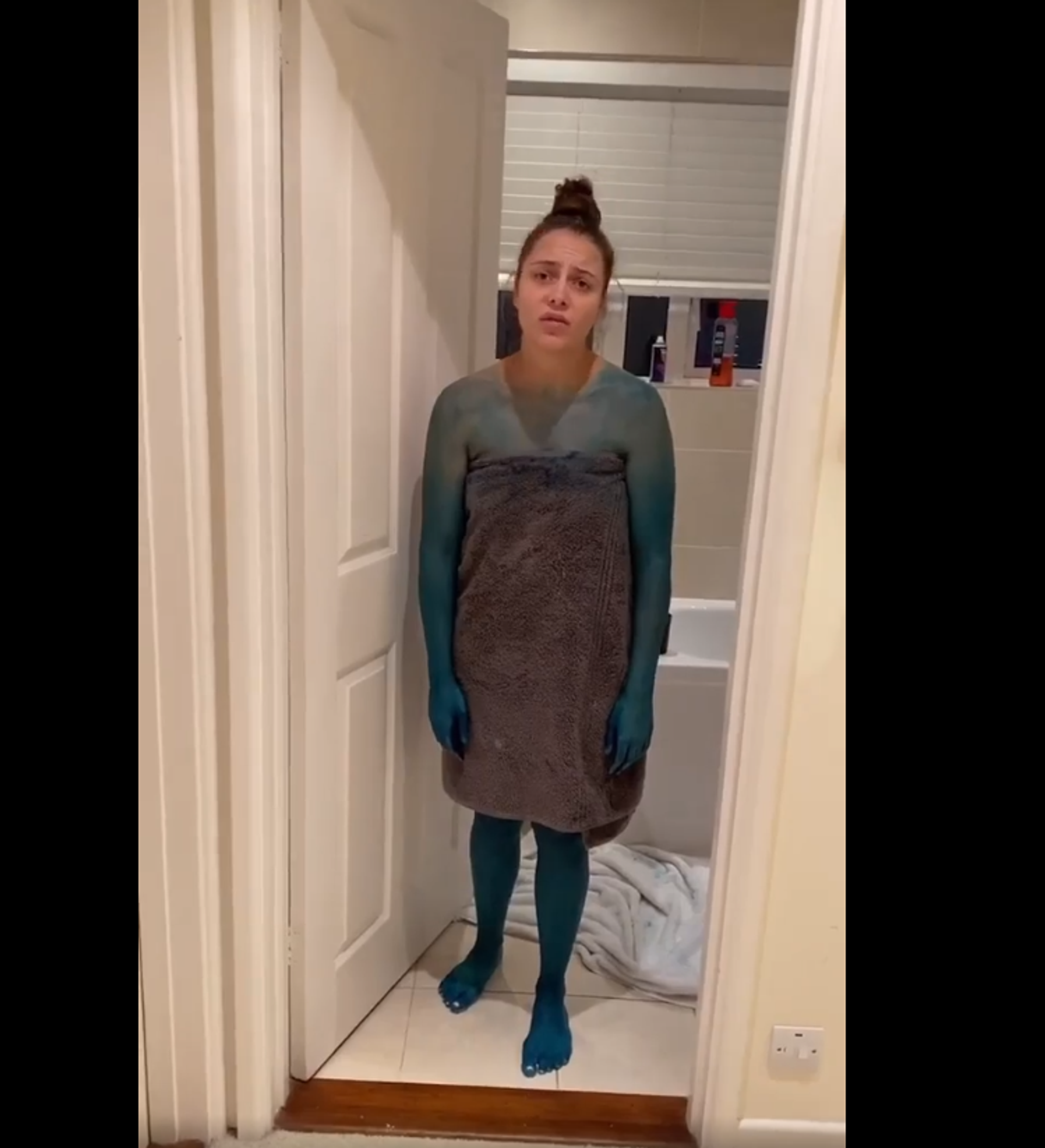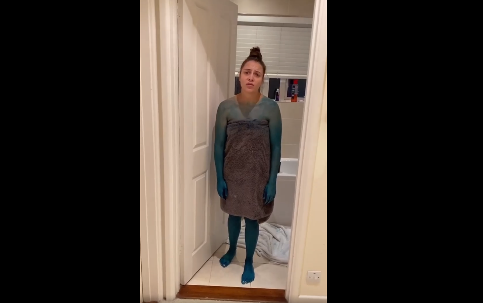 وخرجت الفتاة بعد ساعة من الحمام متفاجئة وغاضبة من النتيجة فكان جسدها ملونا بالأزرق وقد شبهها صديقها بالسنفور الغضبان.